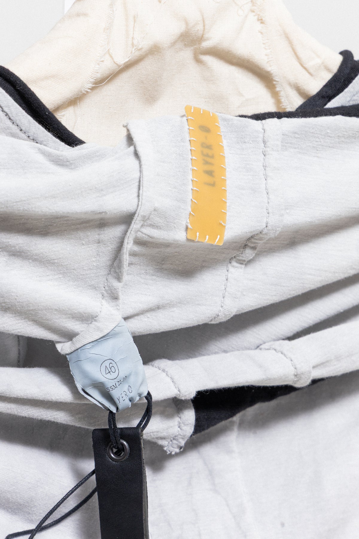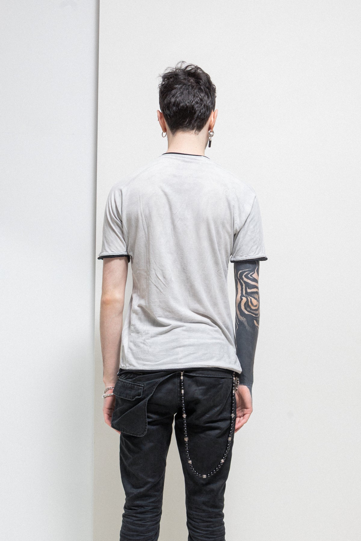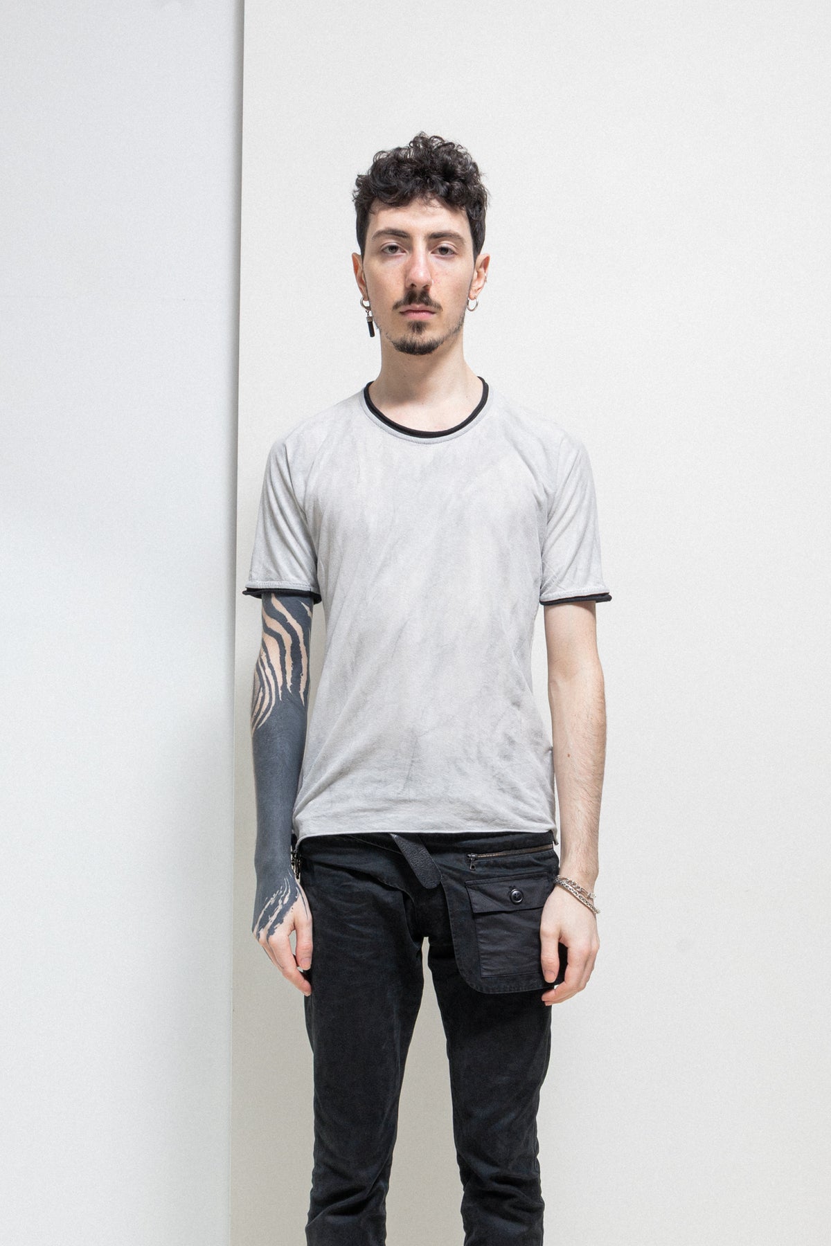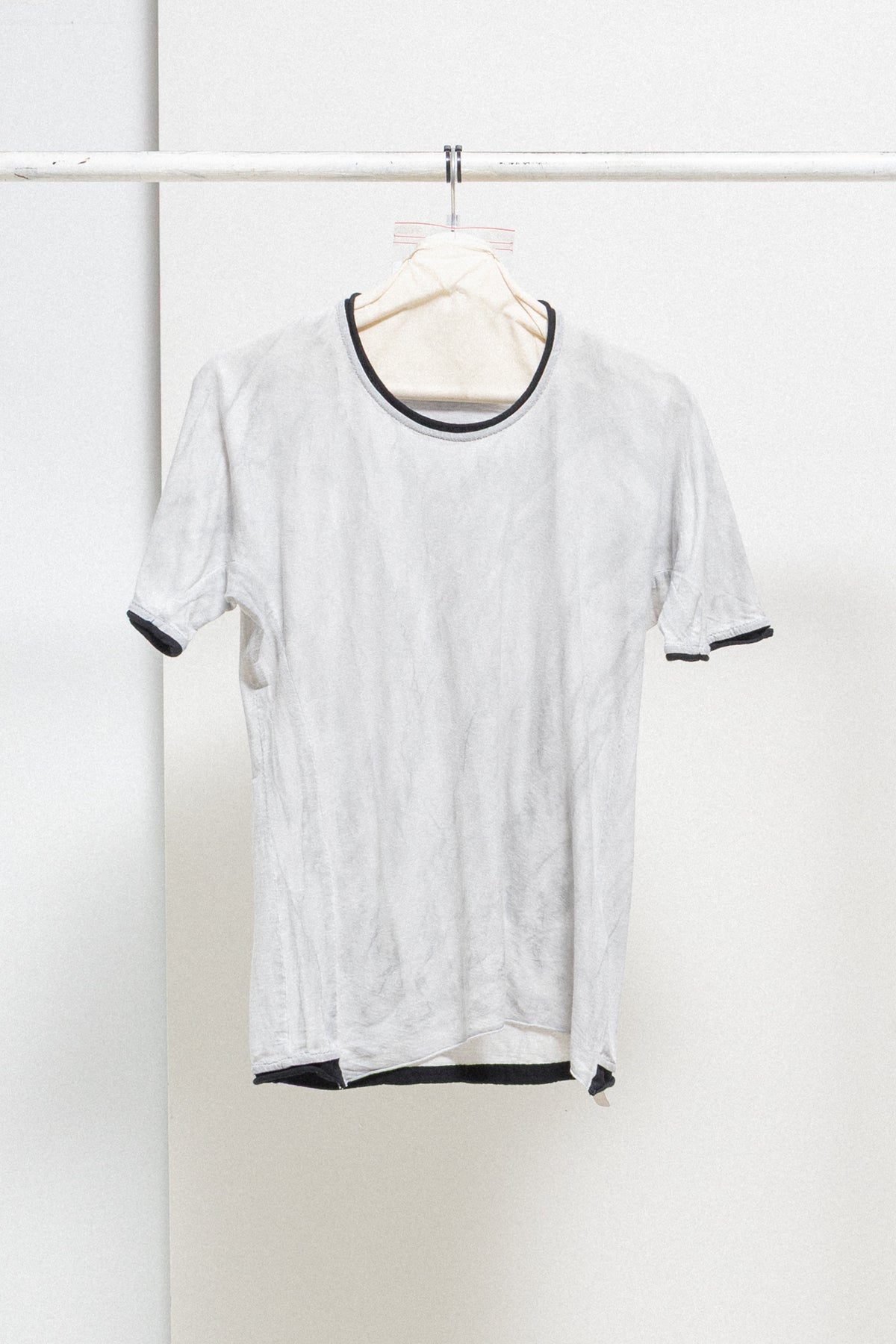 Beautiful t-shirt made of soft linen and cotton blended fabric with a washed marble effect, featuring contrasting black edges and a round neckline. Front raw edge.