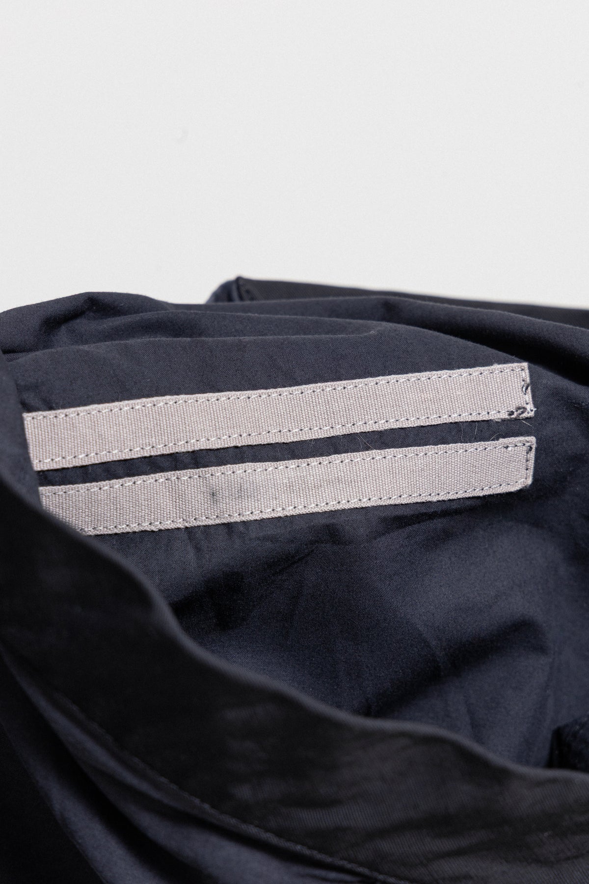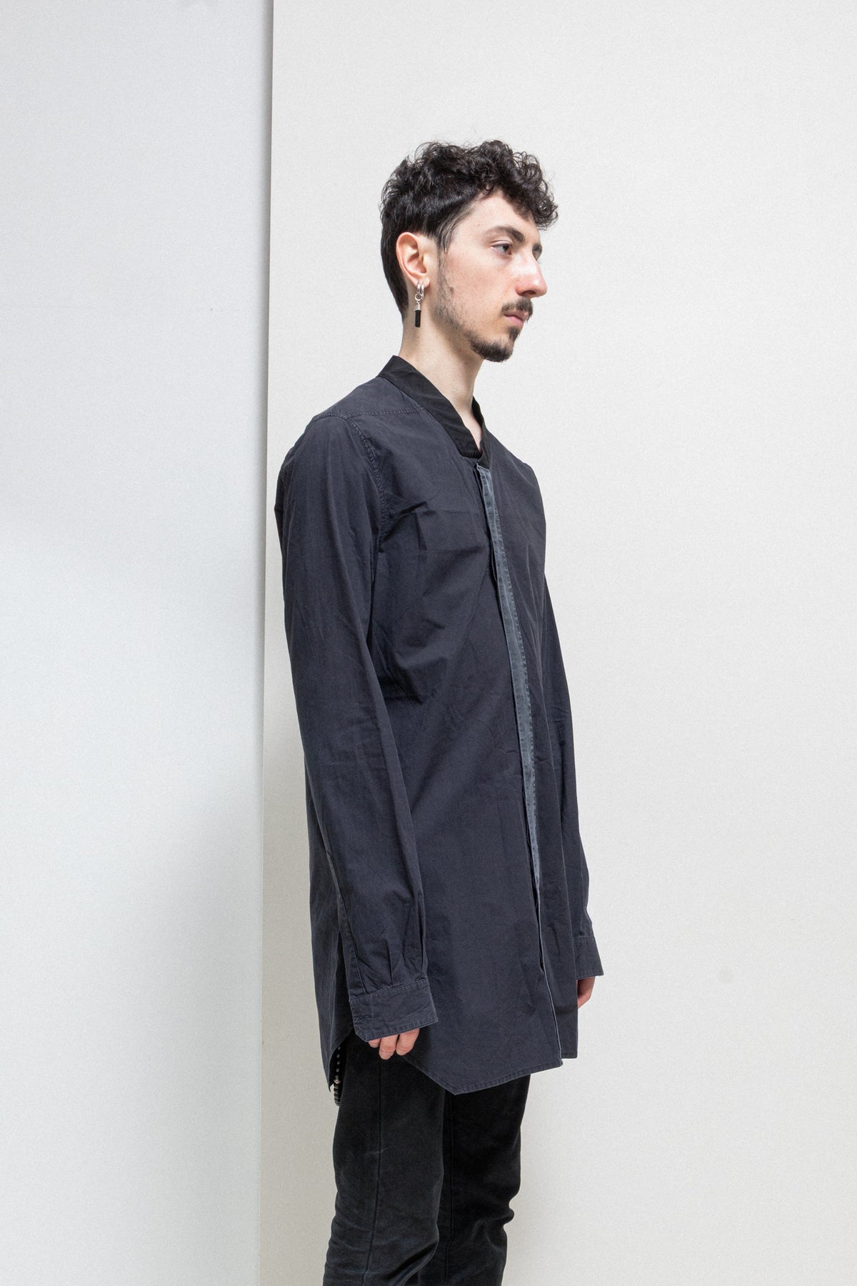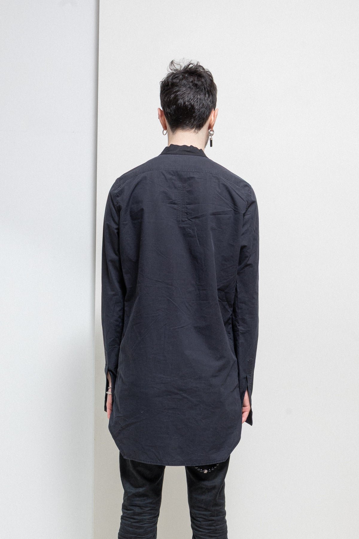 Amazing black shirt made of light cotton fabric, featuring a V shaped crossed collar and a front closure with eight invisible buttons. Cuff splits with one button. Elongated body length.