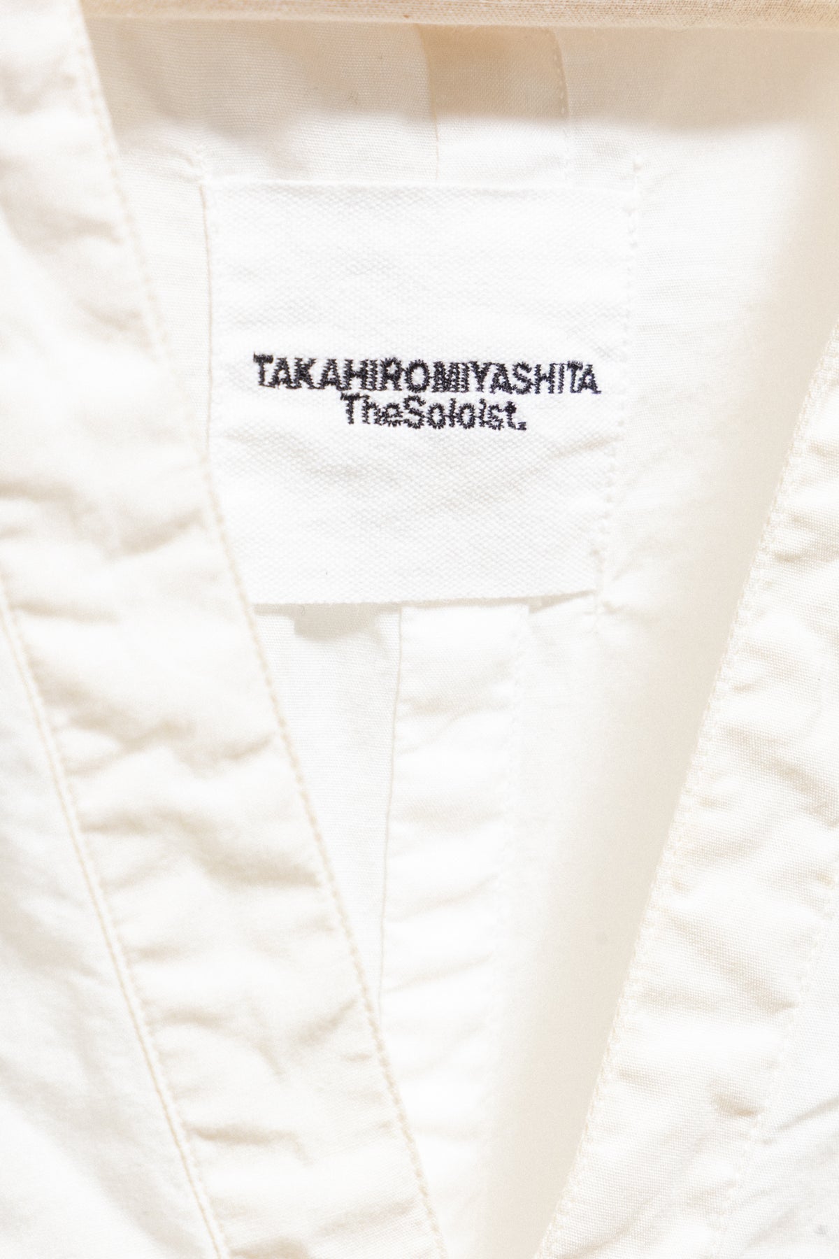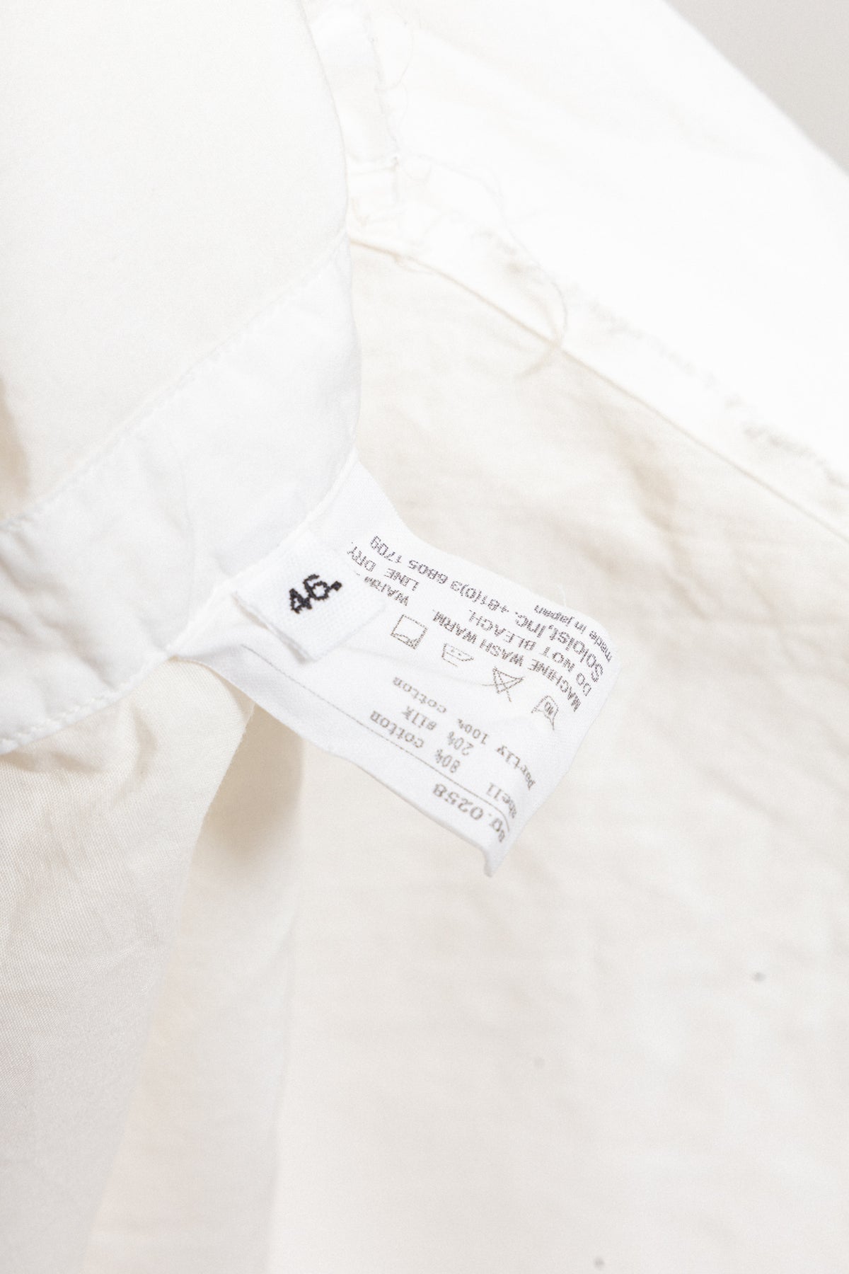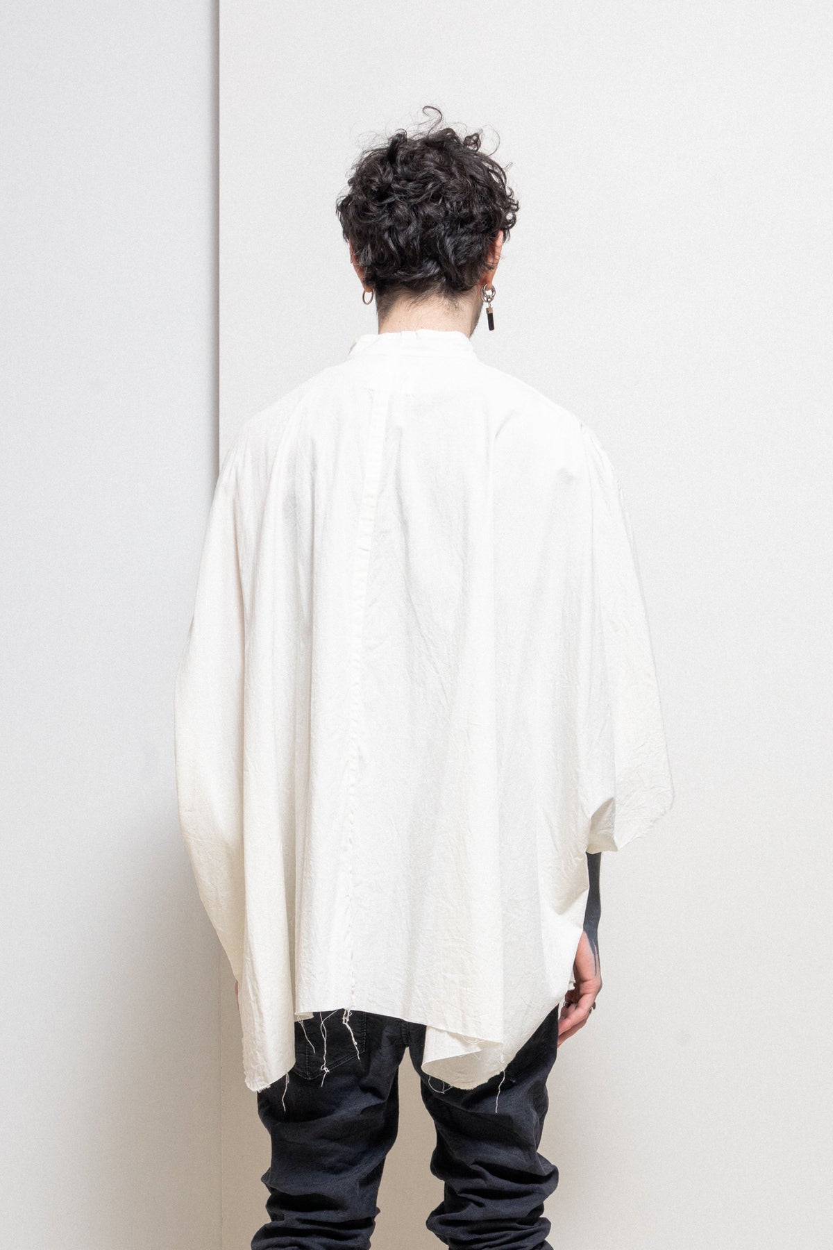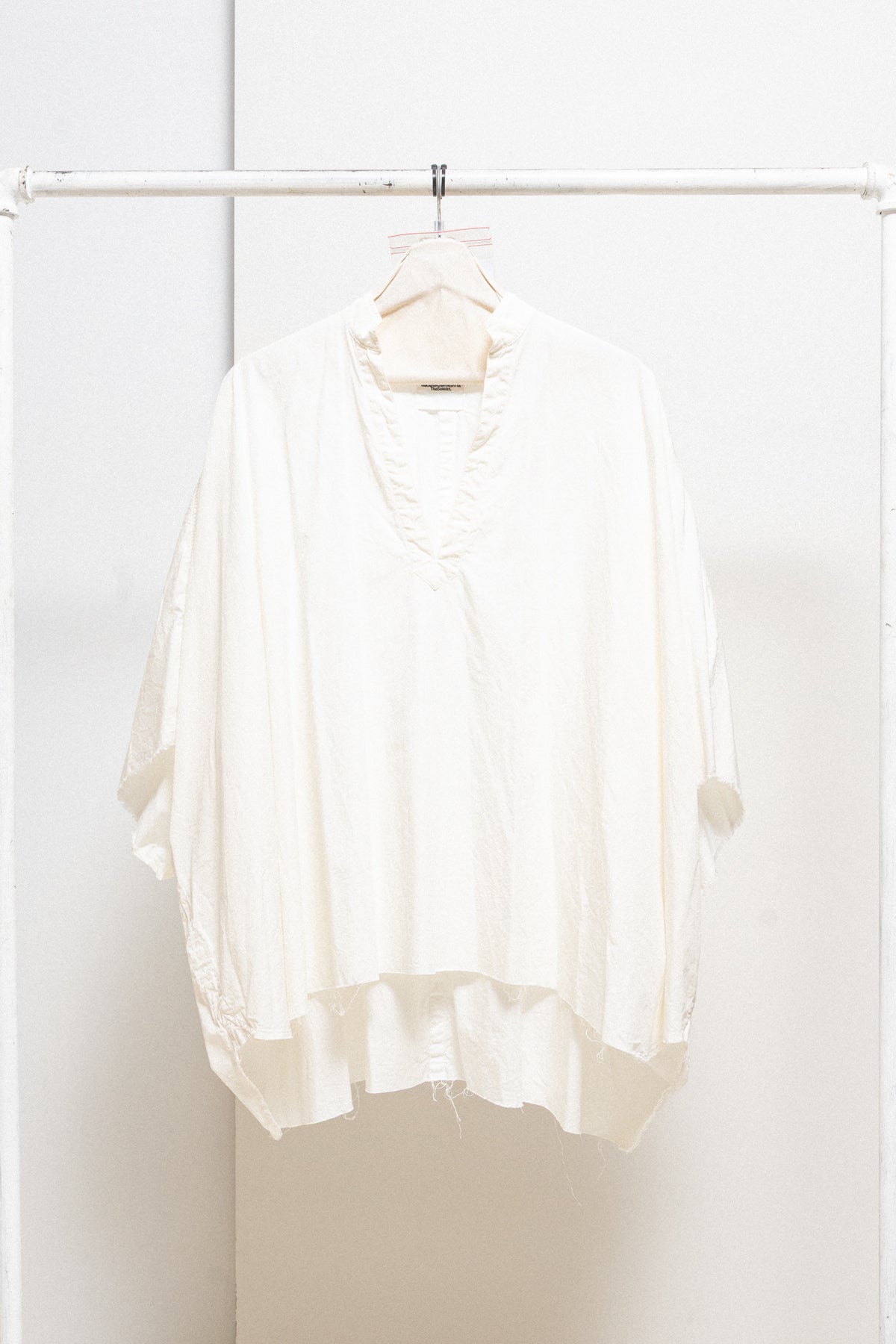 Amazing white wide shirt made of a soft cotton and silk blend, featuring a V neck opening on the front and elongated back. Relaxed cut with raw cut hems at the bottom.