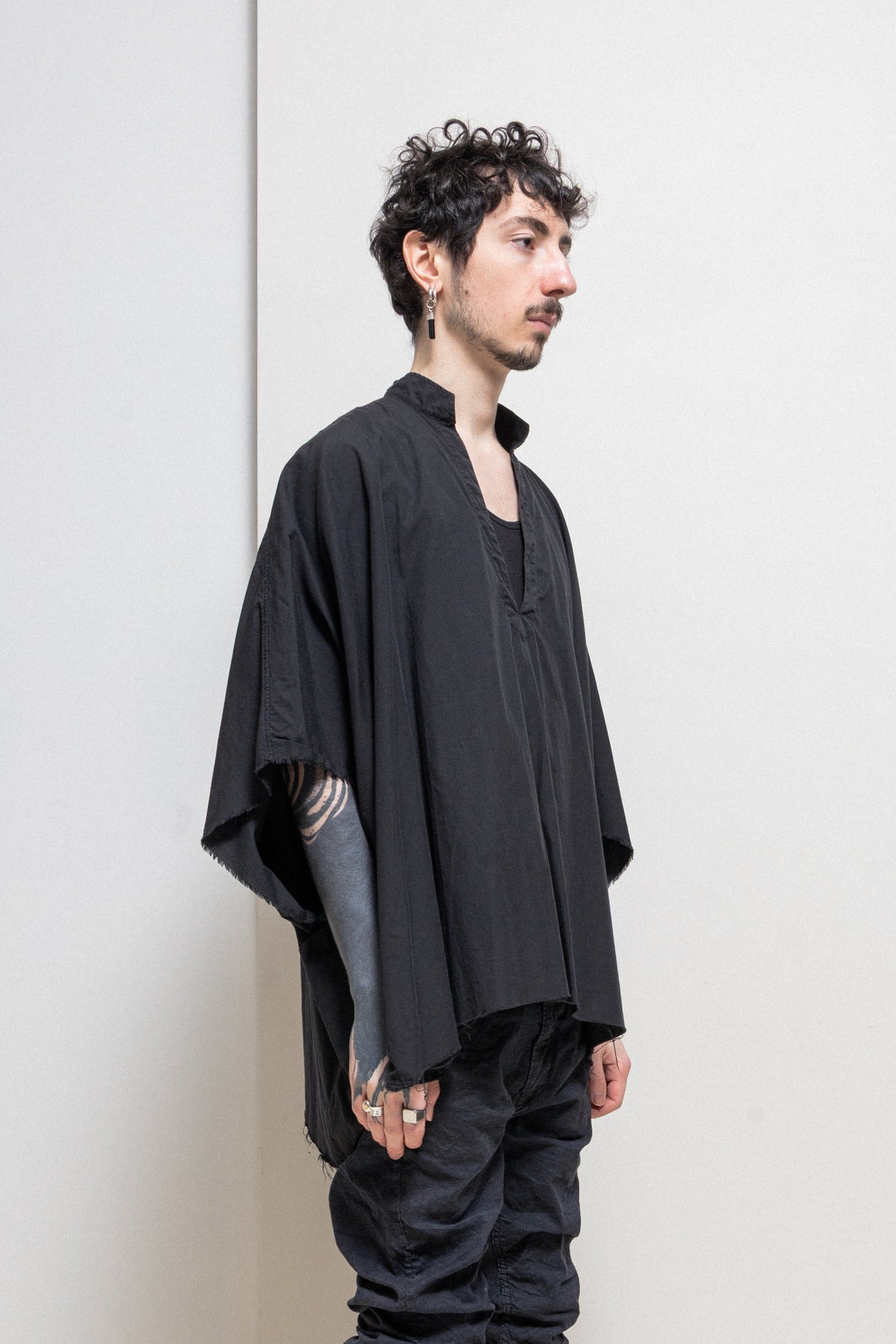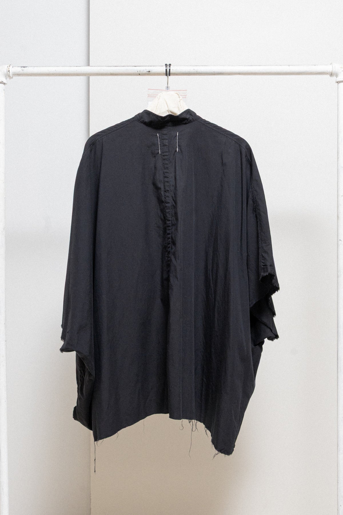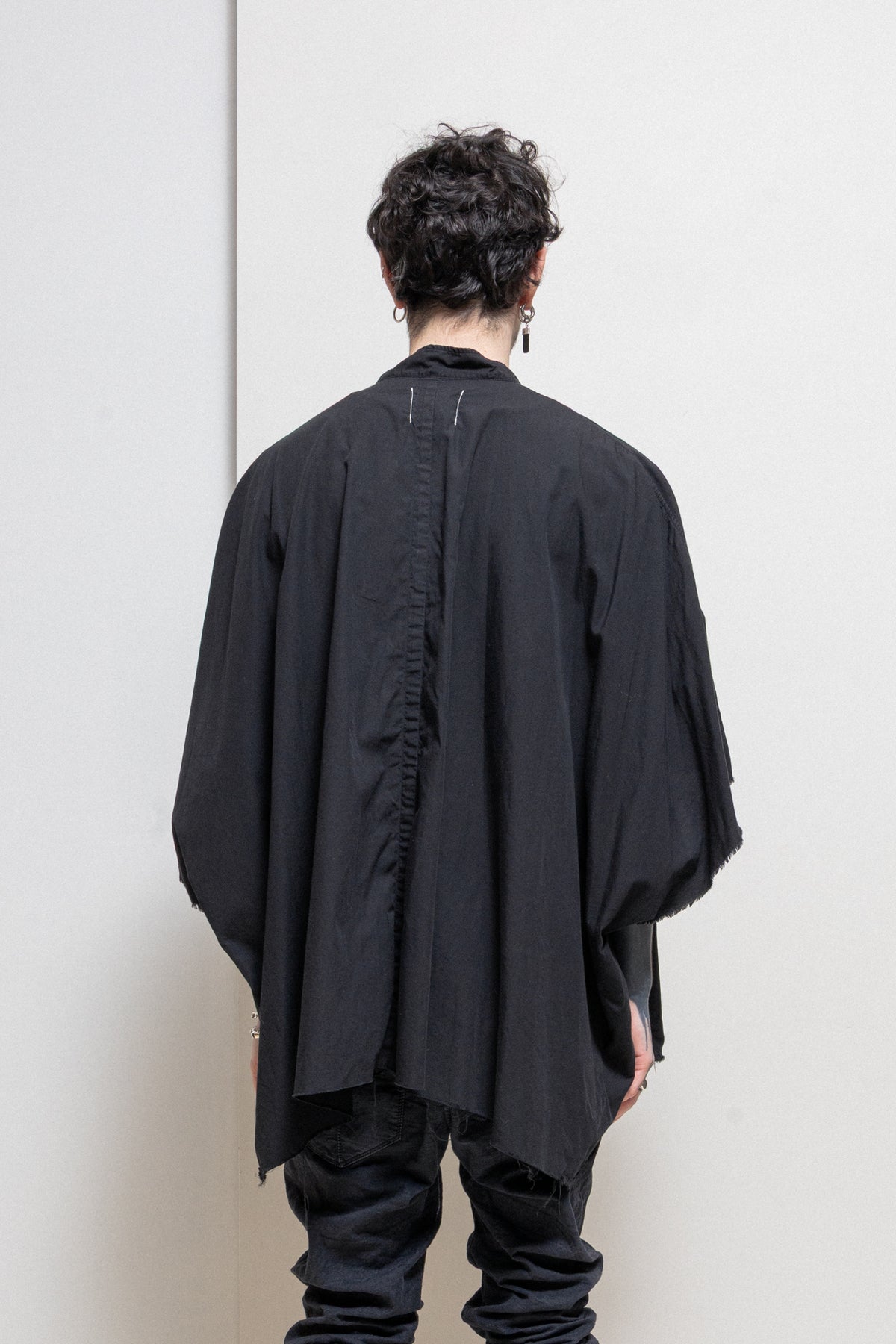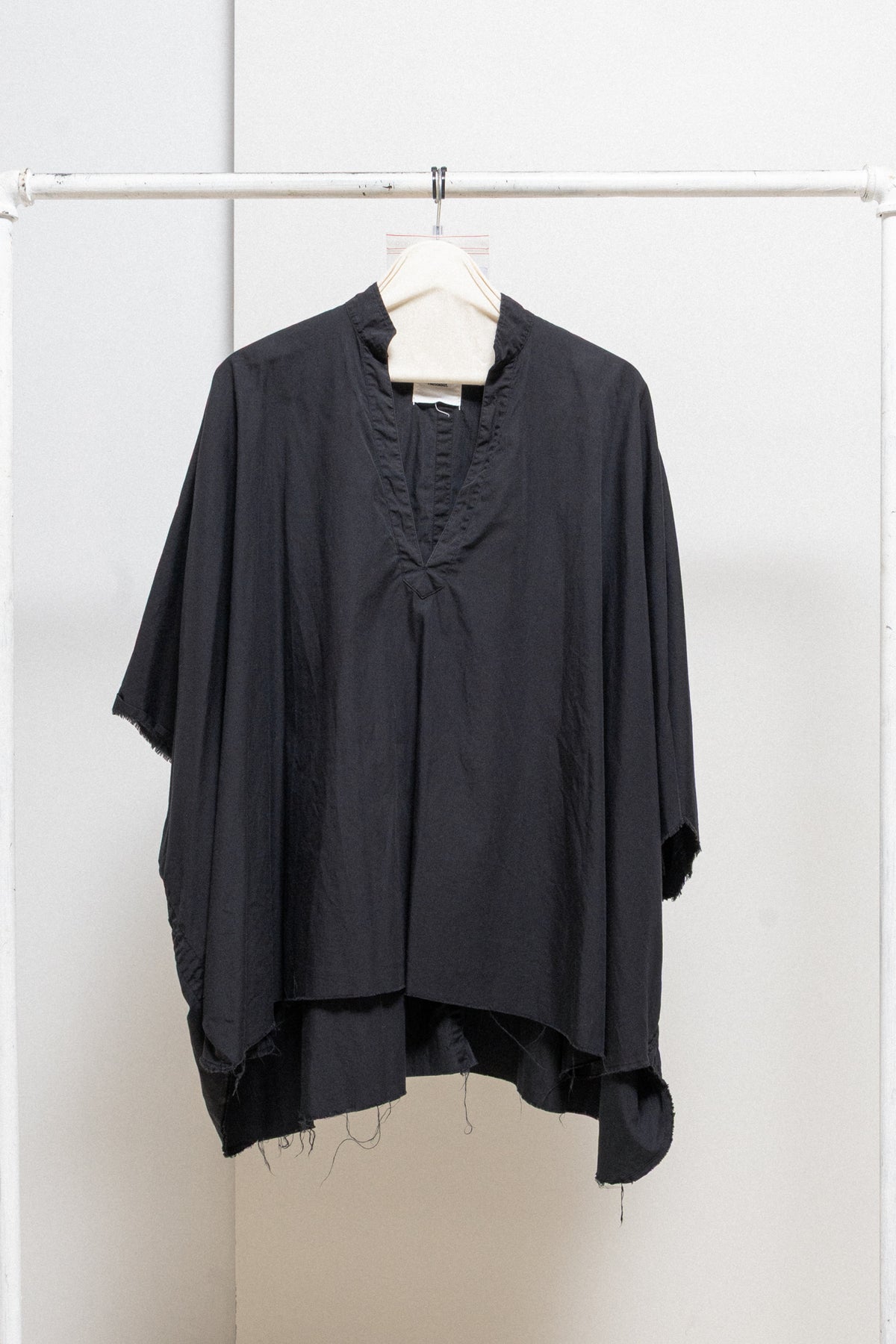 Amazing black wide shirt made of a soft cotton and silk blend, featuring a V neck opening on the front with a collar and elongated back. Relaxed cut with raw cut hems at the bottom.