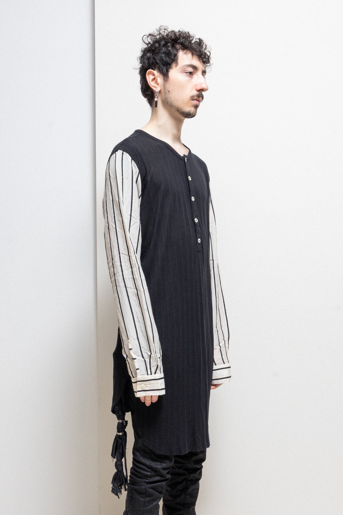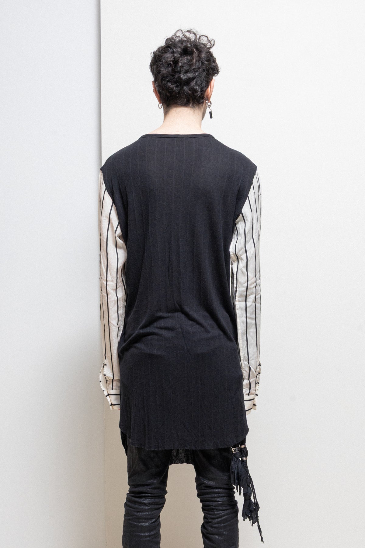 Beautiful sweater made of a thin and soft see-through cashmere blend with a striped texture. Contrasting striped shirt sleeves, collar buttoning detail. Elongated cut with a slightly shorter back. Relaxed cut.