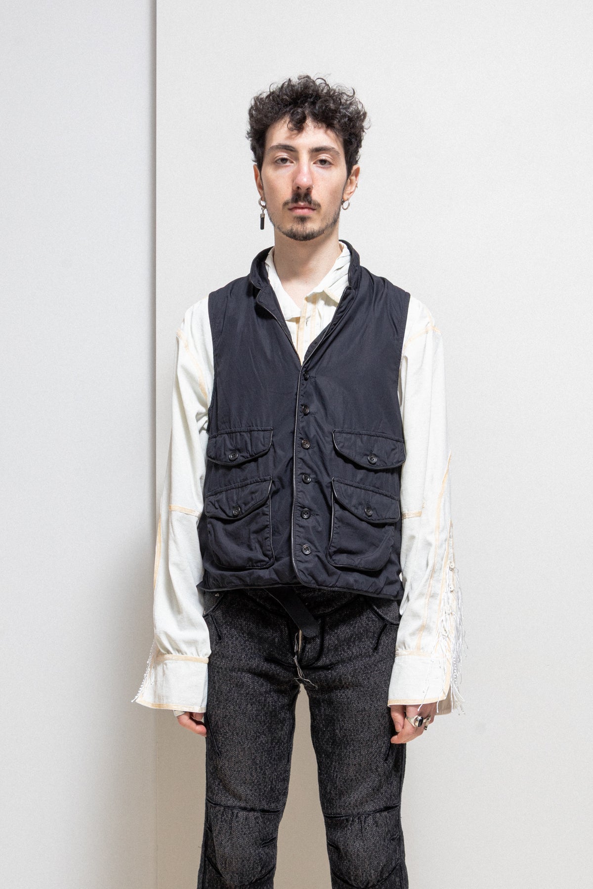 Lovely fisherman style vest made of cotton fabrics detailed with quality leather trim on most edges of the garment.