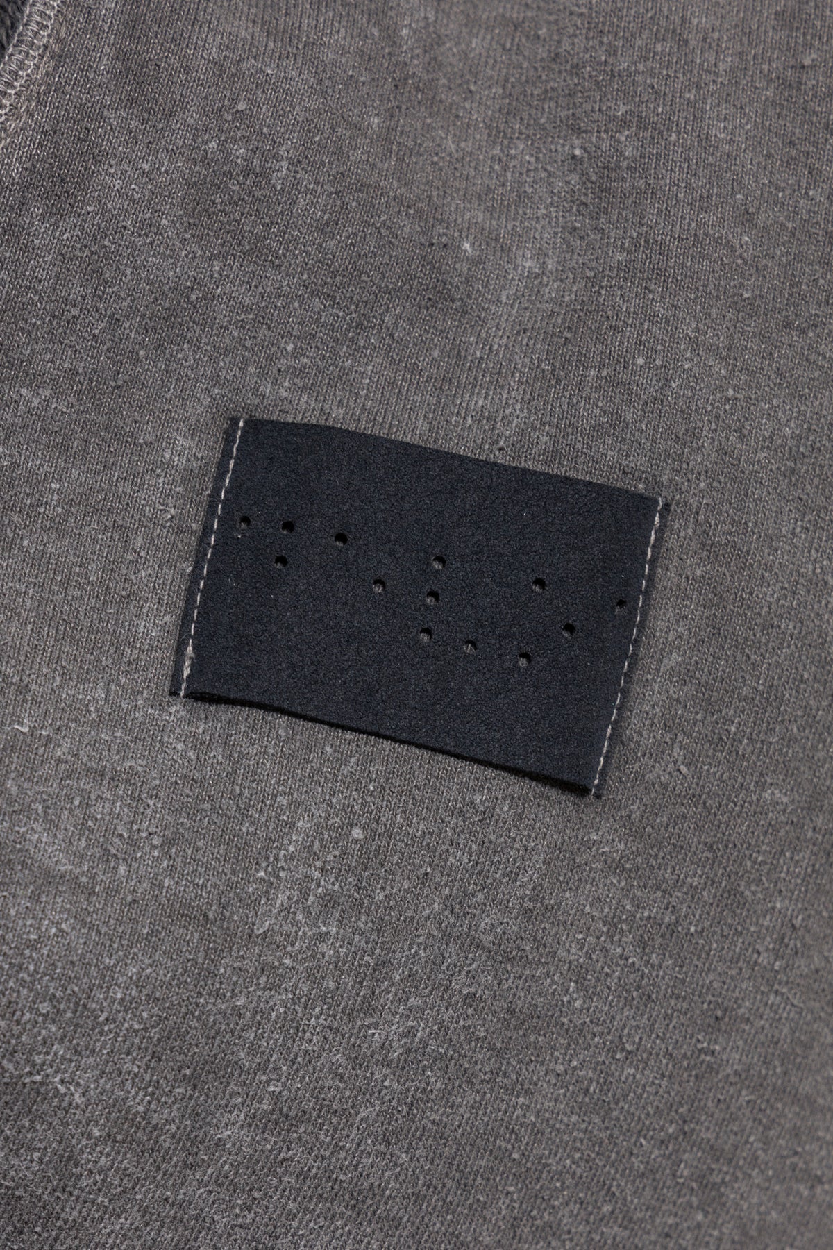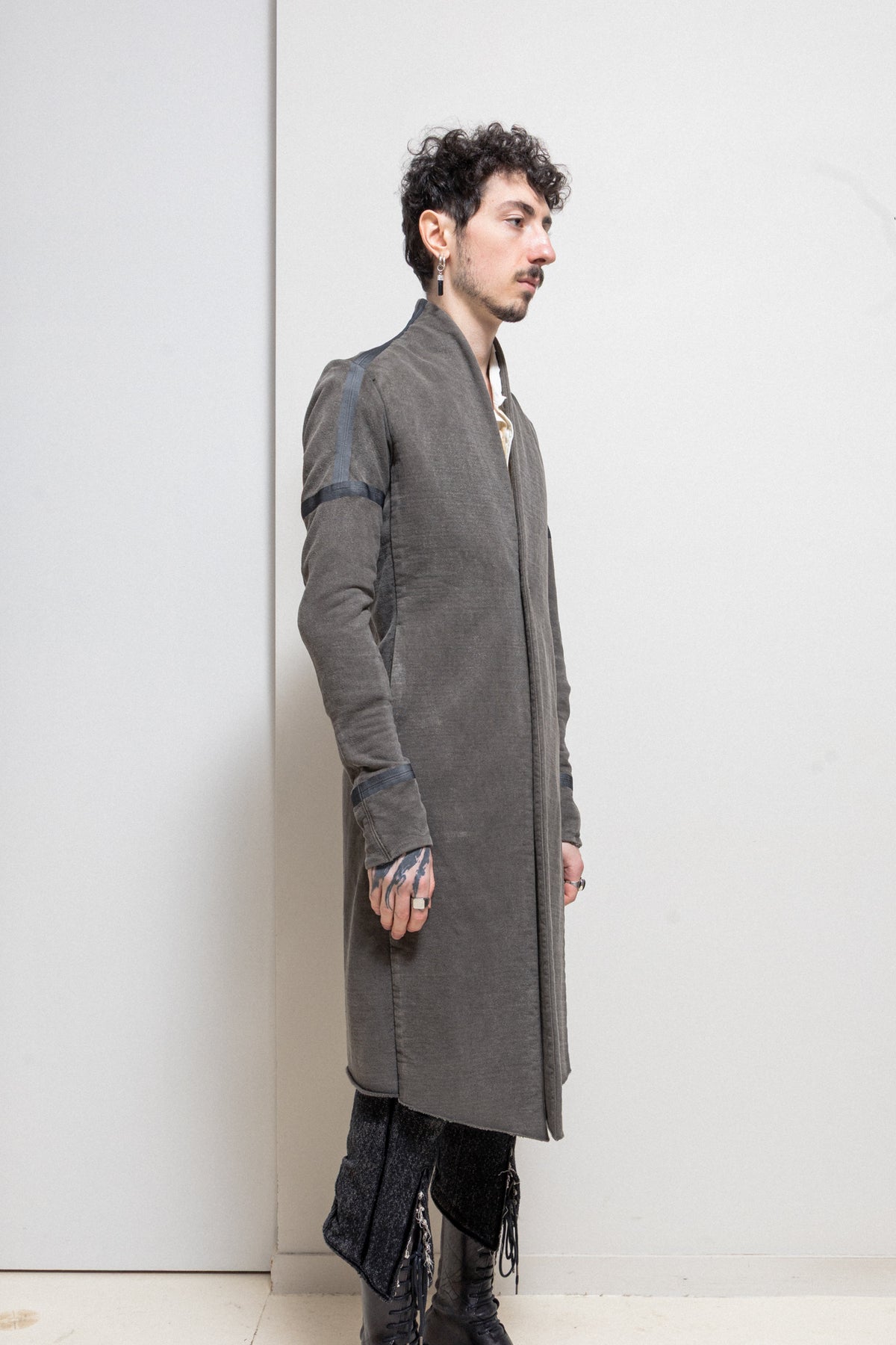 Beautiful washed grey long collarless coat made of a blended cotton and silk fabric, featuring taped seems details.