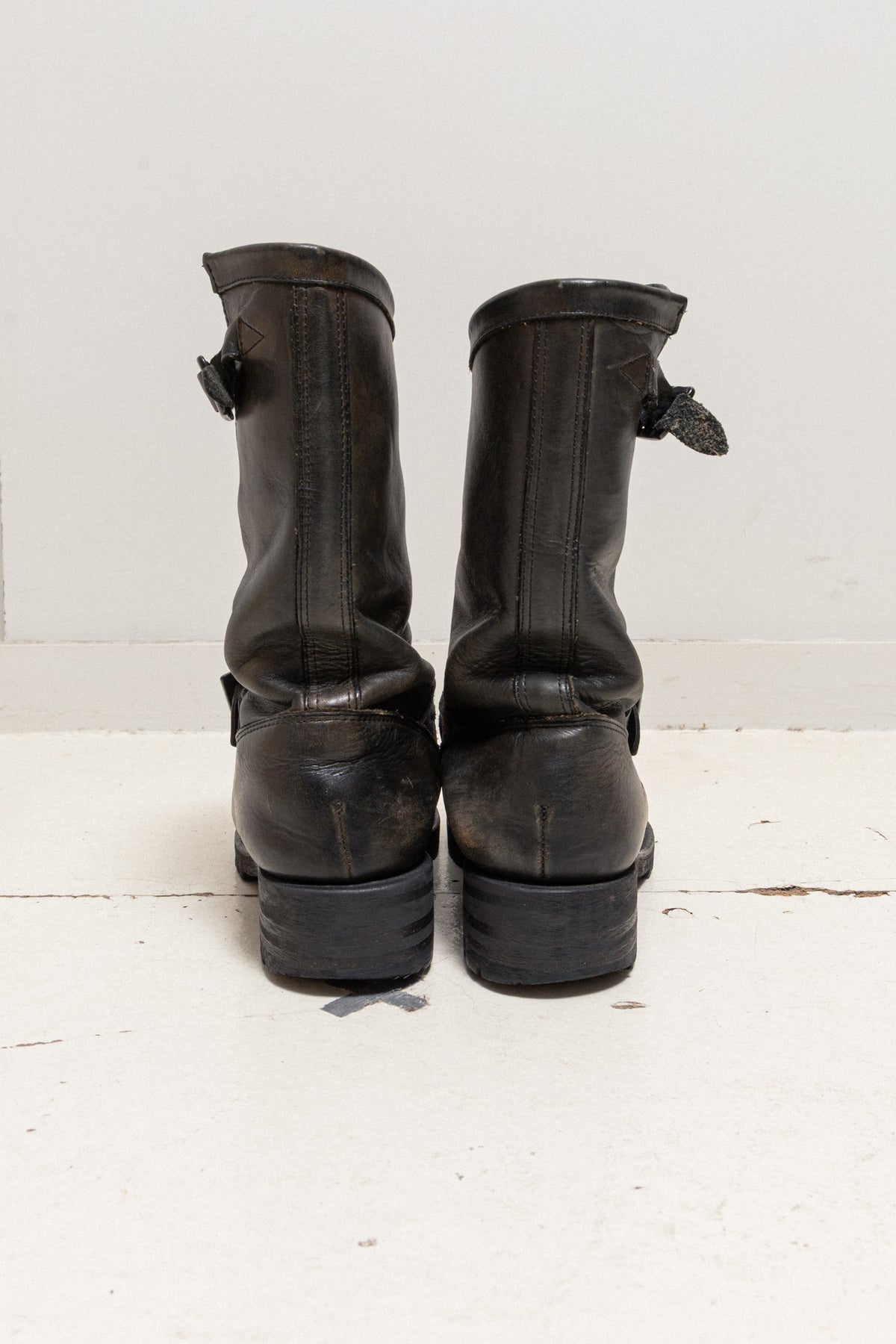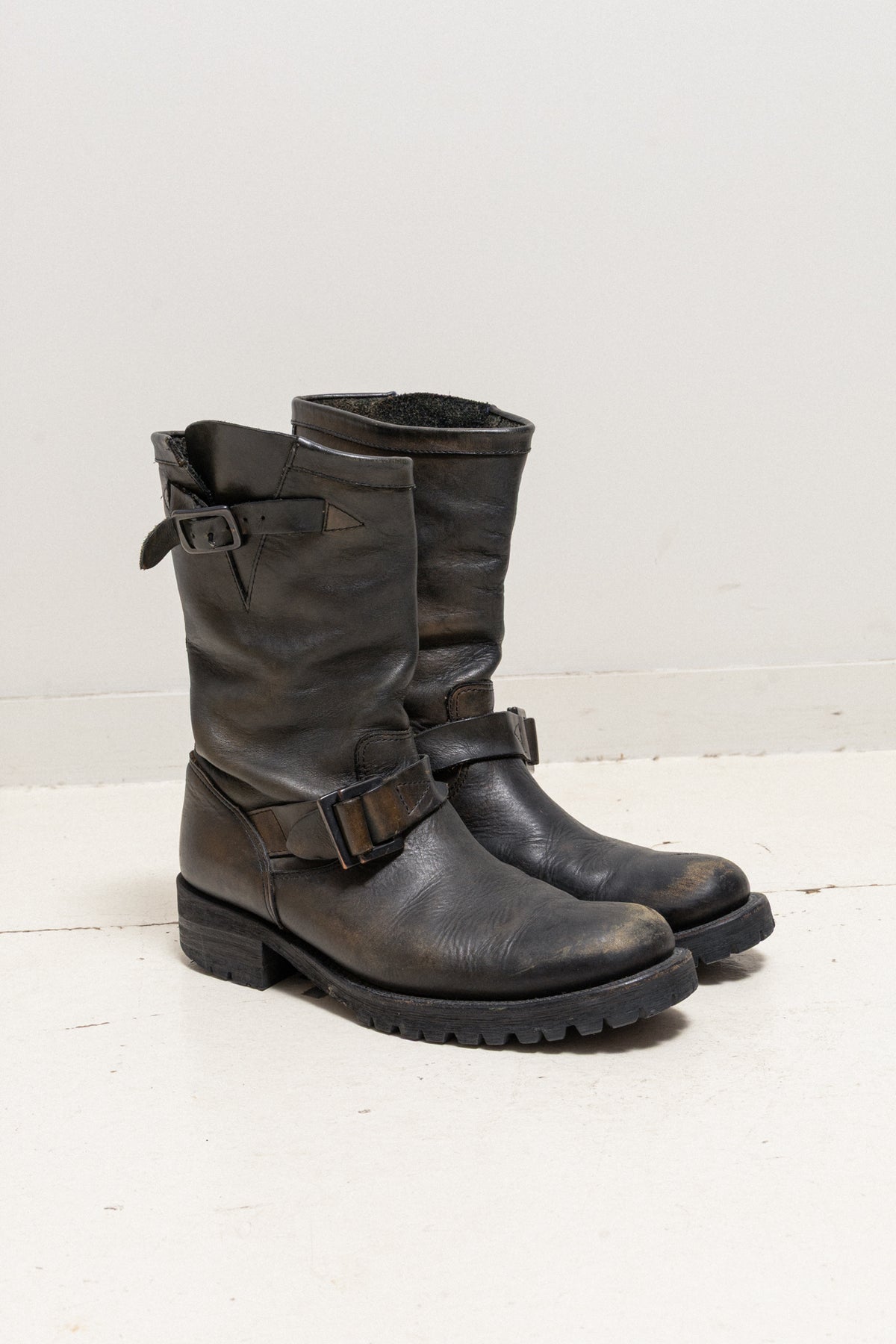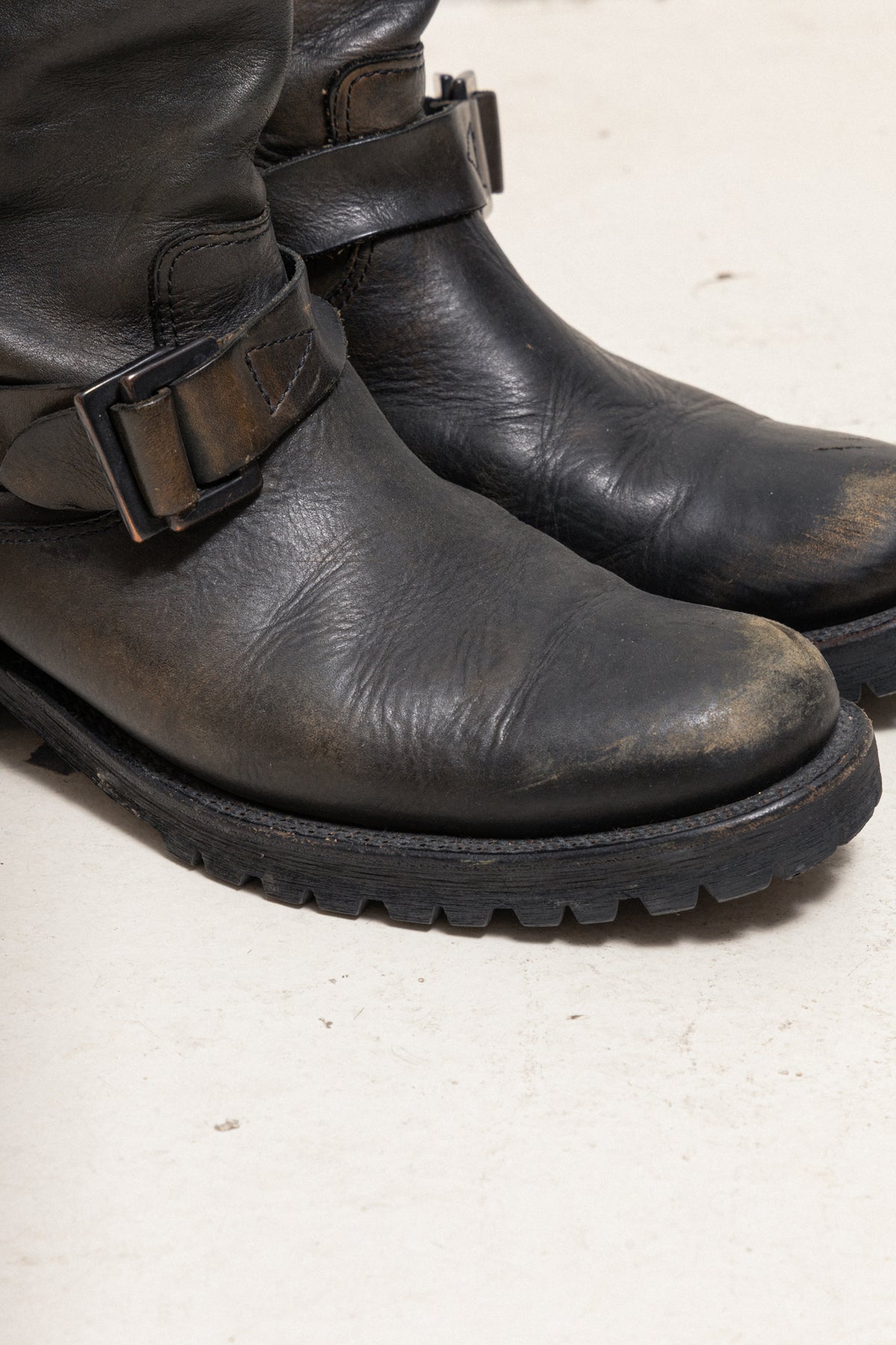 A beautiful pair of engineer boots made of japanese shoulder leather carefully finished by domestic tanners. The material is treated to create a rough and strong look while keeping a soft texture. The leather changes after every wear, without being stiff. It's robust construction makes it a pair of choice that can be used for a long time. Double square buckles, slightly bent shape, notched sole with heel, rounded toes.