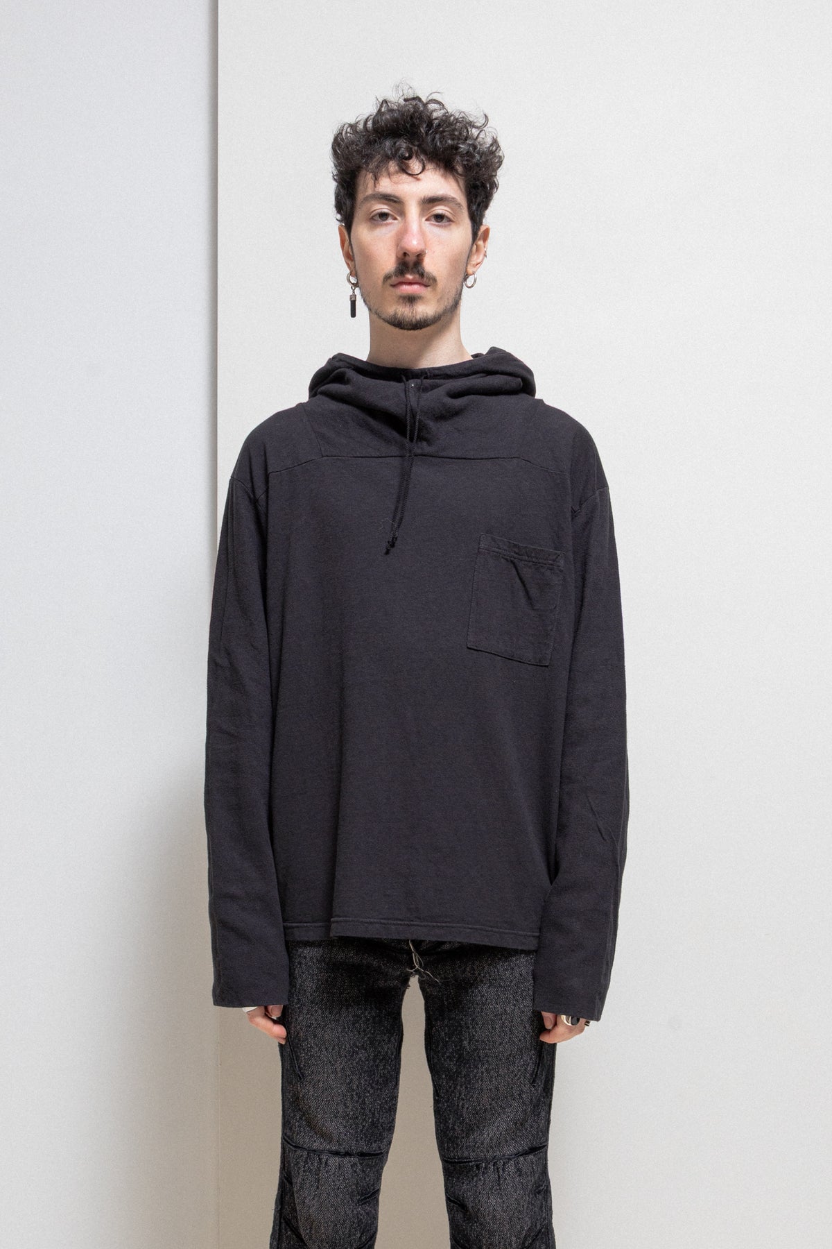 Lovely black hoodie with a boxy shape made of a cotton fabric, featuring shoulder yokes and a scarf like hood.