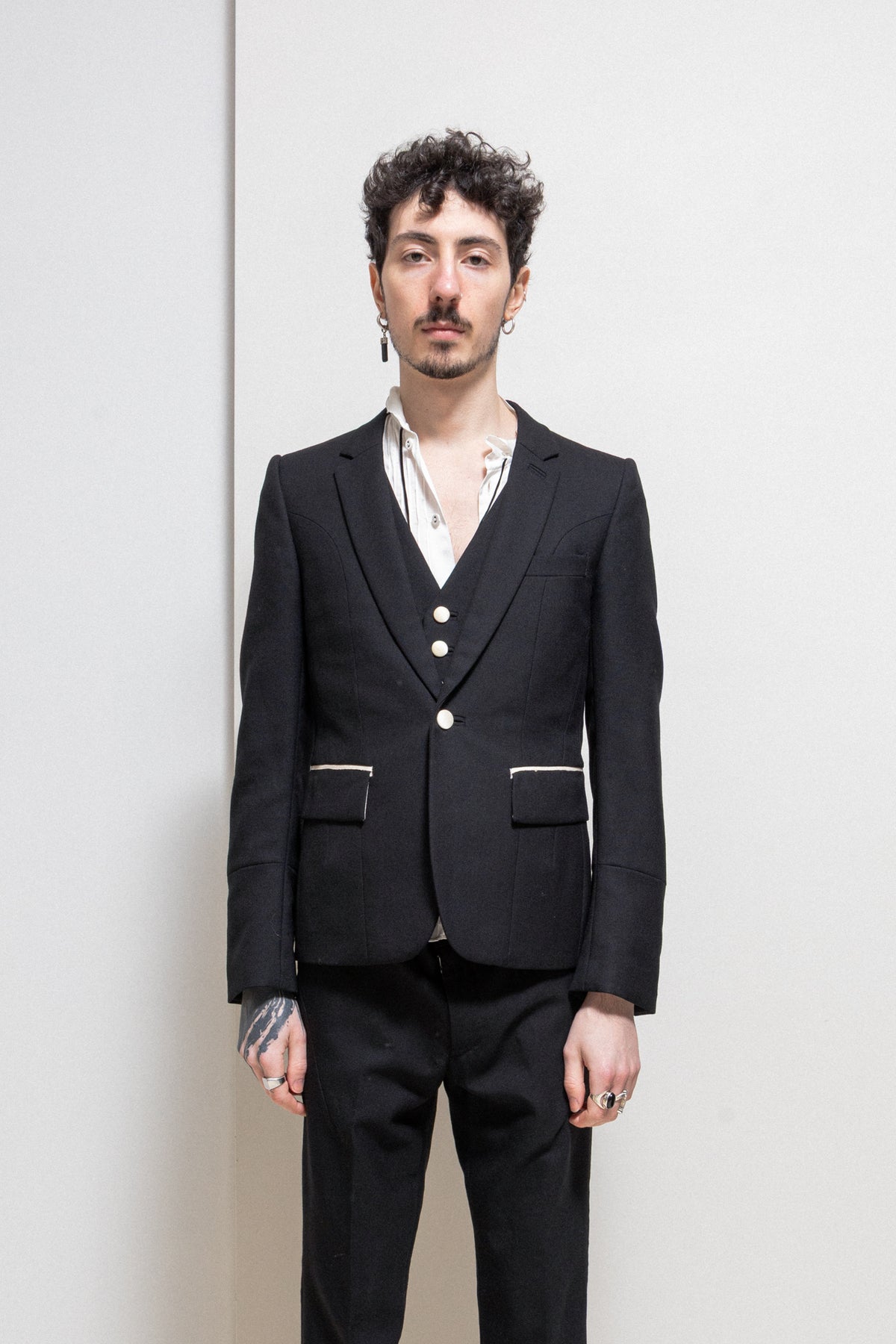 Amazing blazer jacket made of a fine wool, featuring contrasting cream details such as: single button for closure, pocket trim, cuff buttoning with straps, as well as a strap to close a back slit. Regular cut with notch lapels, multiple back curved structuring darts, a flap pocket each side and a chest pocket. Silk cream lining.