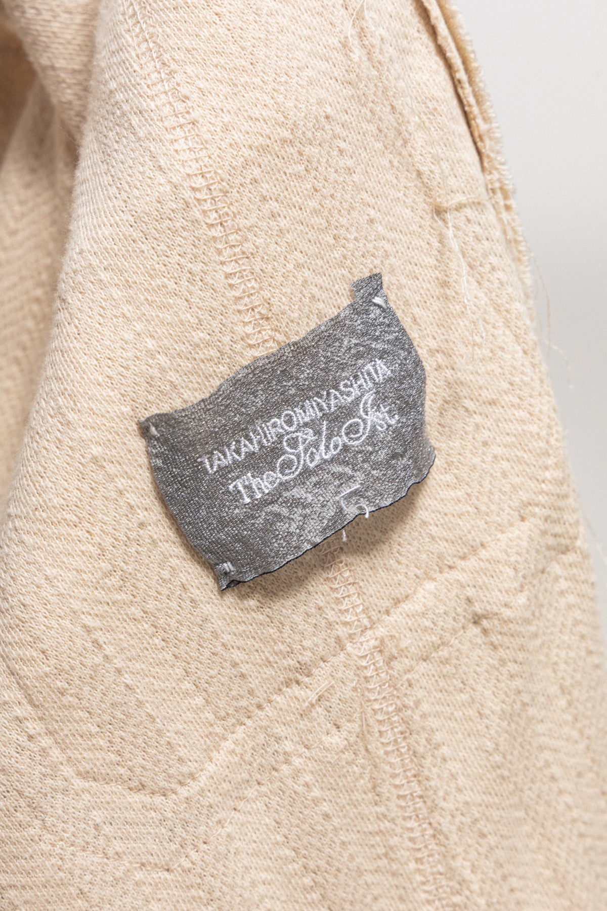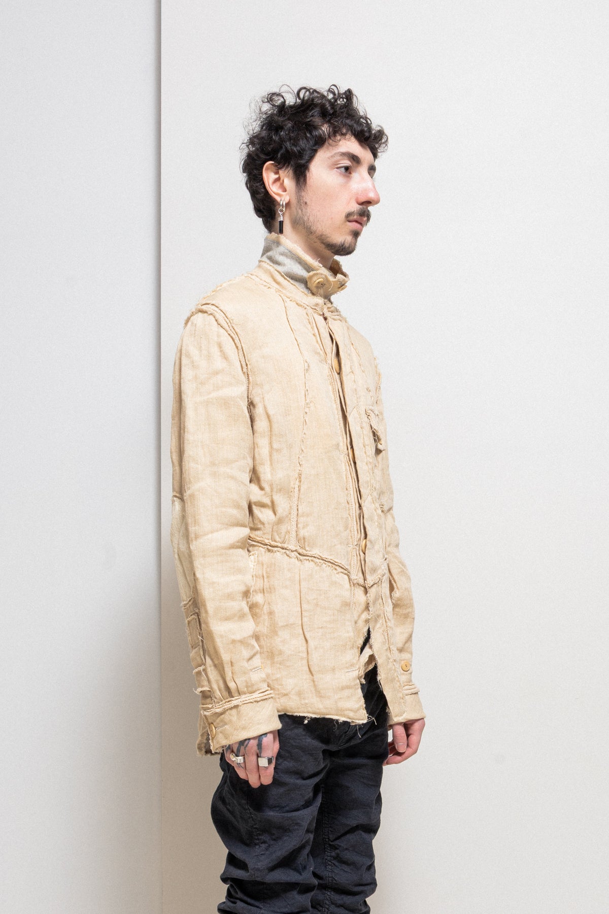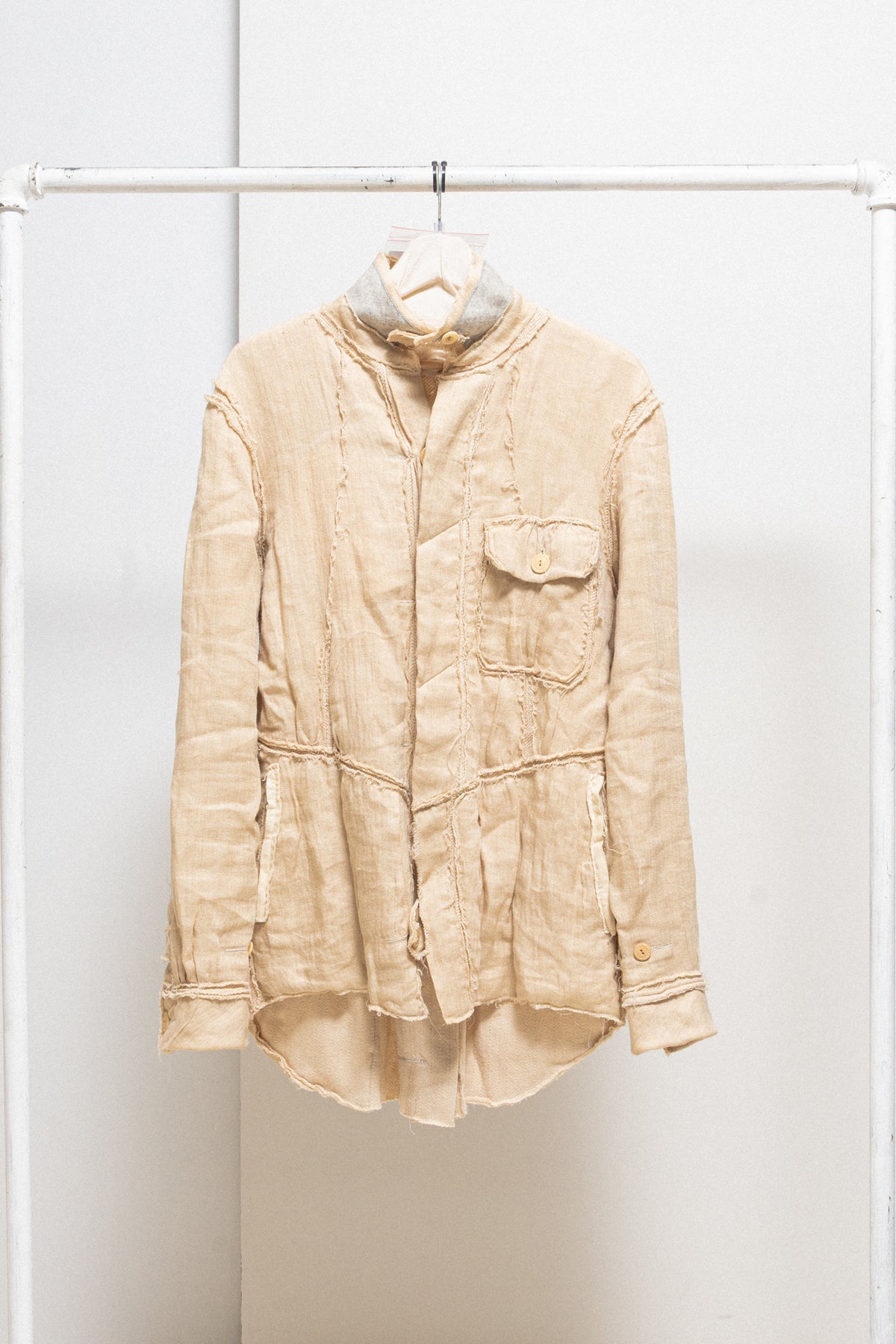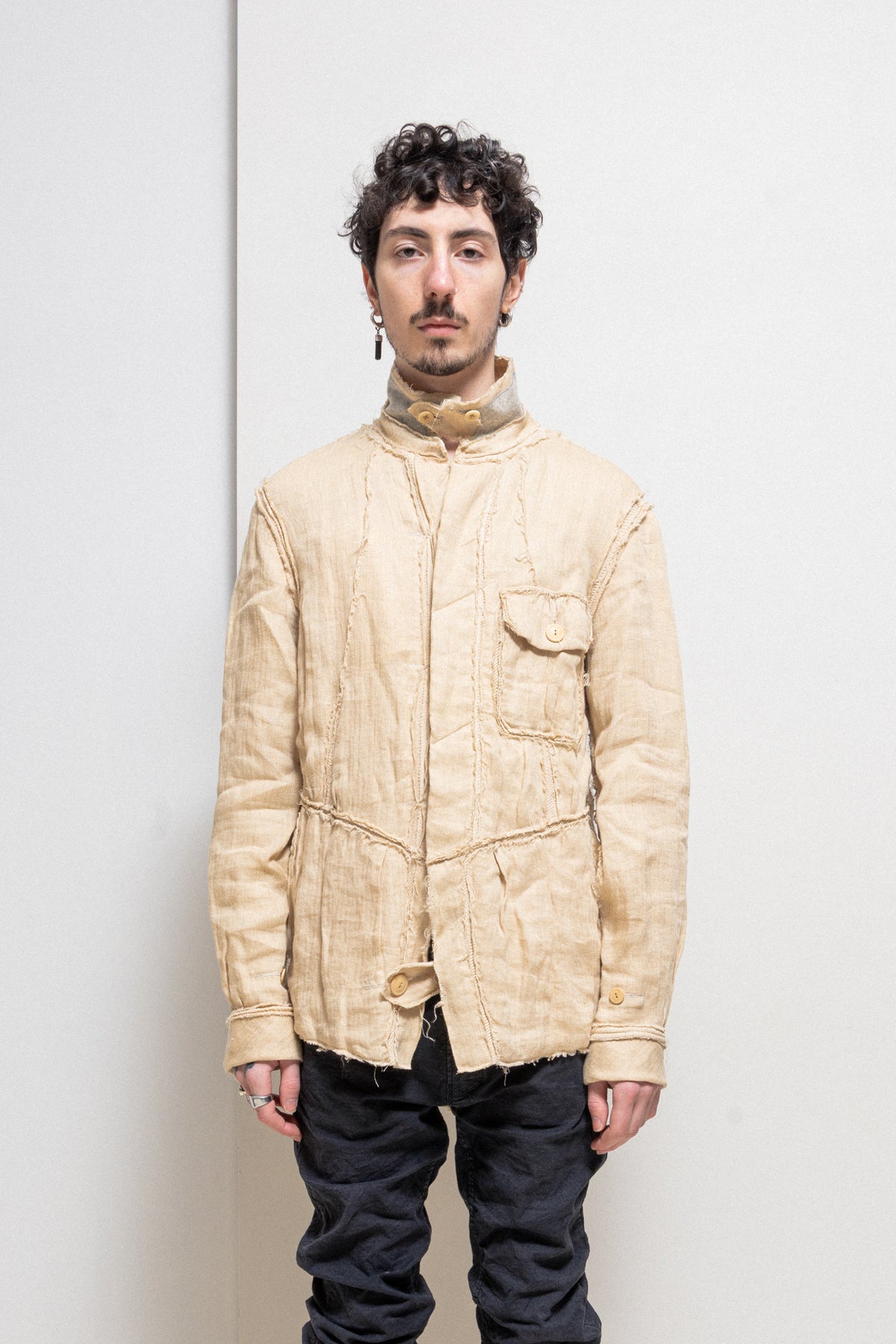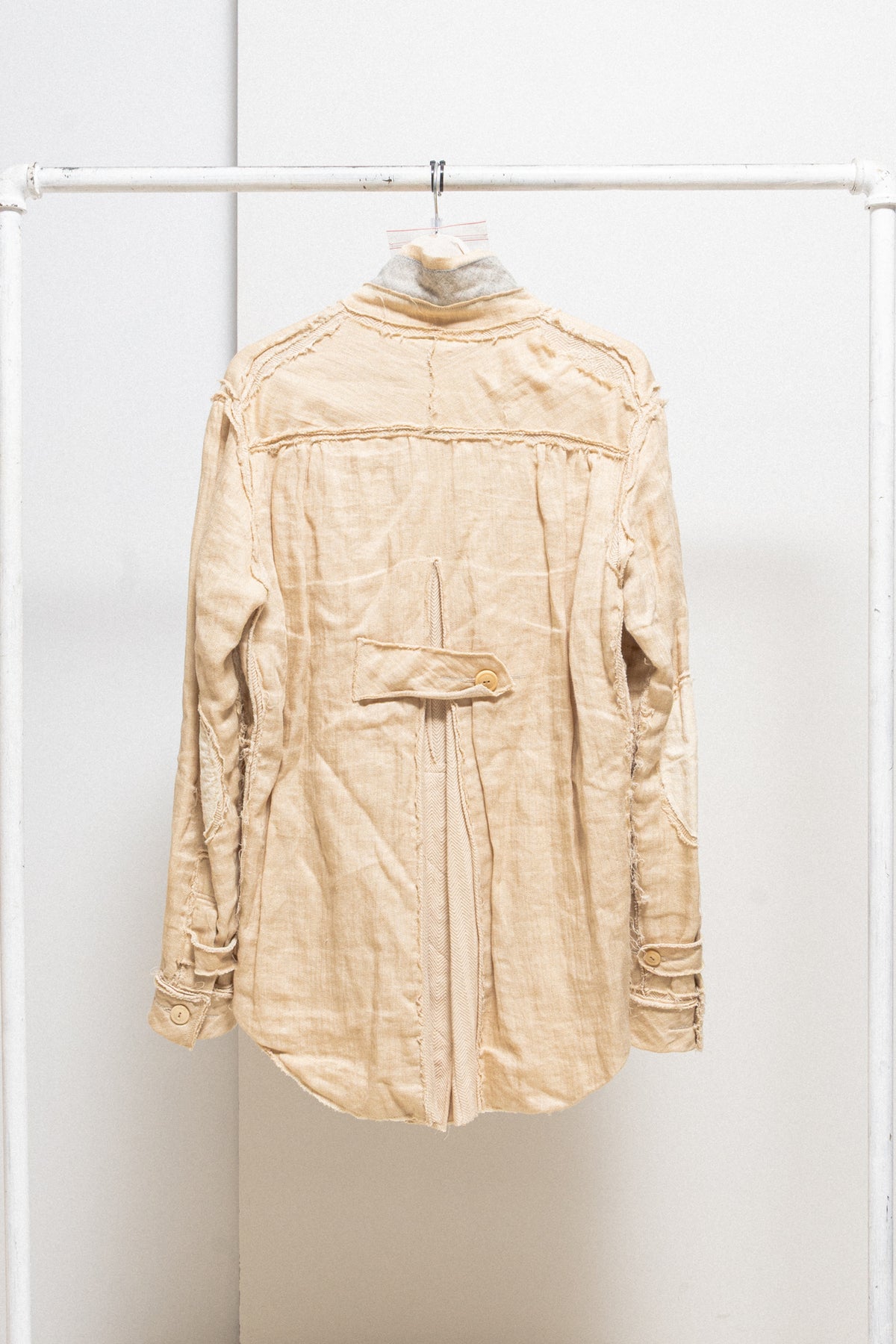 Incredible cream jacket made of a soft cotton fabric with a chevron threading motif, featuring a beautiful patchwork construction including some gauze fabric and detailed by all off the seams and edges left raw. Regular cut with contrasting light blue undercollar with a crossing closure of two buttons, hidden front closure with four buttons and a strap, a pocket each side and a chest flap pocket. Elbow panels, cuff splits with buttons and straps, as well as a back tail with a buttoned strap.