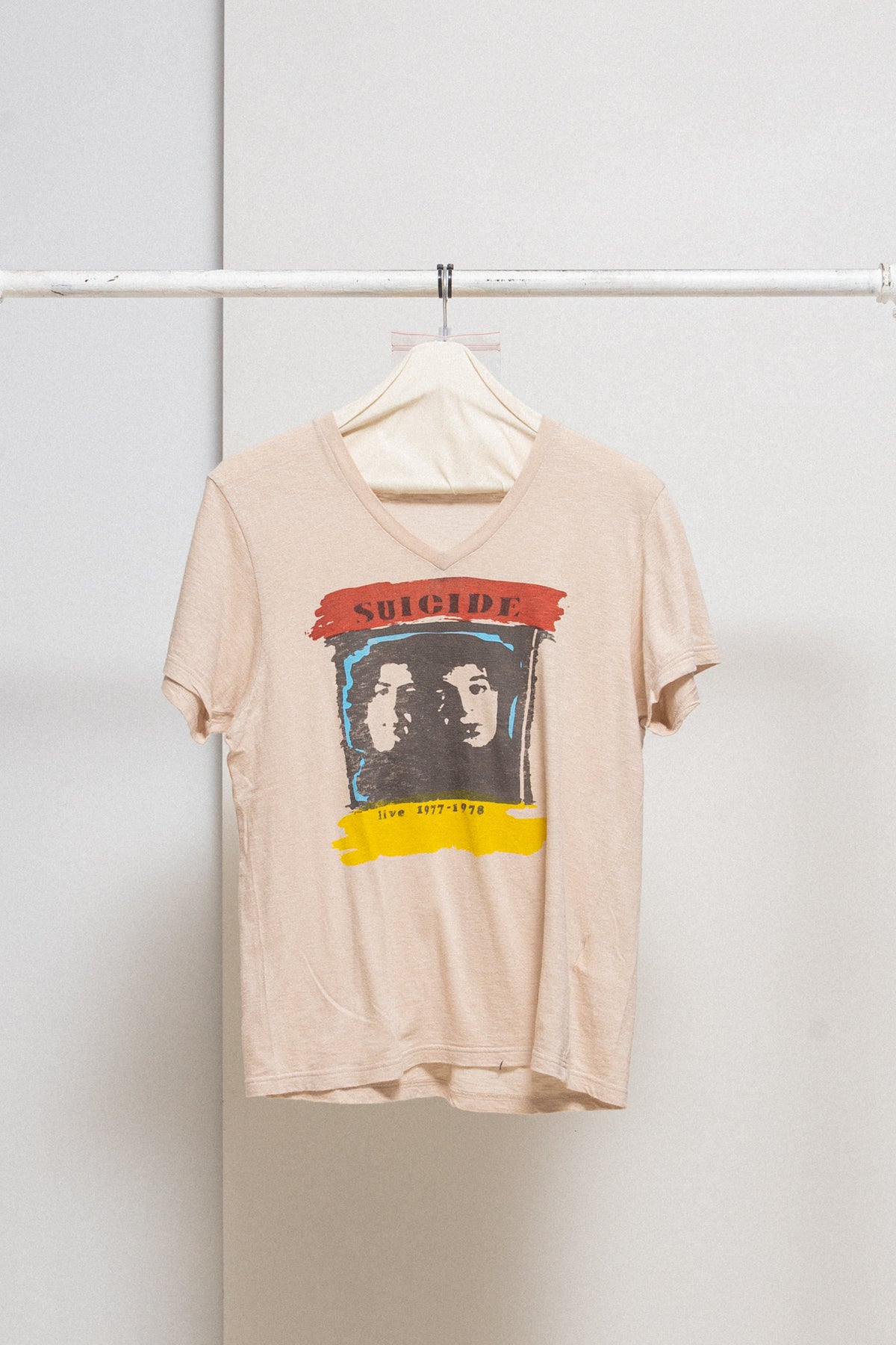 Very cool t-shirt made of a soft and lightweight cotton fabric, featuring a colorful front print of Suicide's "Live 1977-1978" (Brussels) artwork picturing the duet, with a hint to their song "Frankie Teardrop" on the back (sang during this live as well). V neckline.