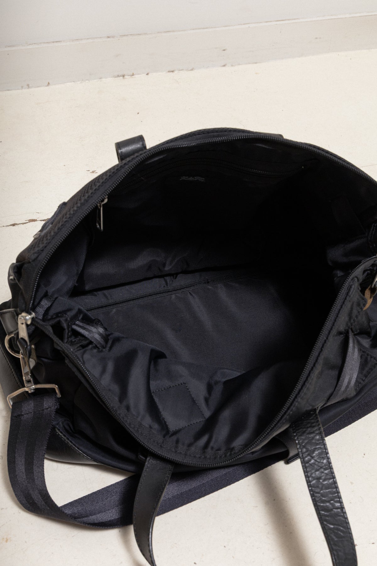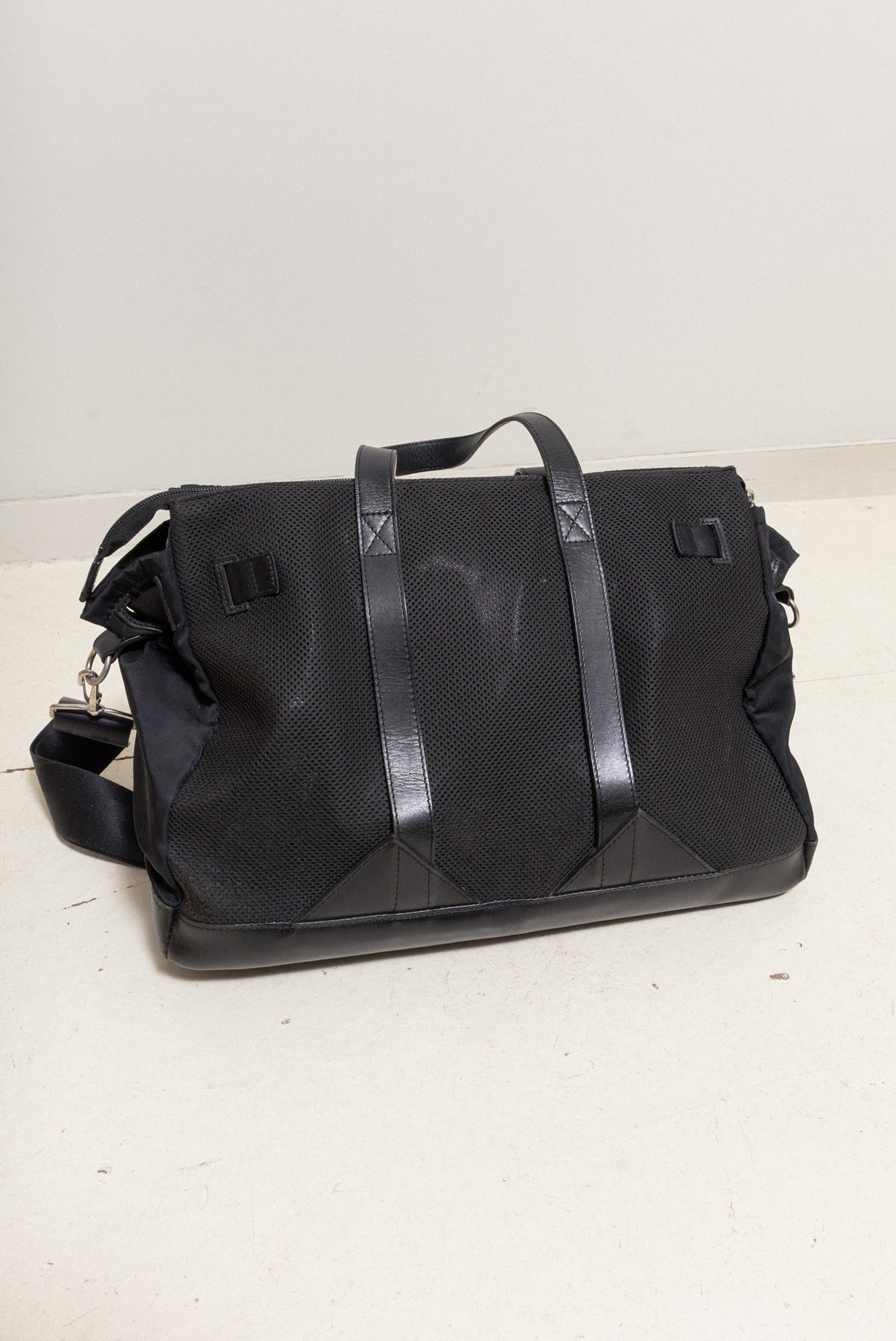 Amazing travel bag made of a nylon like fabric, with a particular design remembering Hermes Birkins. Features a padded mesh back and leather handles with an opening to slide it on a suitcase handle, a decorative buckle at front, as well as an adjustable strap to wear it crossbody, that can also be removed. Zipper pockets inside. Big capacity perfect for a weekend trip.