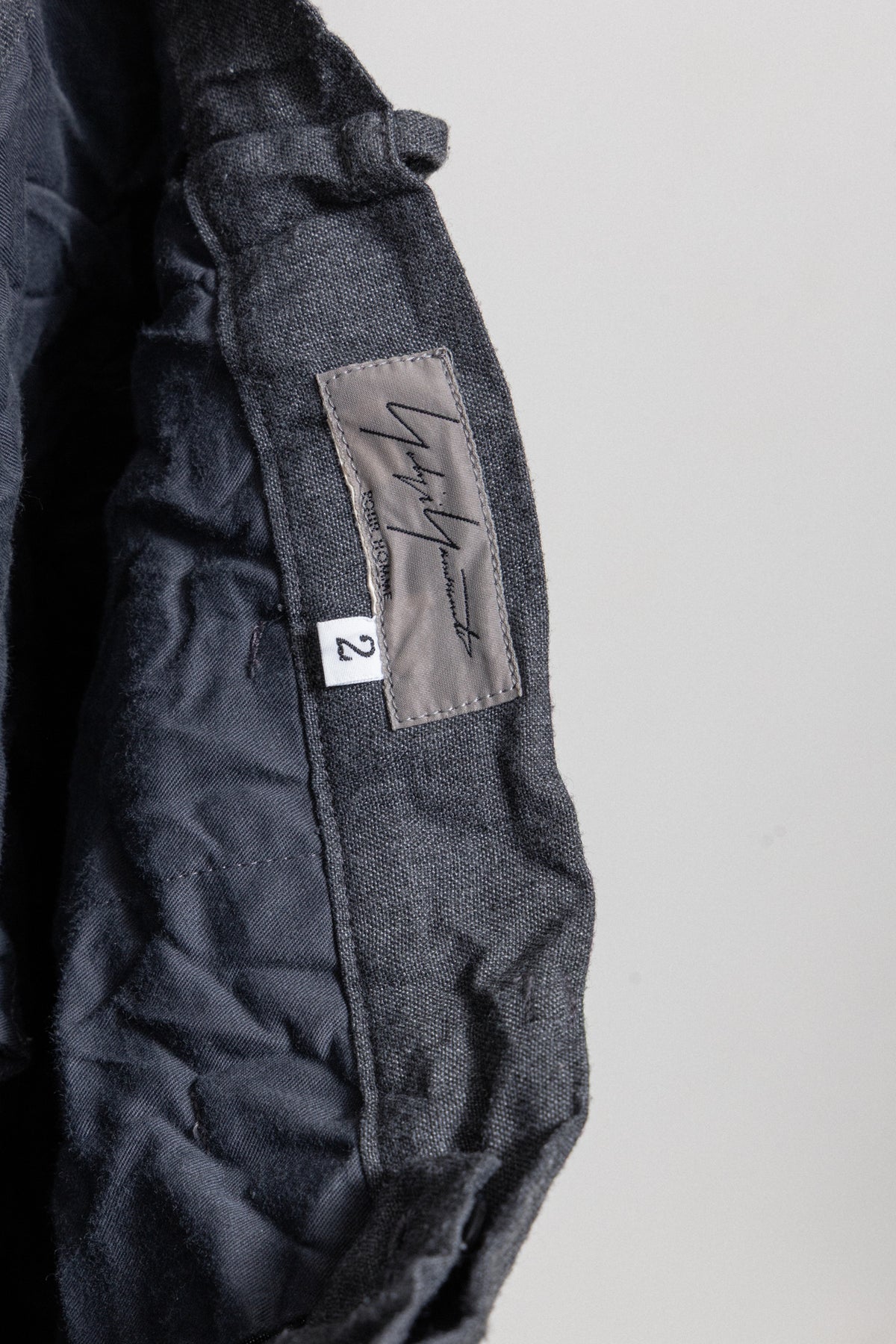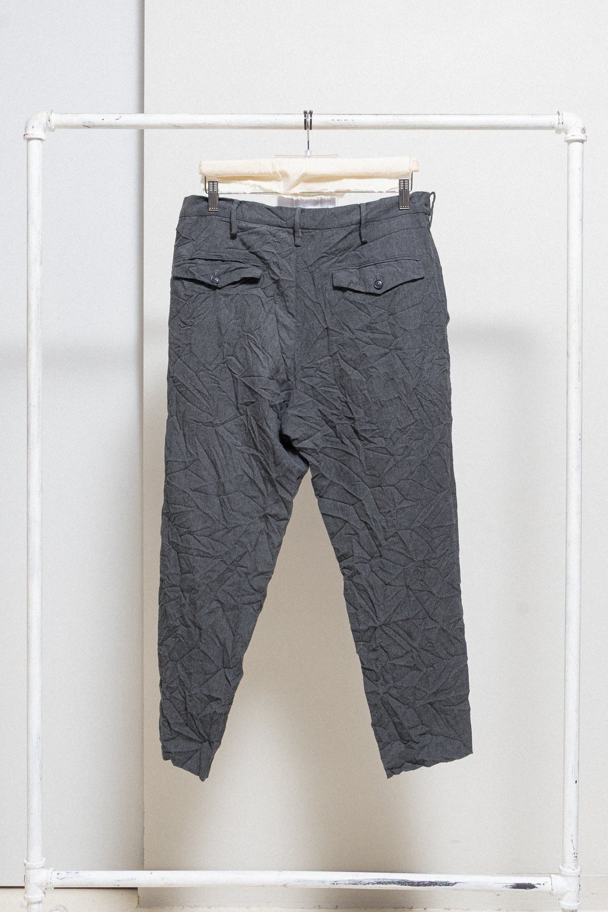 Amazing pair of pants made of a thin wool fabric with a wrinkled texture. Straight cut with a pocket each side, back flap pockets and belt loops.