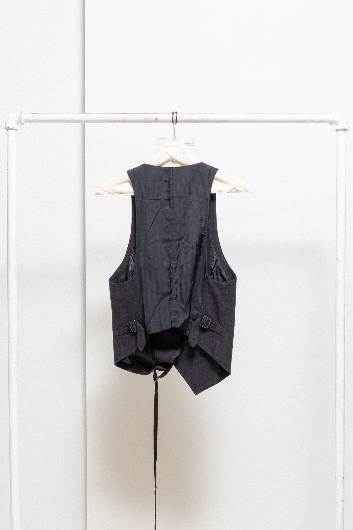 Beautiful vest made of a soft cotton wool blend, featuring adjustable buckled straps on each side, as well as long inner straps to tie up. Silky cupro back lining with a tone on tone strpe pattern, featuring frayed cross seams. Three button closure as front, welt pockets each side and inner pockets. Signature cross tag.