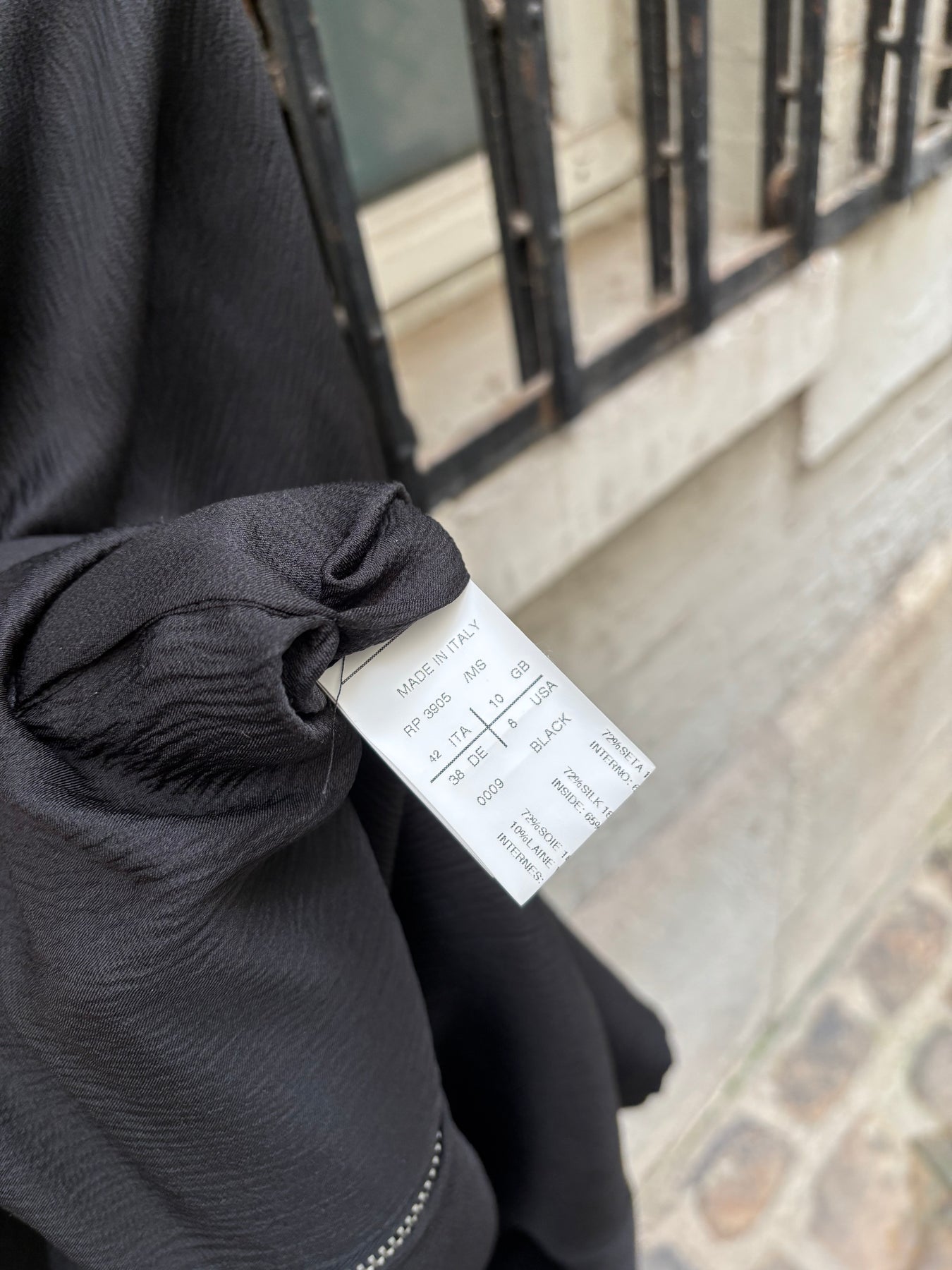 72% silk, 18% calf leather, 10% virgin wool + silk blend inside