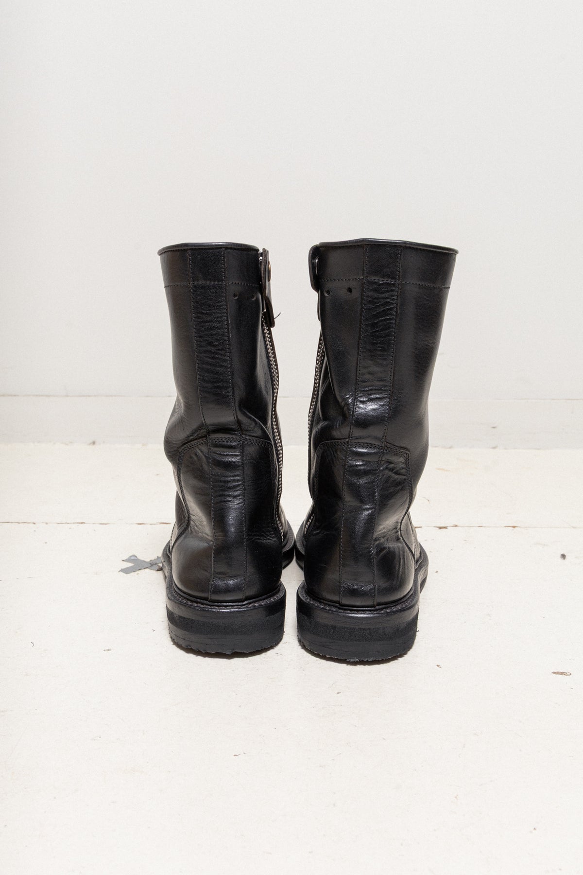 Amazing pair of high boots made of a soft buttery leather with a nice sheen, featuring signature side closure straps. Quite thick soles, rounded toes and side zippers.