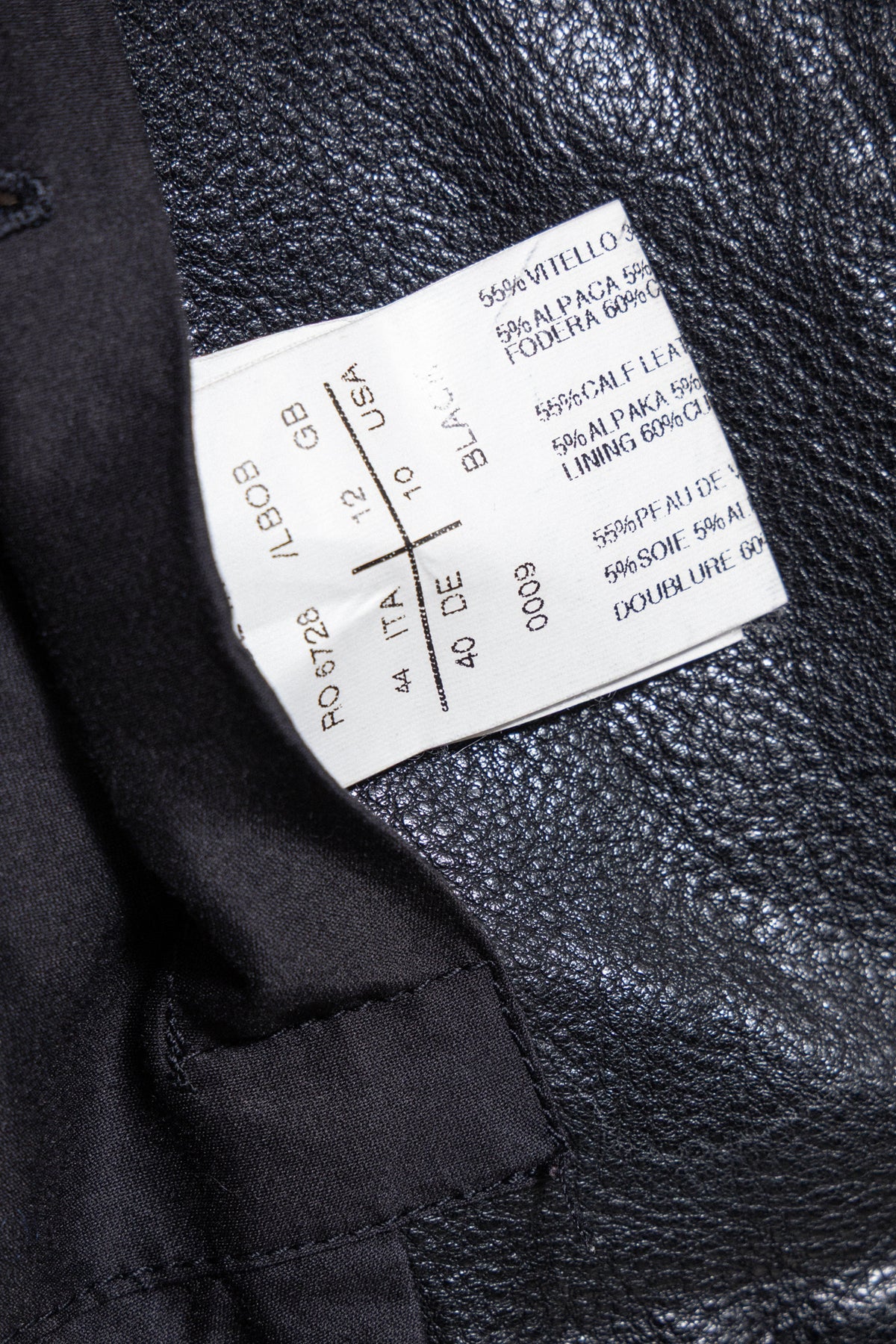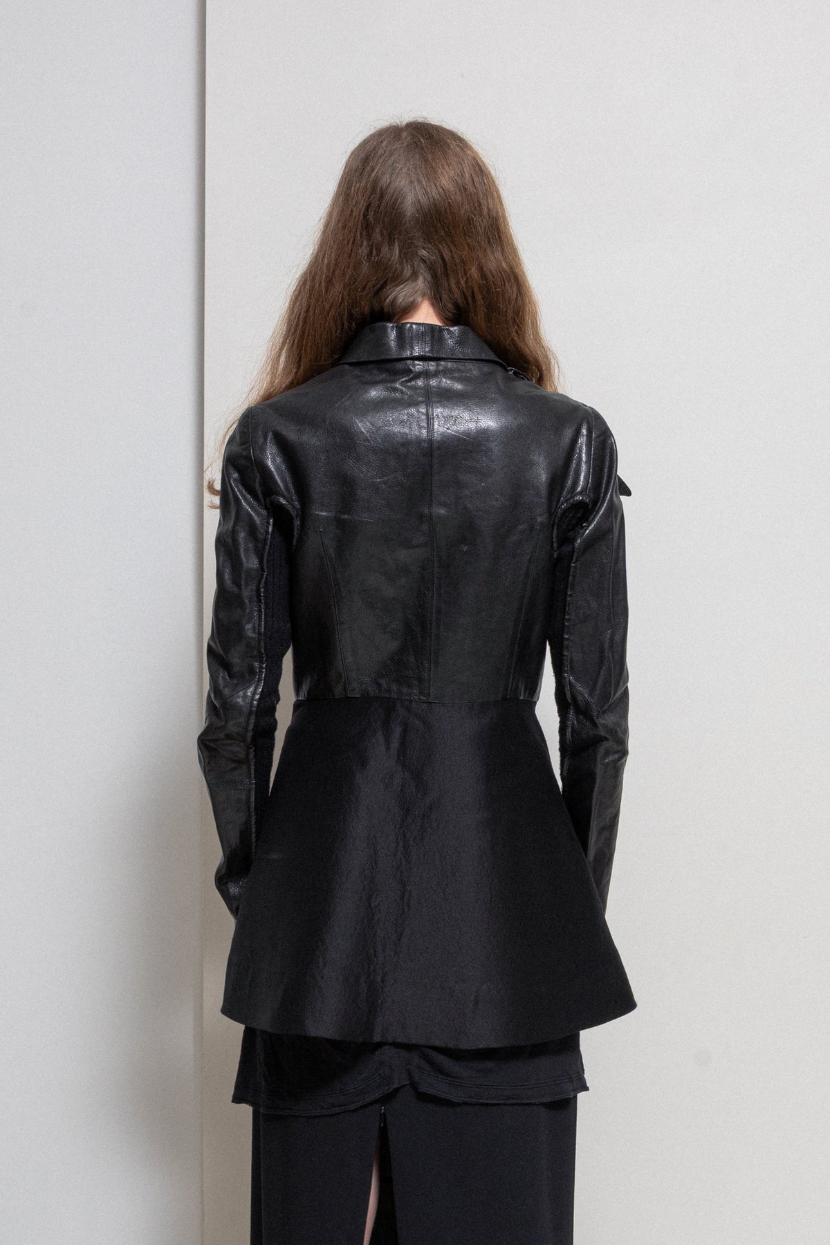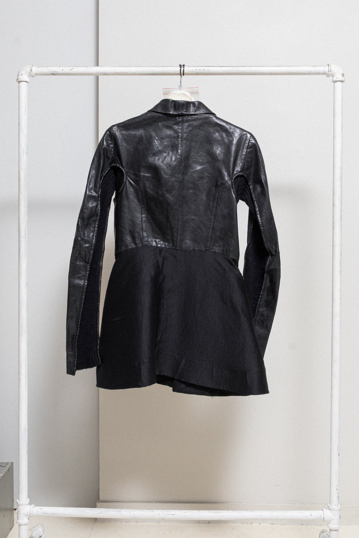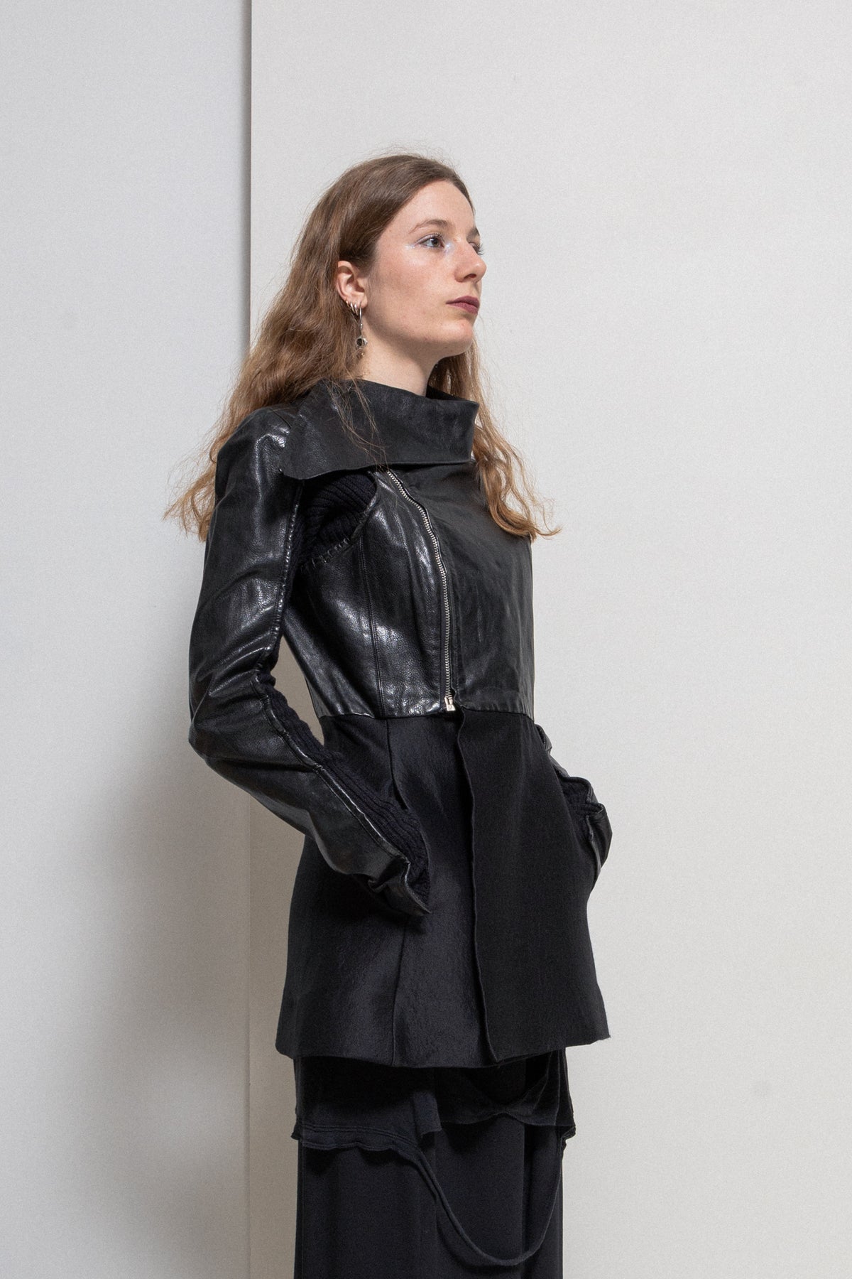 Incredible jacket made of a boxed calf leather with a nice sheen, featuring a flared wool panel going from waist and forming almost a skirt like bottom. Slim cut with a pointy tail-like collar, side zipper closure, signature tight sleeves with knitted underarms, structuring darts and a pocket each side.