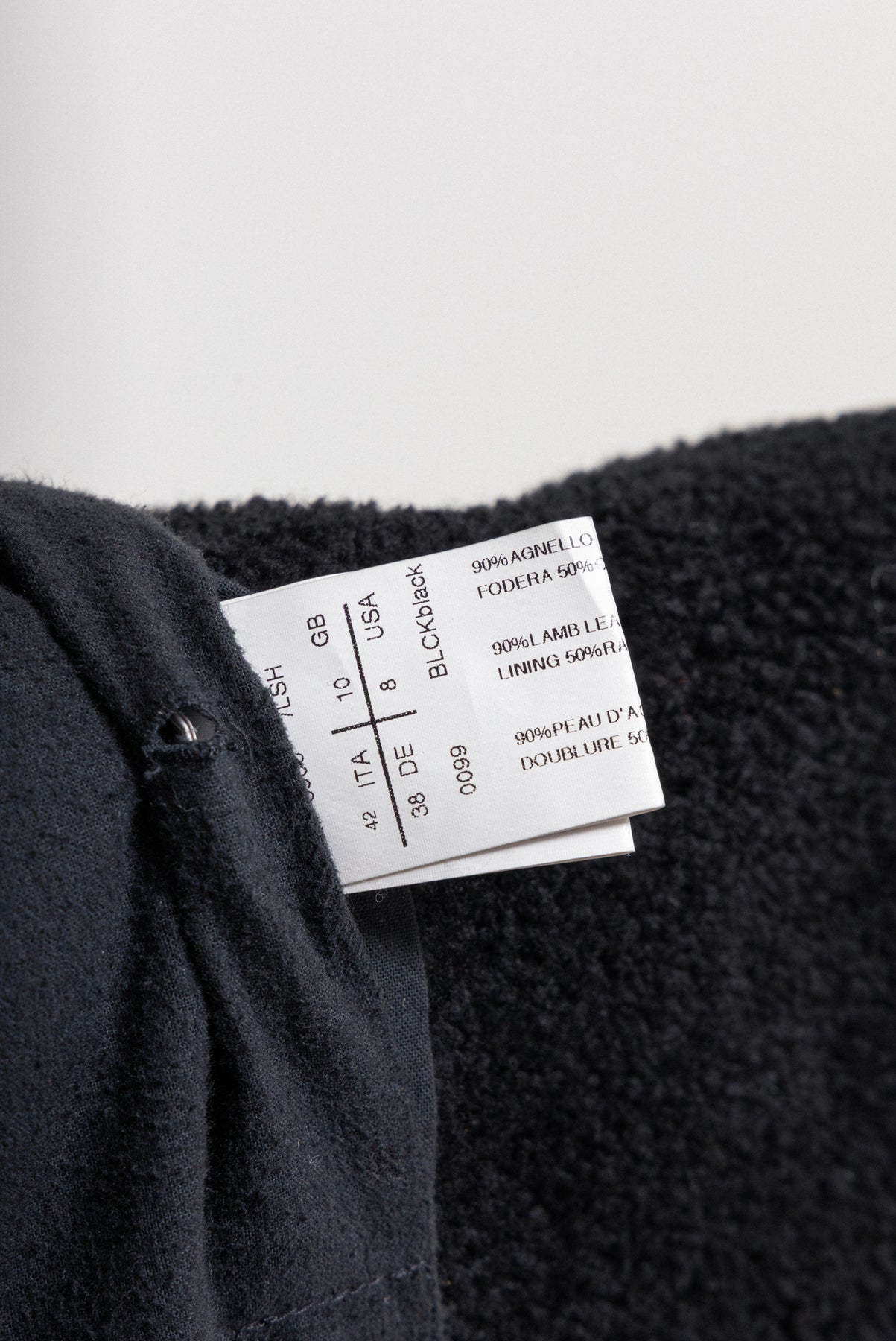Amazing jacket made of lamb leather with different textures: matte suede main body and grainy textured sleeves with a subtle sheen, featuring matching warm fleece lining. Long cut with elongated tight sleeves, side zipper closure creating a very high standing neck when closed or large falling over lapels showing lining when open. Wool inner arms, zipper pockets each side and at chest.