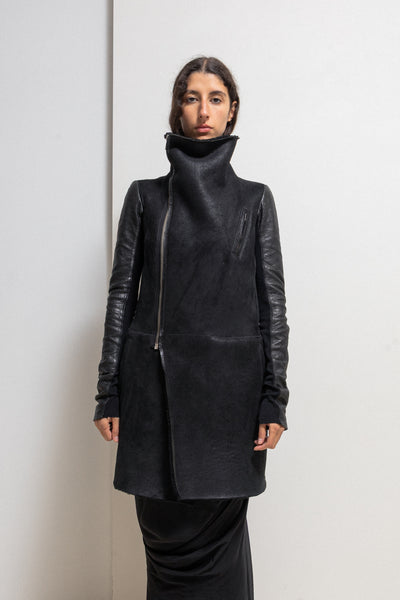 RICK OWENS - FW10 "GLEAM" Lamb leather long jacket with matching fleece and textured sleeves