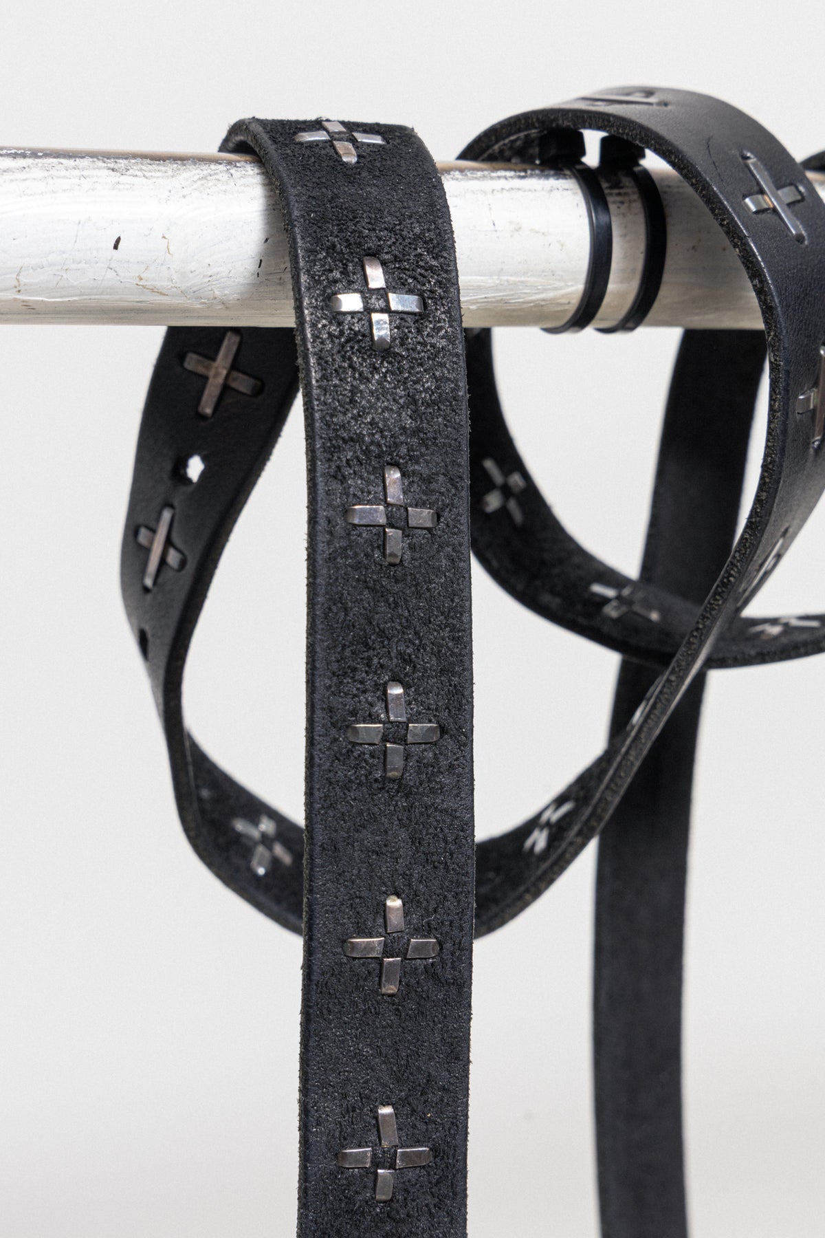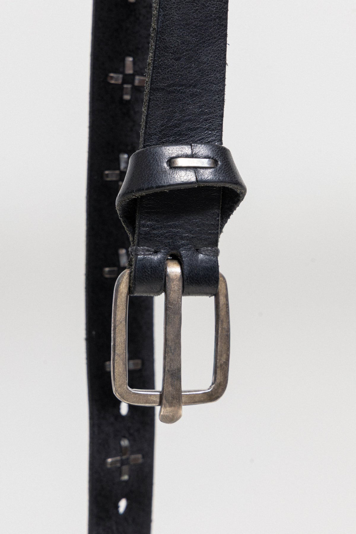 Beautiful extra-long black belt made of cow leather, featuring a Q shaped buckle and the signature crossed silver staples all over.