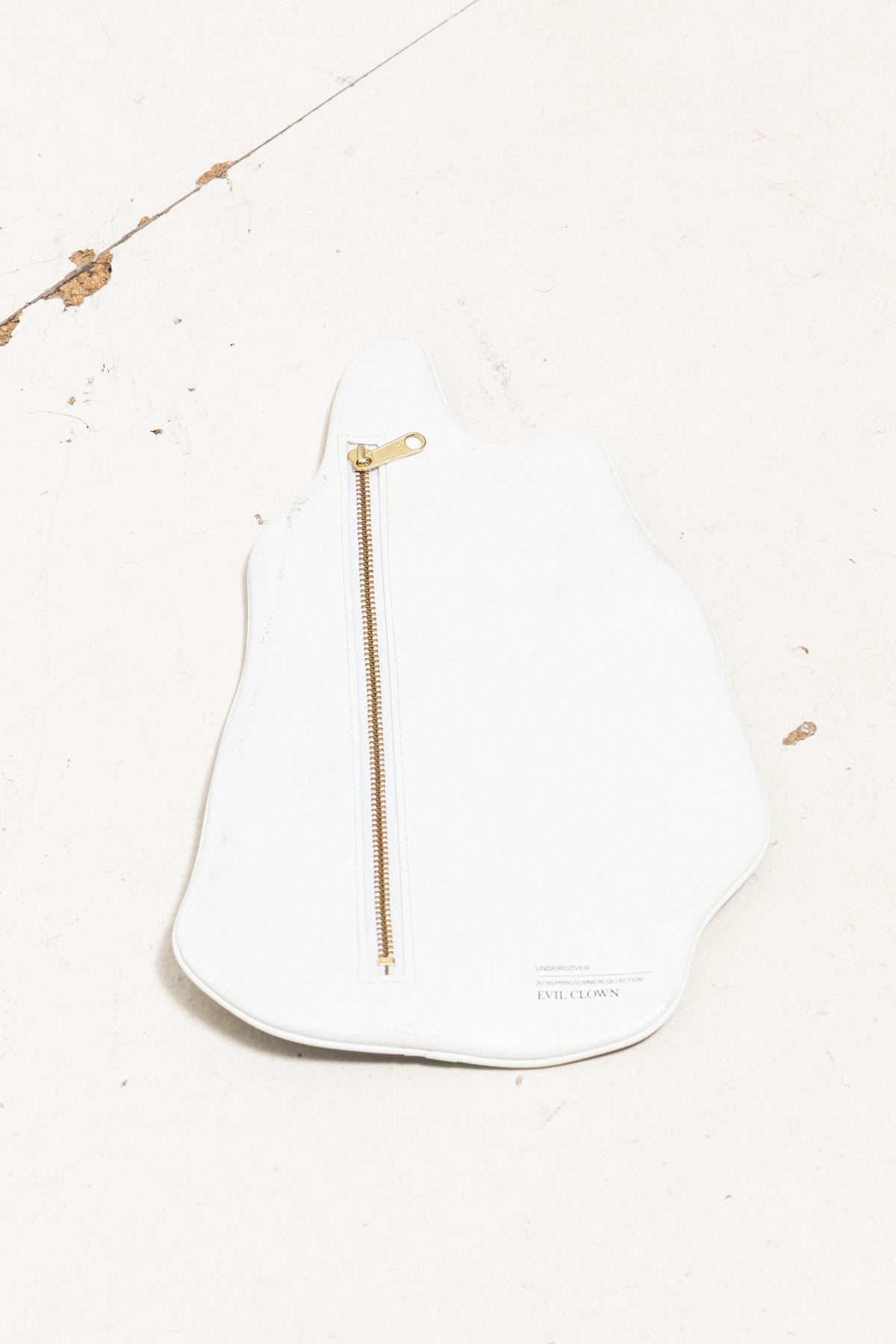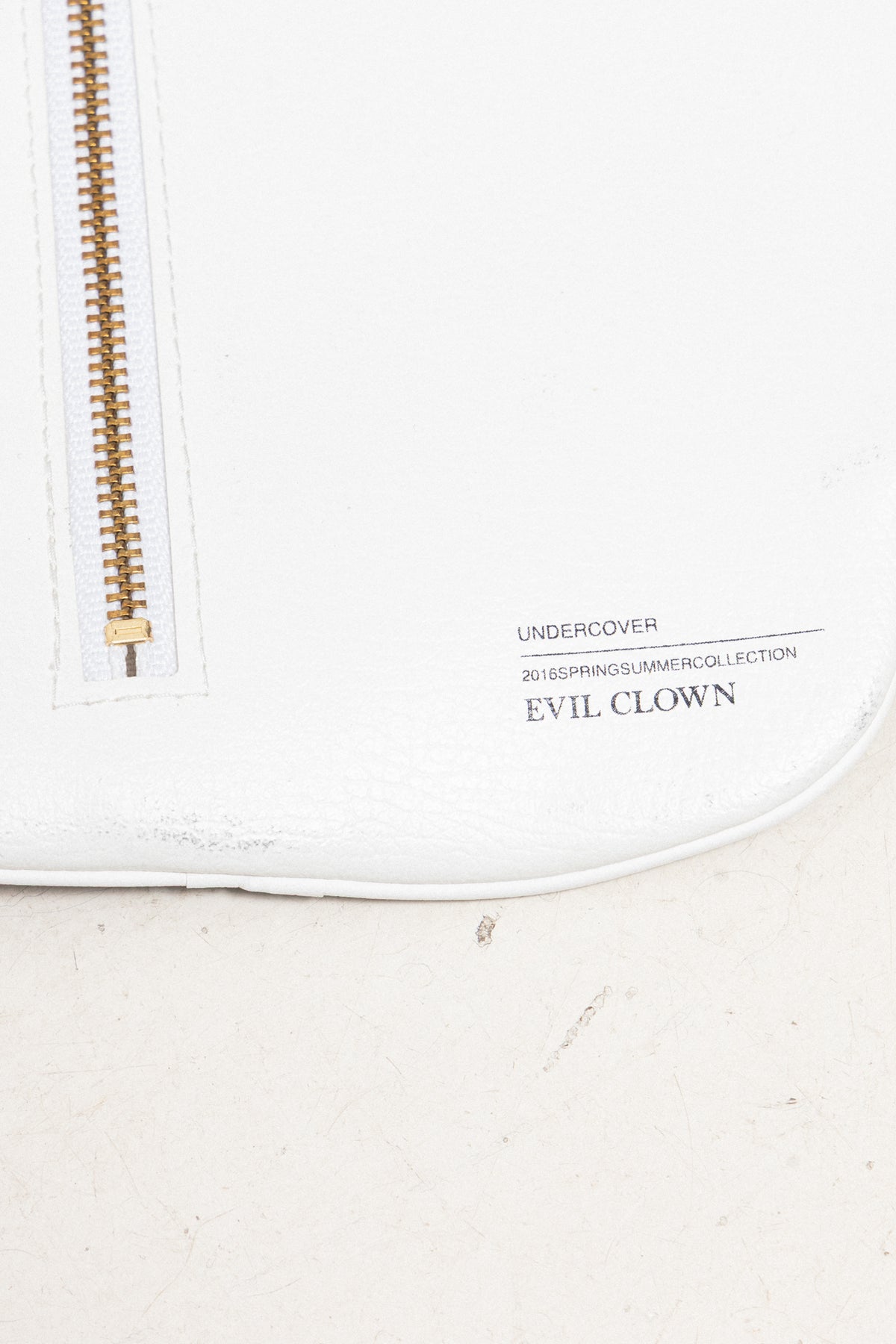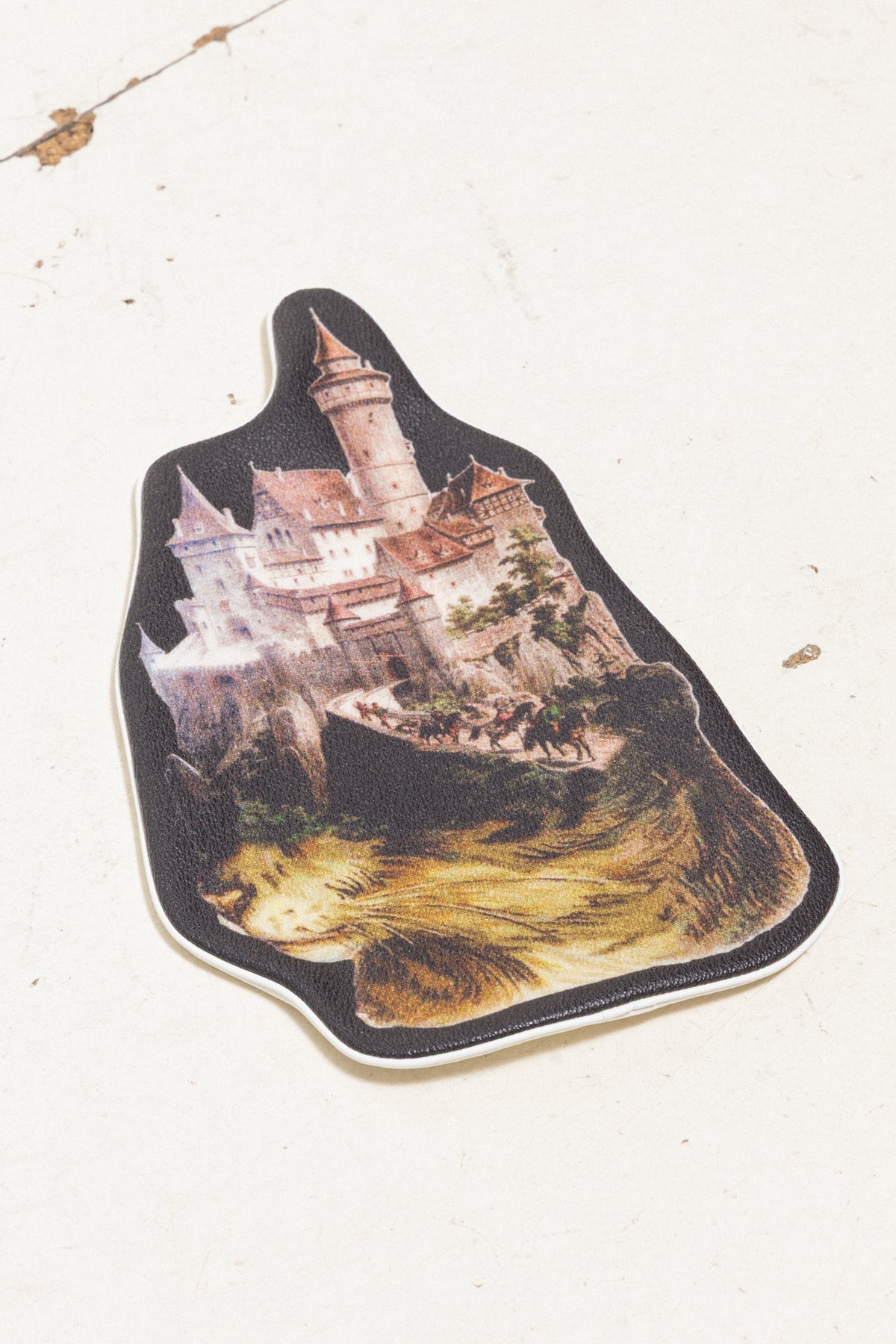 Very cute black and white pouch made of leather that features a colorful and detailed drawing of a cat and a castle printed on the front of the item. Back zip up opening.