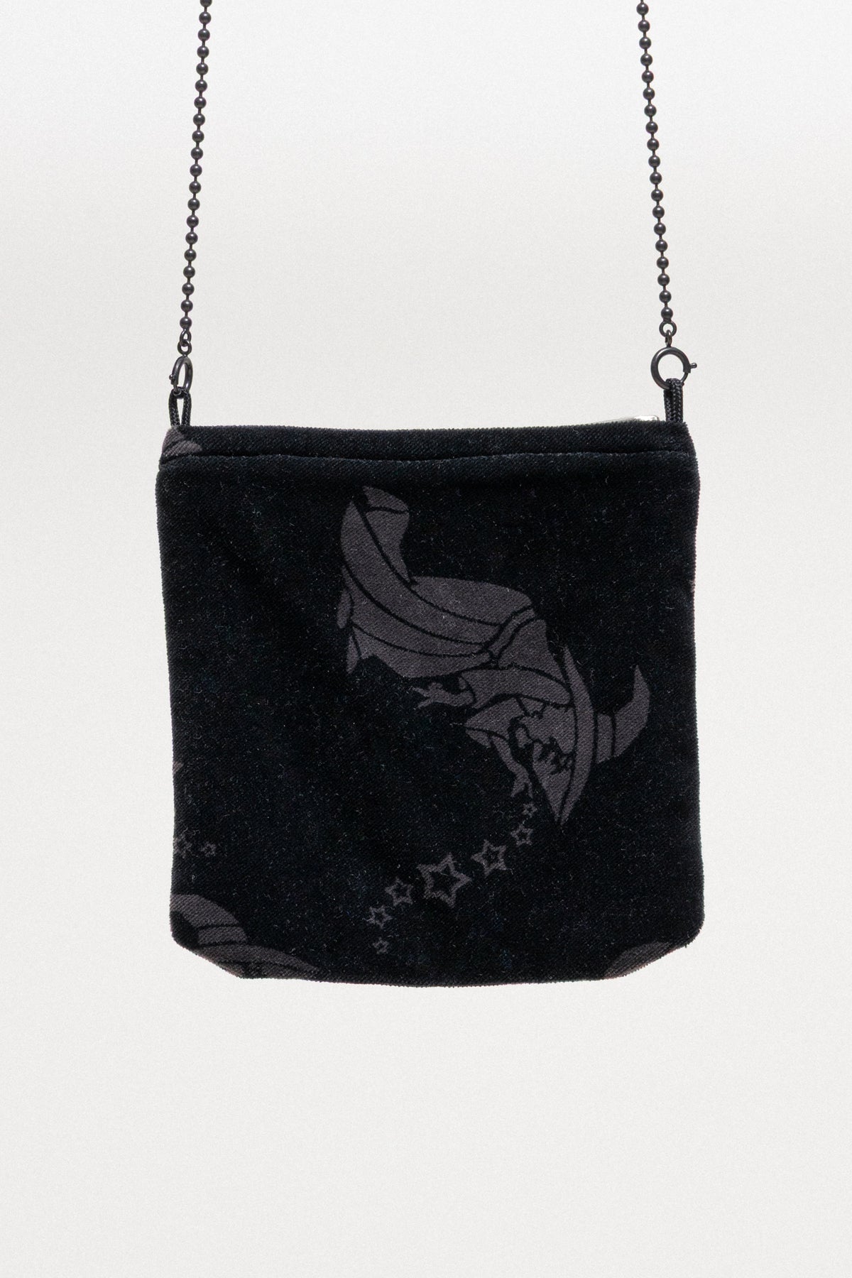 Very cute mini bag made of a soft velvet fabric, featuring a discreet flying witch pattern. Small format with a zipper closure, thin ball chain handle.