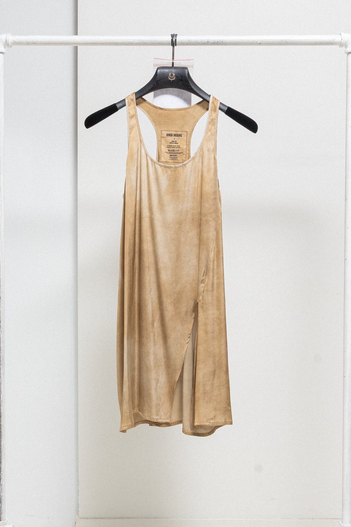 Incredible long sleeveless top made of a light and soft blended fabric, featuring a slightly spiraling side slit and washed effect. Round piped neckline. Narrow back. Piped armholes.