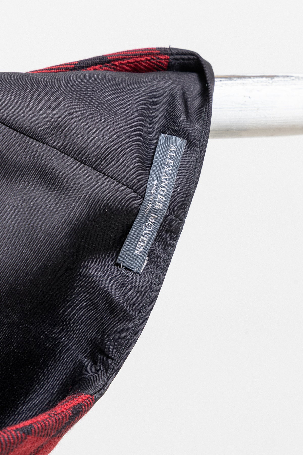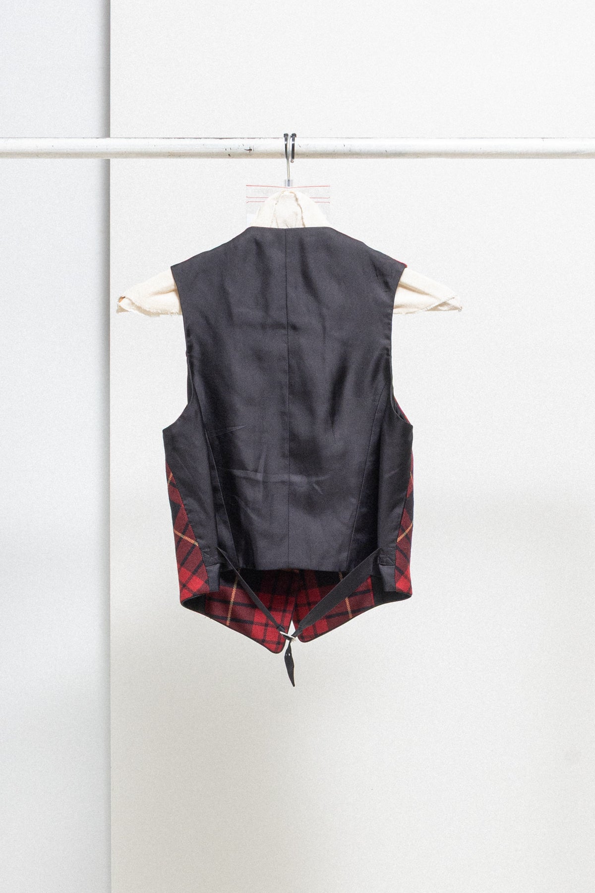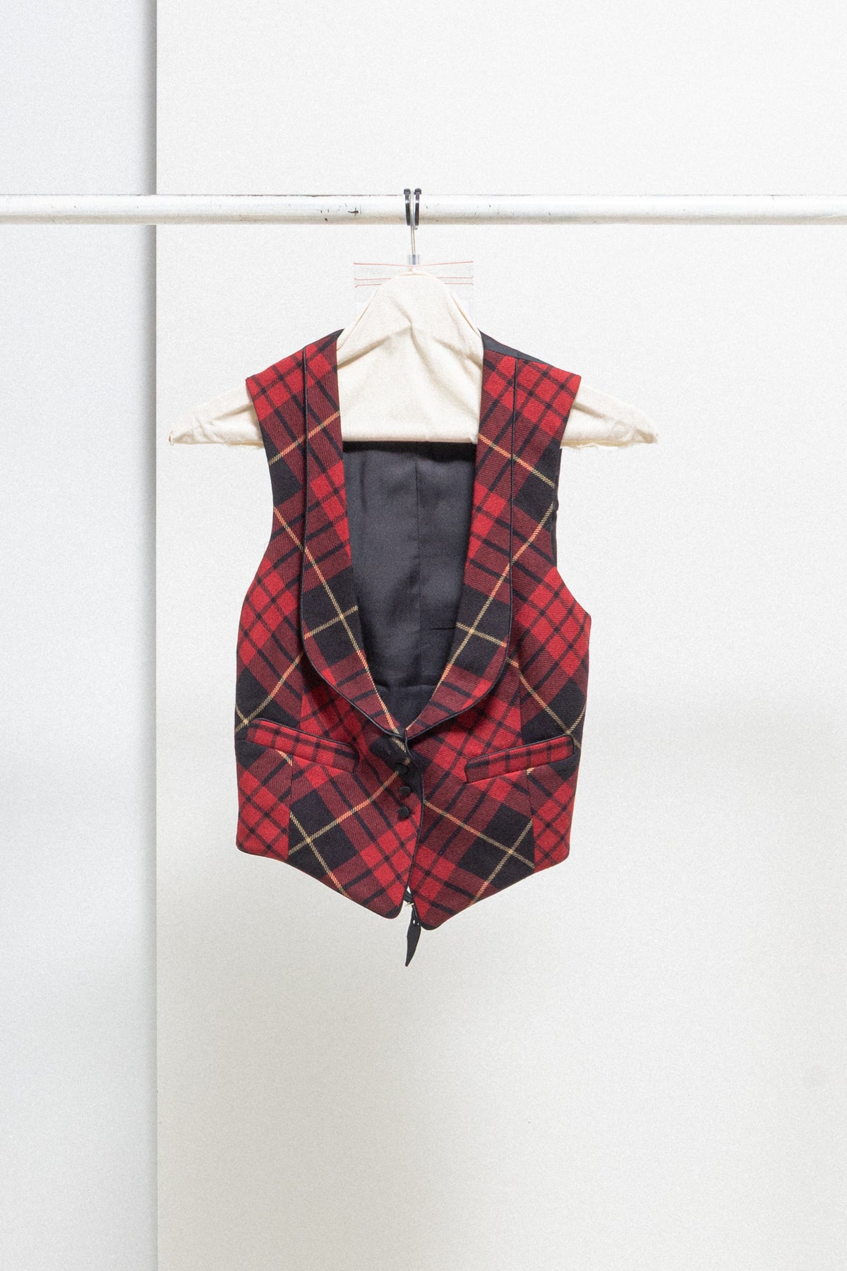 Amazing waistcoat made of a soft wool fabric with McQueen's heritage tartan pattern, featuring a satin back with a small buckled strap. Plunging neck with shawl lapels wider on the bottom part, front closure with fabric covered buttons, welt pockets each side.