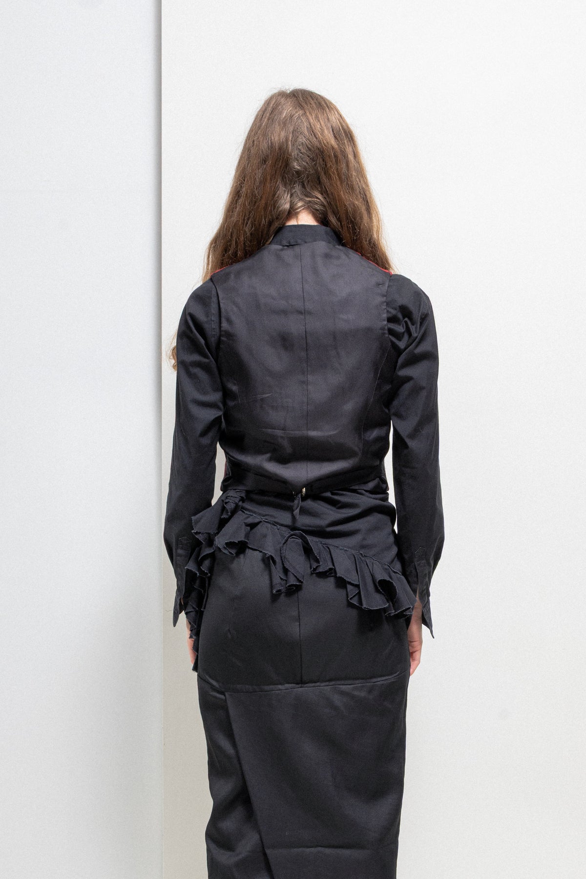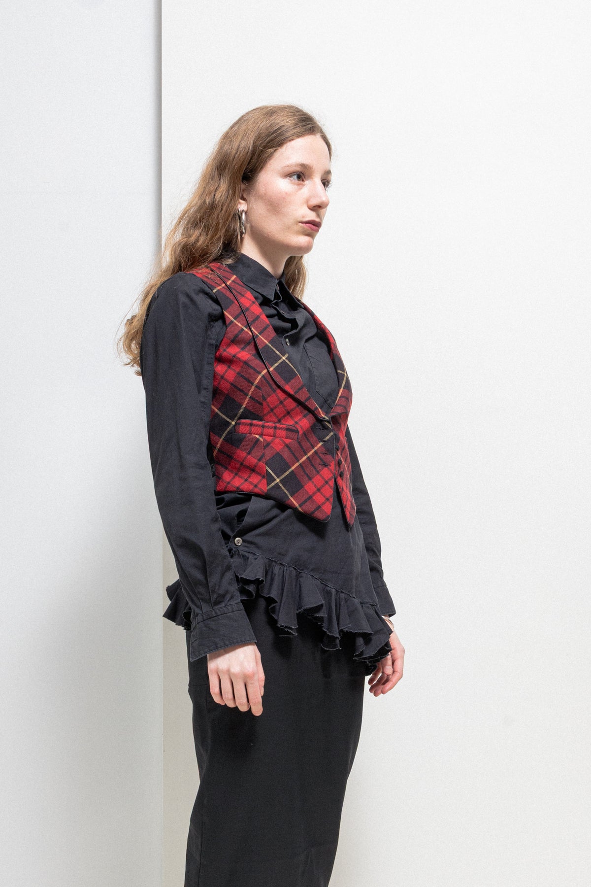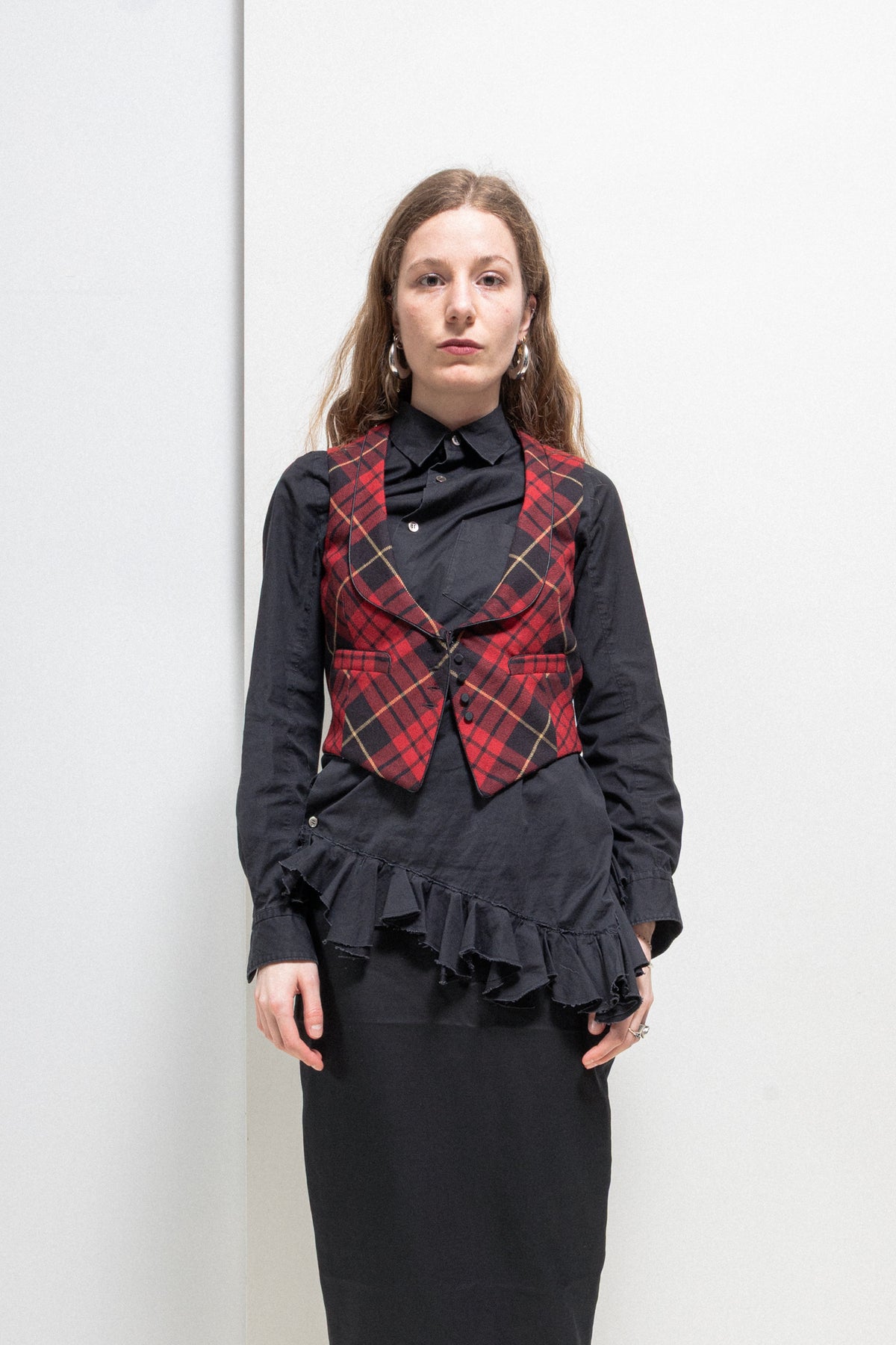 Amazing waistcoat made of a soft wool fabric with McQueen's heritage tartan pattern, featuring a satin back with a small buckled strap. Plunging neck with shawl lapels wider on the bottom part, front closure with fabric covered buttons, welt pockets each side.