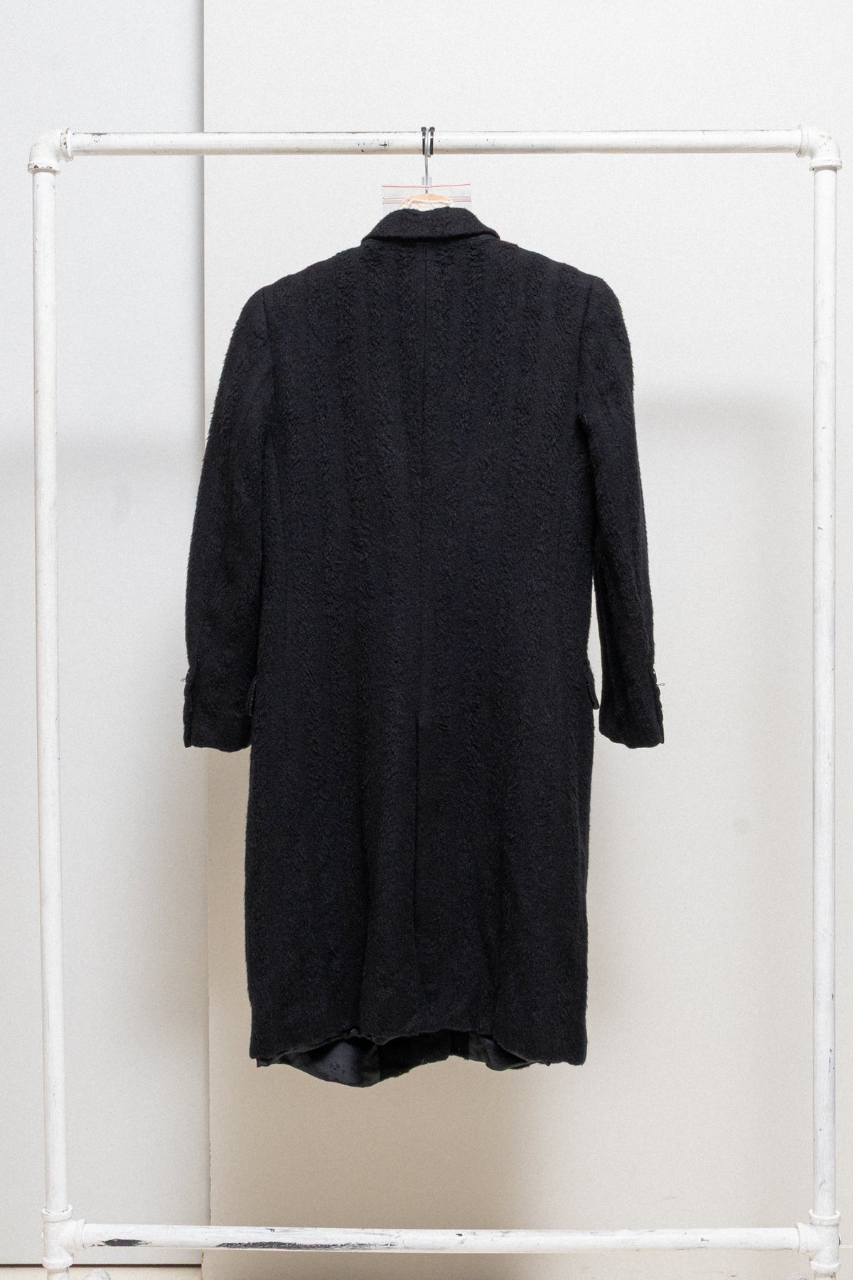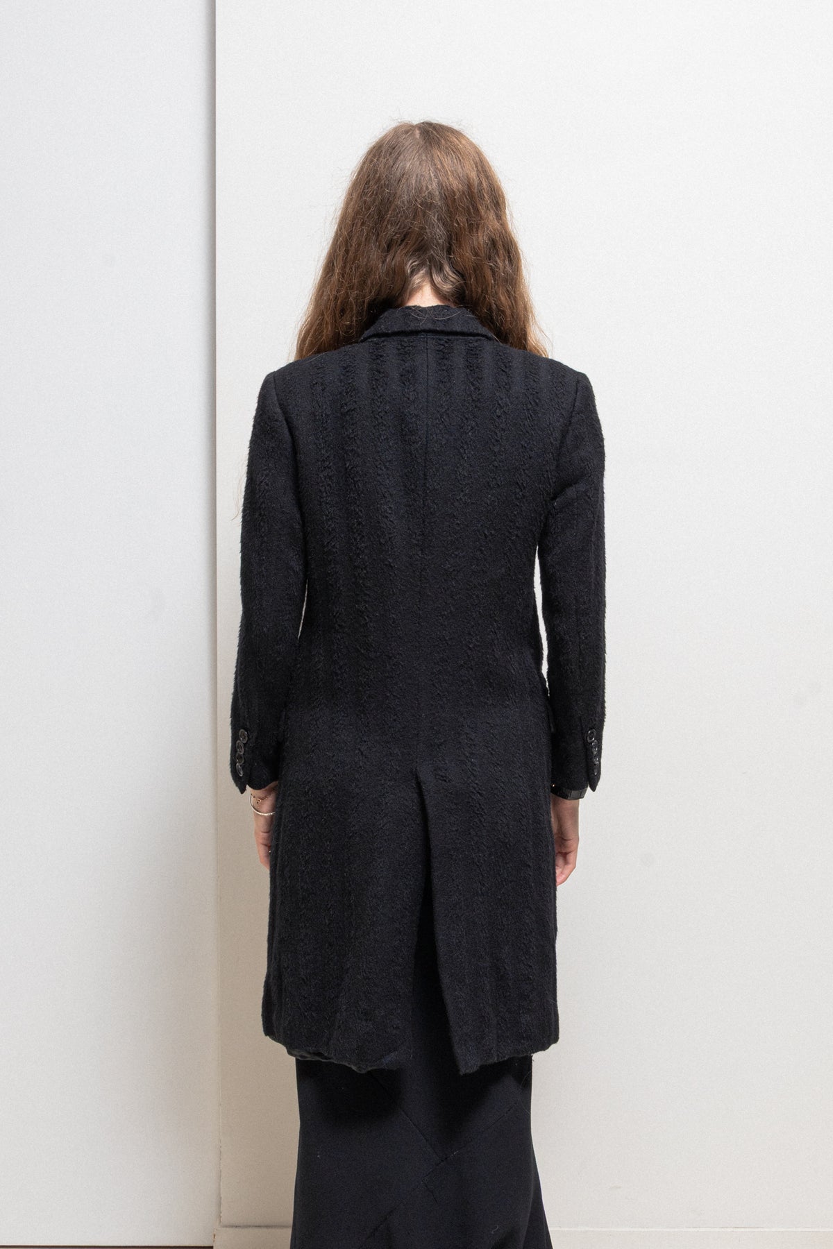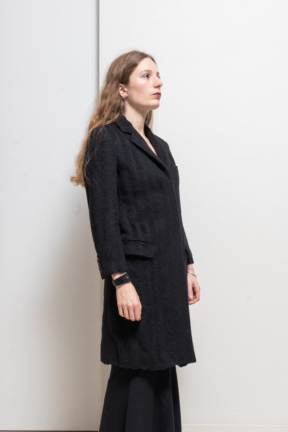 Amazing black coat made of a thick textured mohair wool fabric with a tonal striped pattern, featuring notch lapels with a button hole detail on one. Regular cut with invisible closure on the front with three buttons, cuff splits with buttoning, a flap pocket each side, a chest pocket and a back slit. Lined, inside pockets.