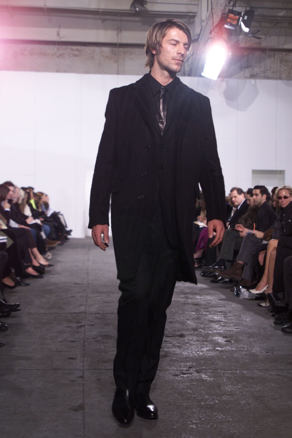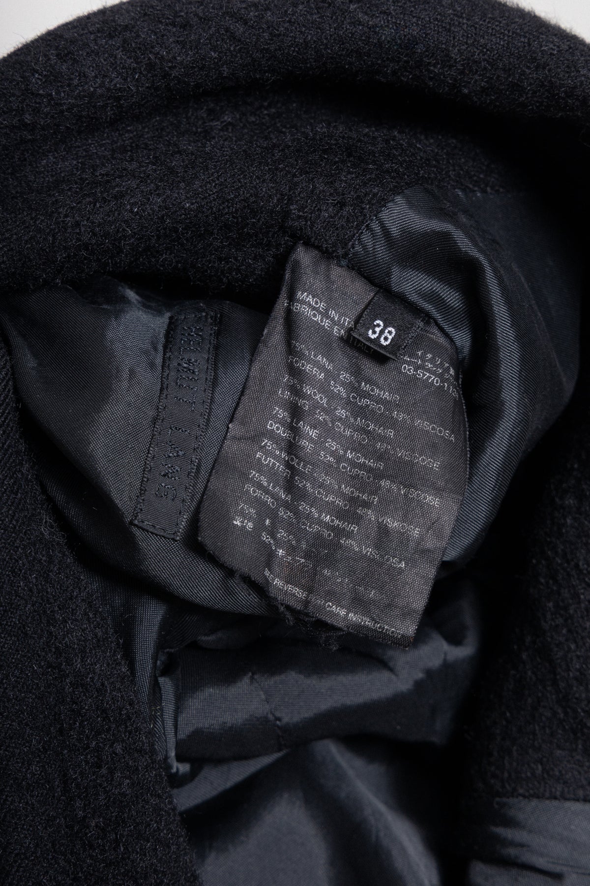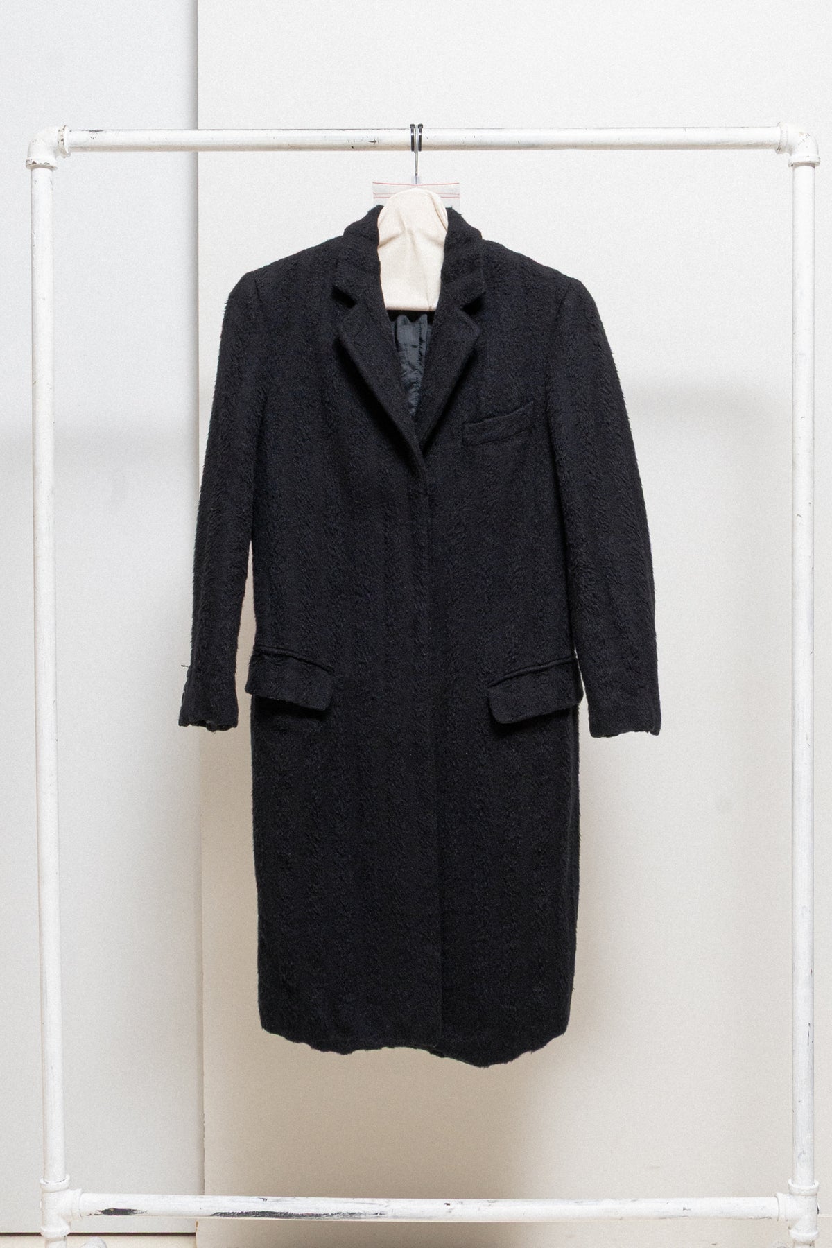 Amazing black coat made of a thick textured mohair wool fabric with a tonal striped pattern, featuring notch lapels with a button hole detail on one. Regular cut with invisible closure on the front with three buttons, cuff splits with buttoning, a flap pocket each side, a chest pocket and a back slit. Lined, inside pockets.