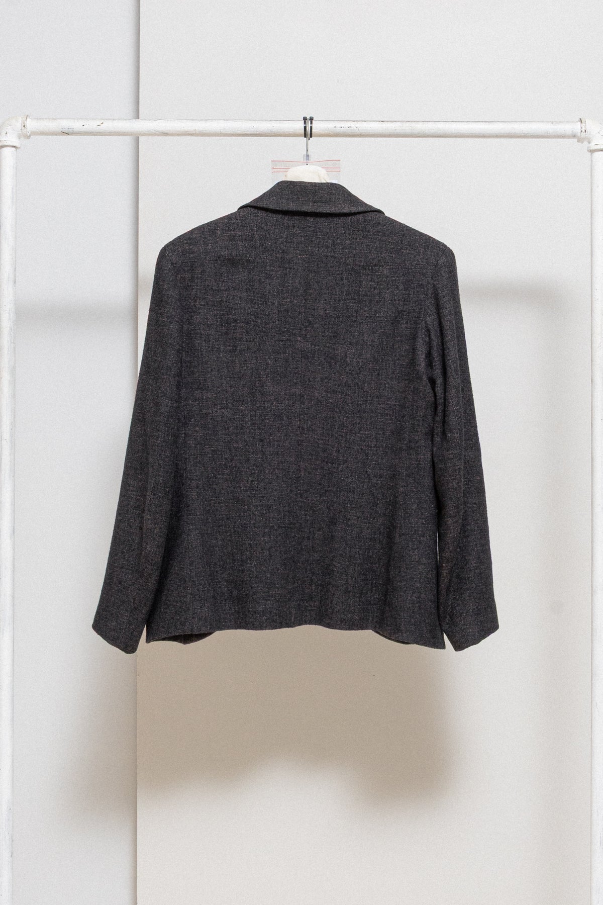 Beautiful jacket made of a textured wool and linen blend, featuring horizontal peak lapels making the collar flare out. Close to the body open cut with slightly cinched waist. Fully lined. Simple yet vey elegant piece !