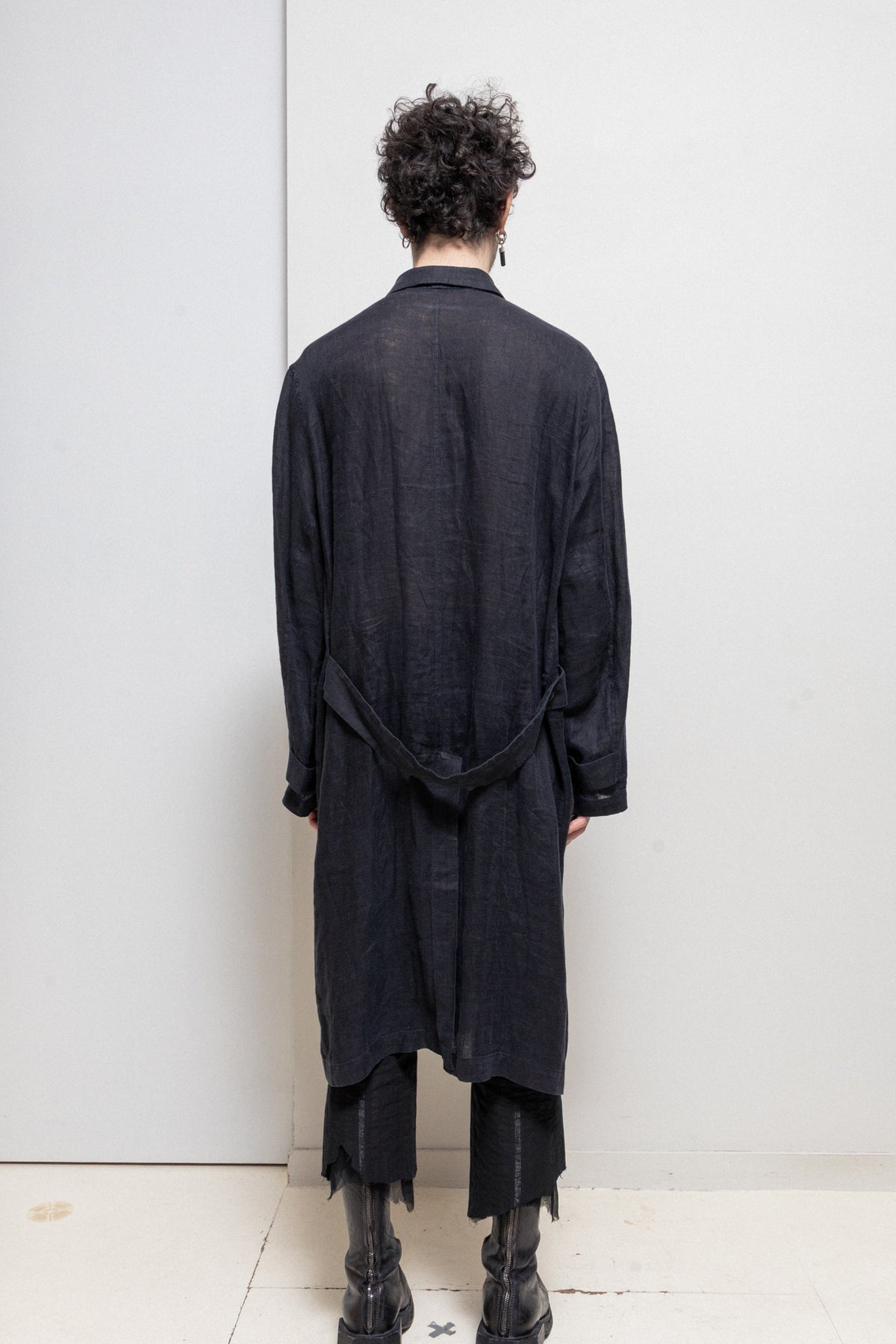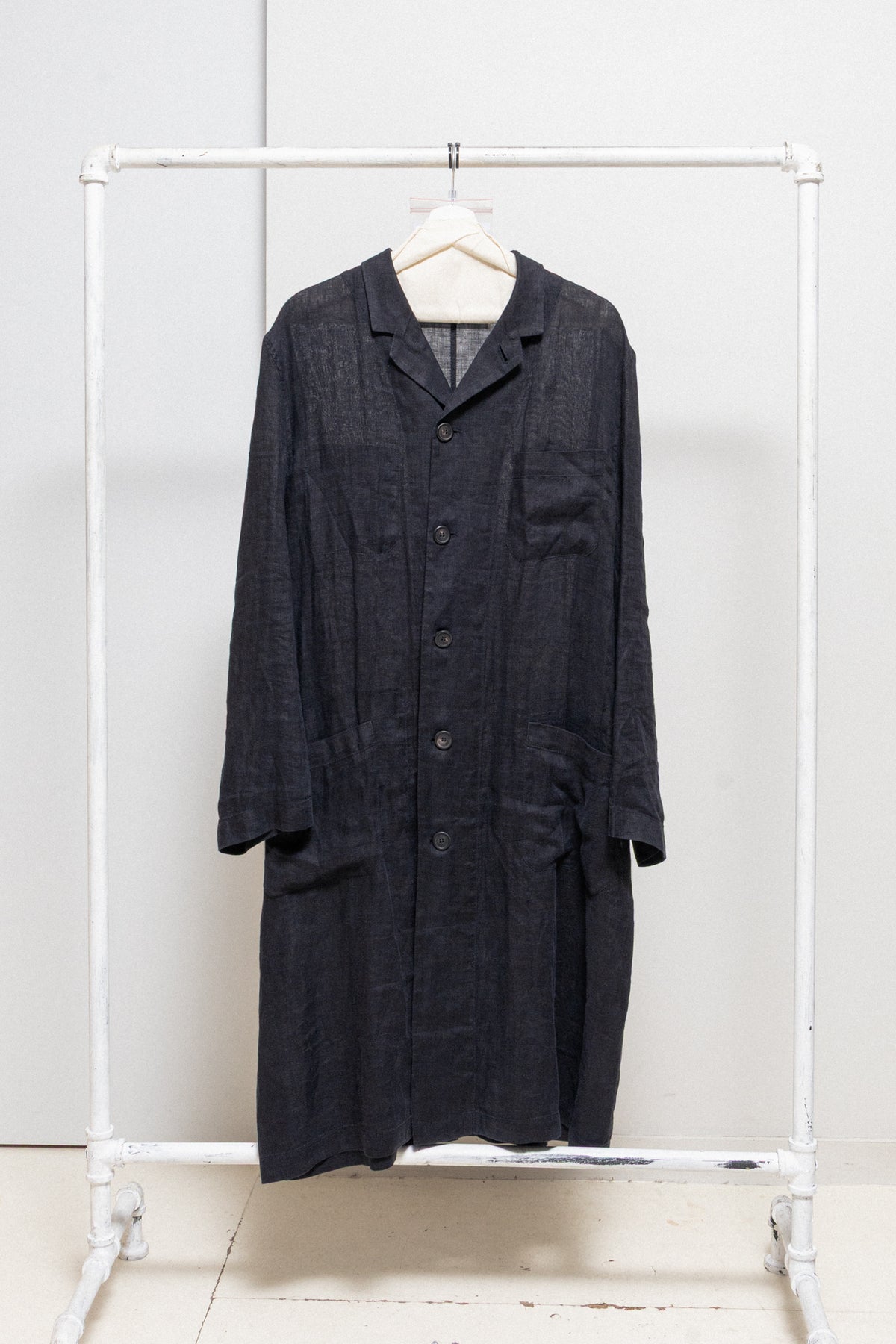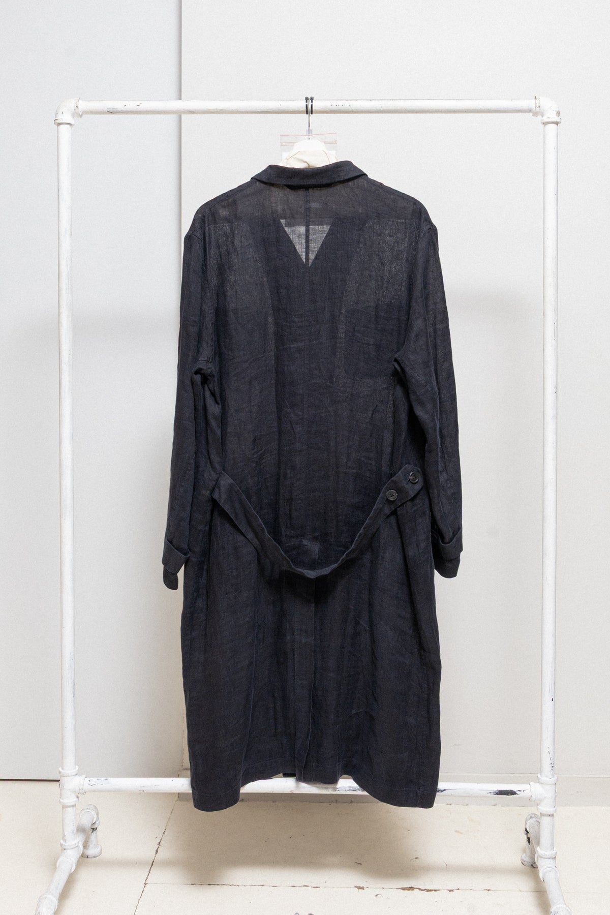 Beautiful long jacket made of a thin textured linen, featuring a back belt strap with buttons. Regular shirt-like cut with button up closure to make a high standing neckline, adjustable cuff buttoning with straps, a back slit, a patch pocket each side and a chest pocket.