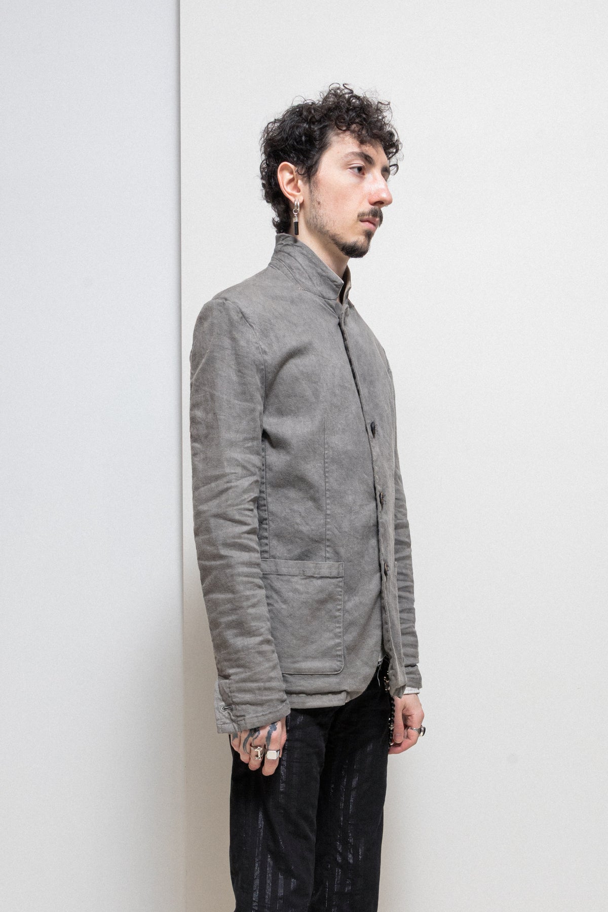 Beautiful blazer made of a thin textured linen and cotton blend in a washed grey color, featuring cow leather upper collar parts. Regular cut with a three-button closure, notch lapels, structuring darts, single cuff buttoning and a patch pocket each side.