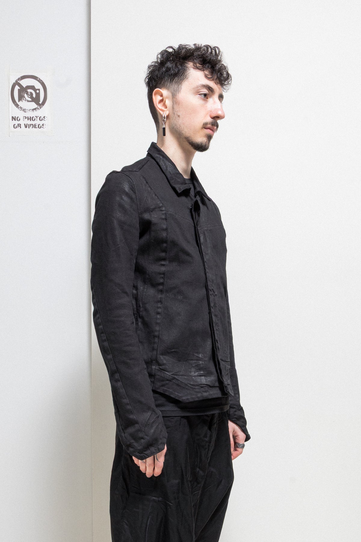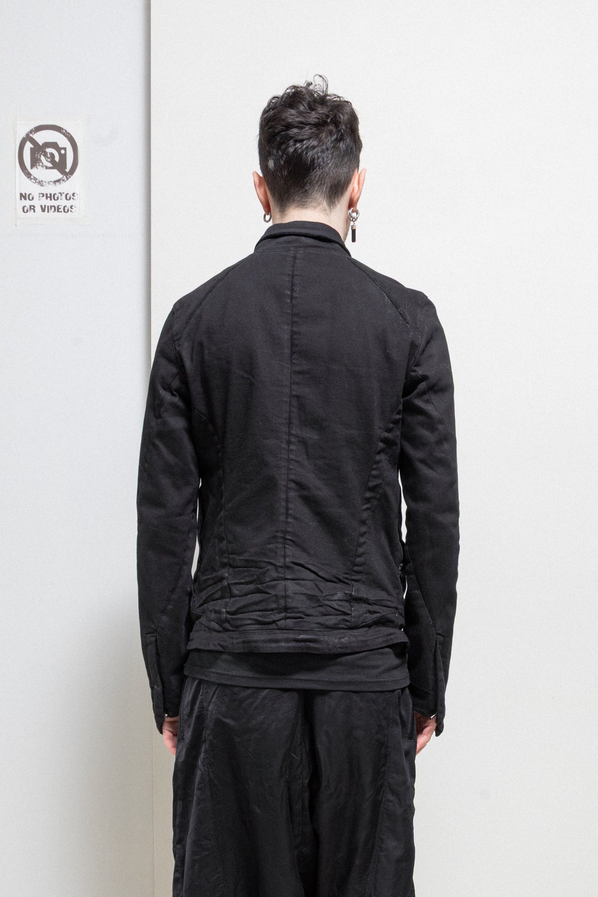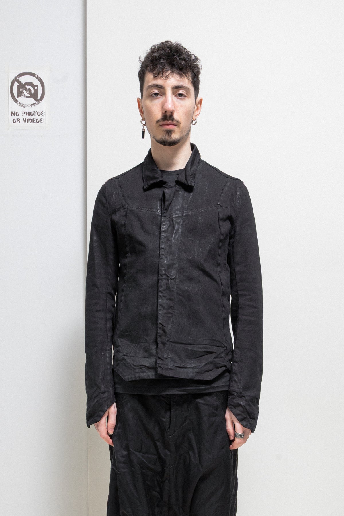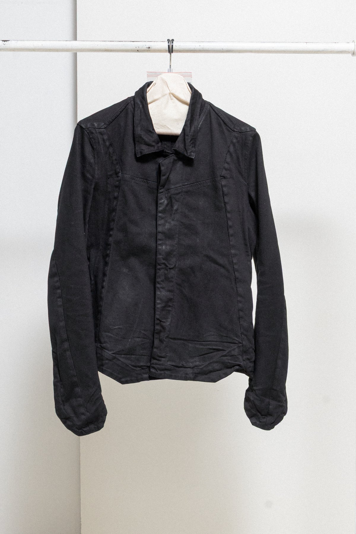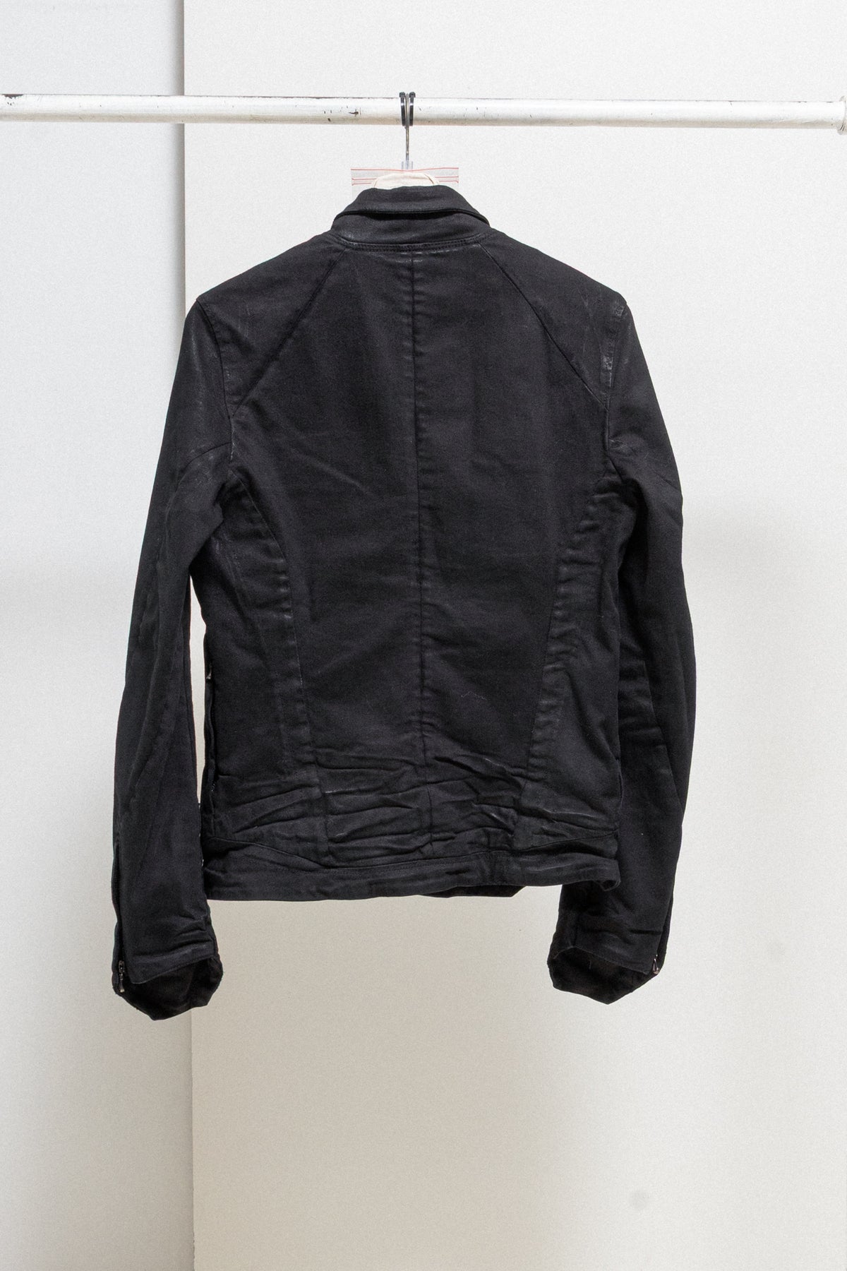 Incredible light waxed jacket made of textured denim fabric, featuring angular cuffs at the end of the arms with zipper slits as well as a geometrically shaped bottom edge of the garment. Front and shoulder angular panels detail. Shirt collar. Front closure with five buttons. Side zip up pockets. No lining.