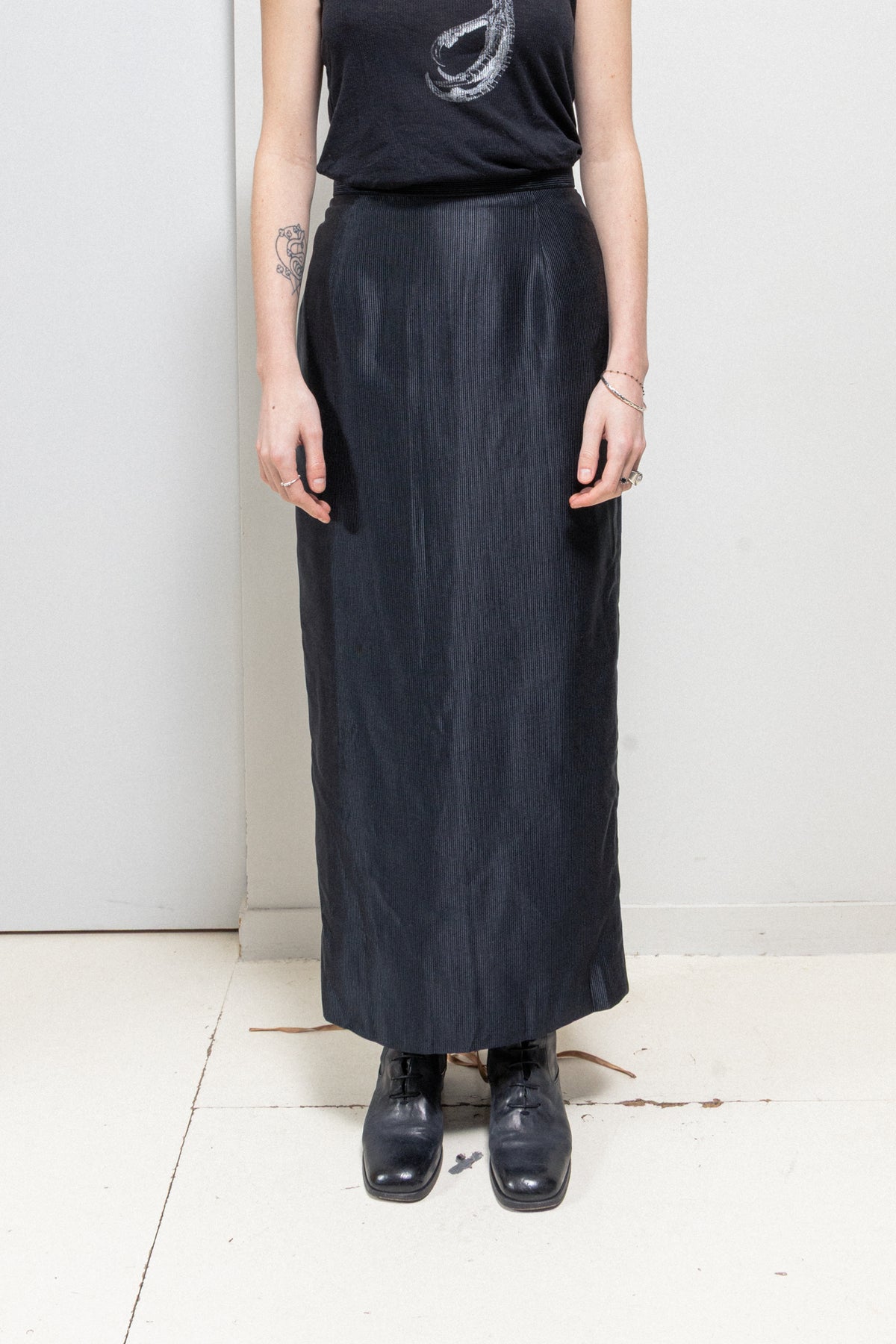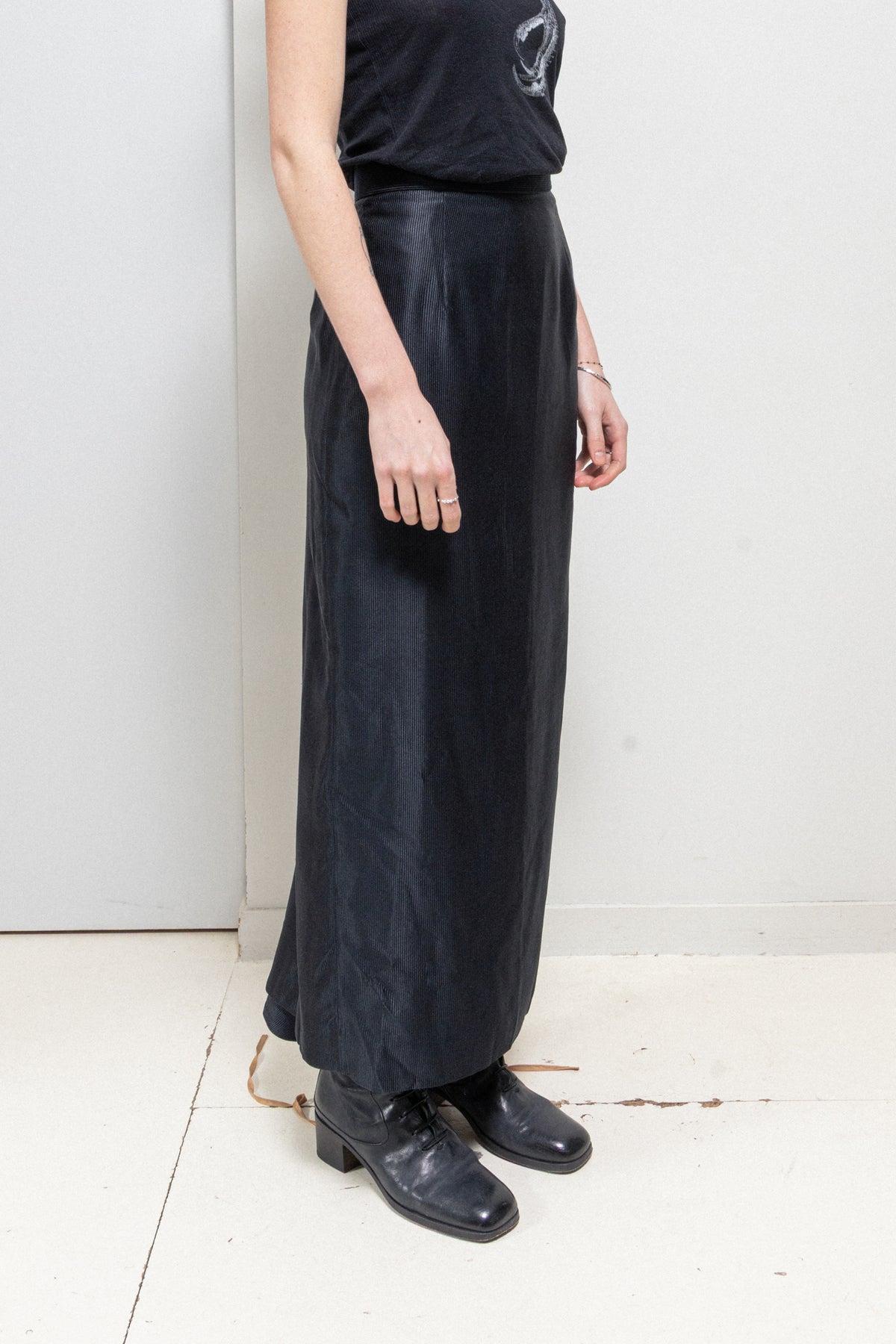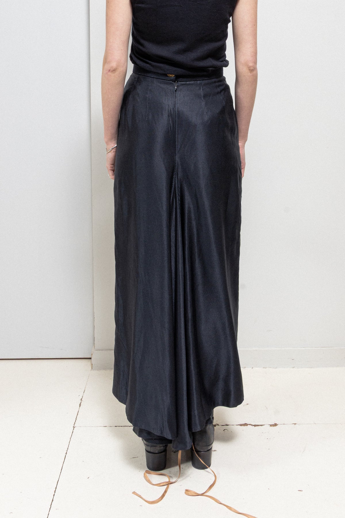 Fantastic black skirt made of a light, shiny and soft ribbed silk fabric, featuring a beautifully draped front and a signature orb design of the house engraved on a golden button that serves as the back closure with the help of an invisible zipper. Signature pink back lining with strings detail falling out of the bottom edge.