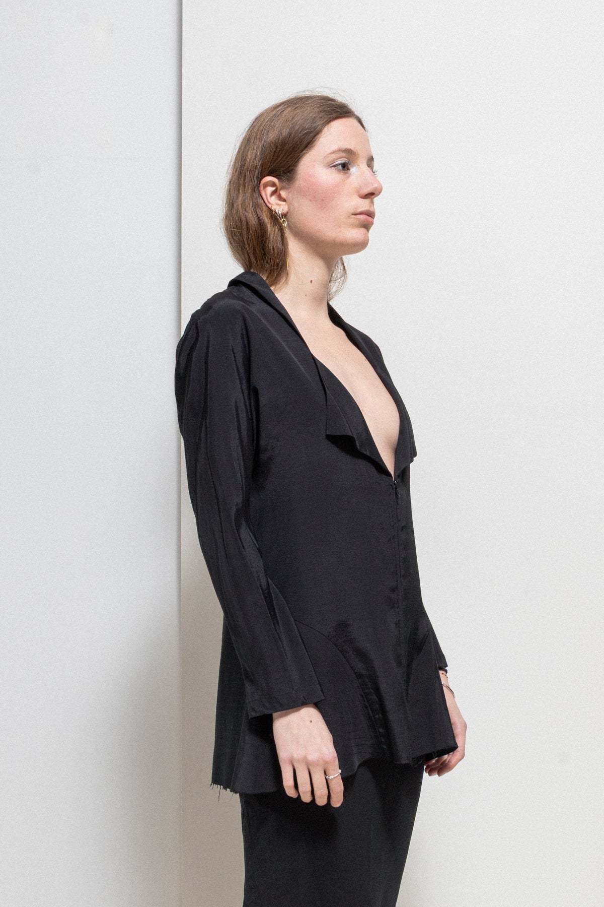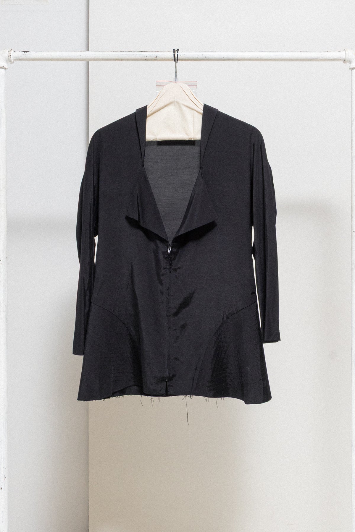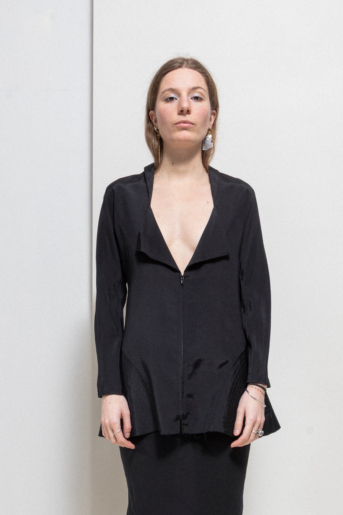 Beautiful jacket made of a thin and lightweight rayon fabric, featuring a thin zipper closure at front, stopping just under the chest creating a wide opening with small lapels falling down. Flattering silhouette with a cinched waist and flared sides, featuring embroidered lines.