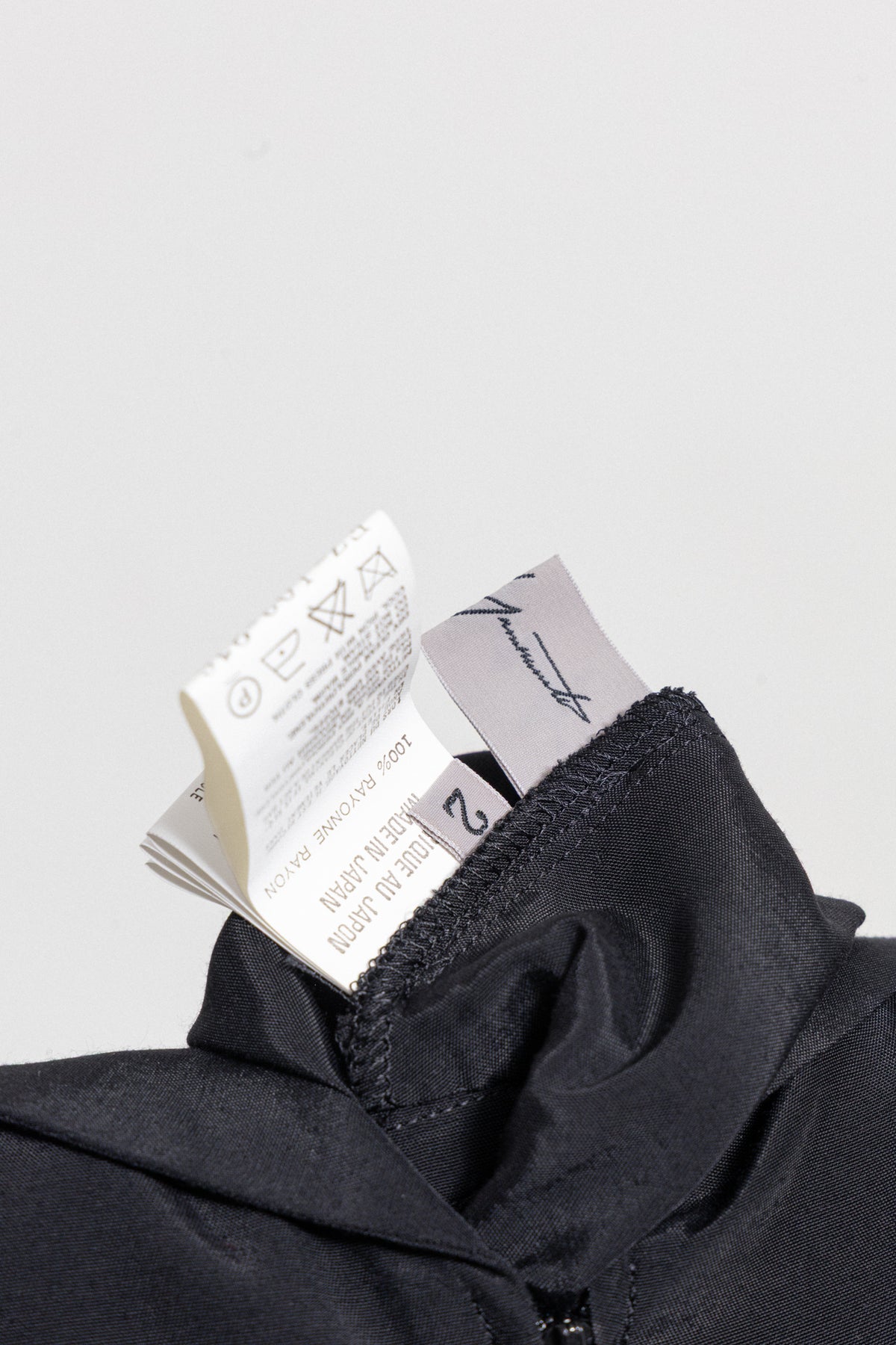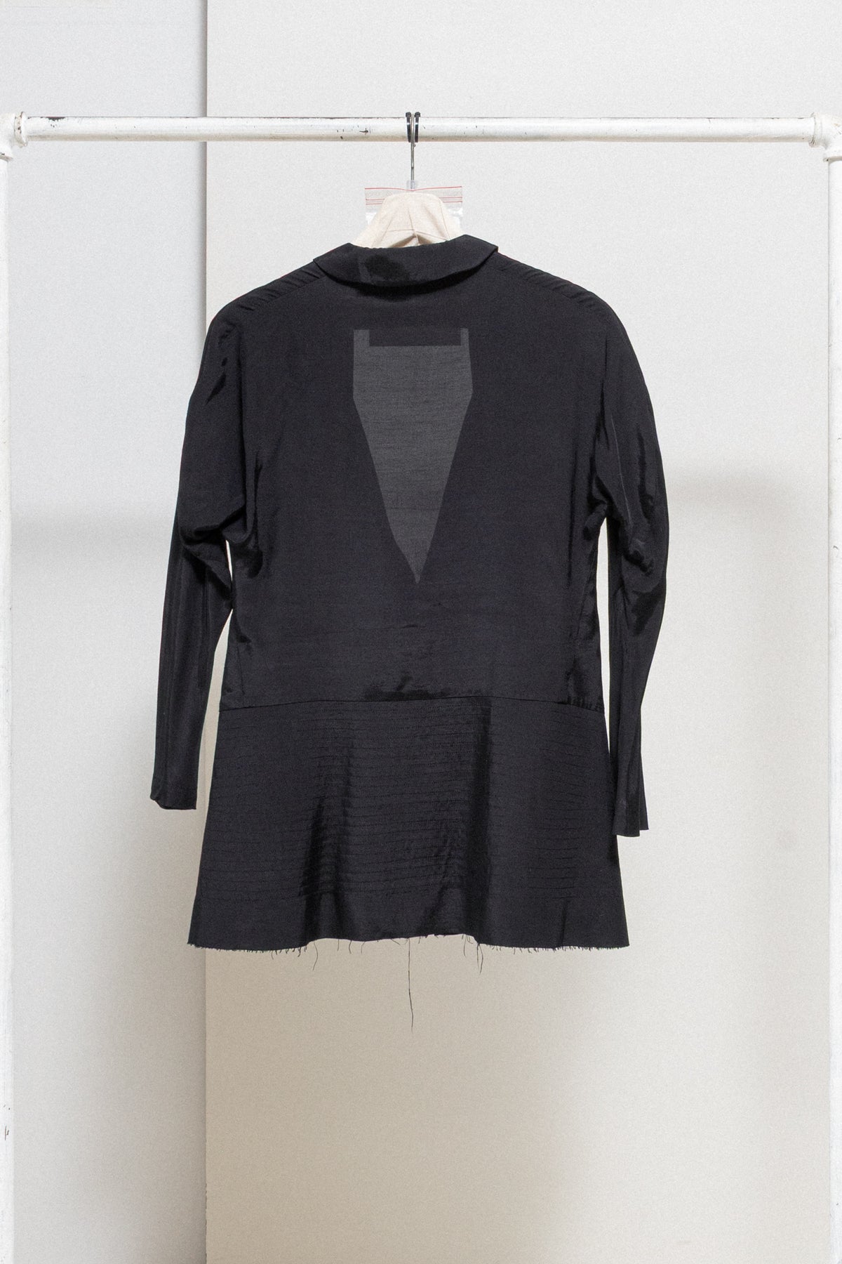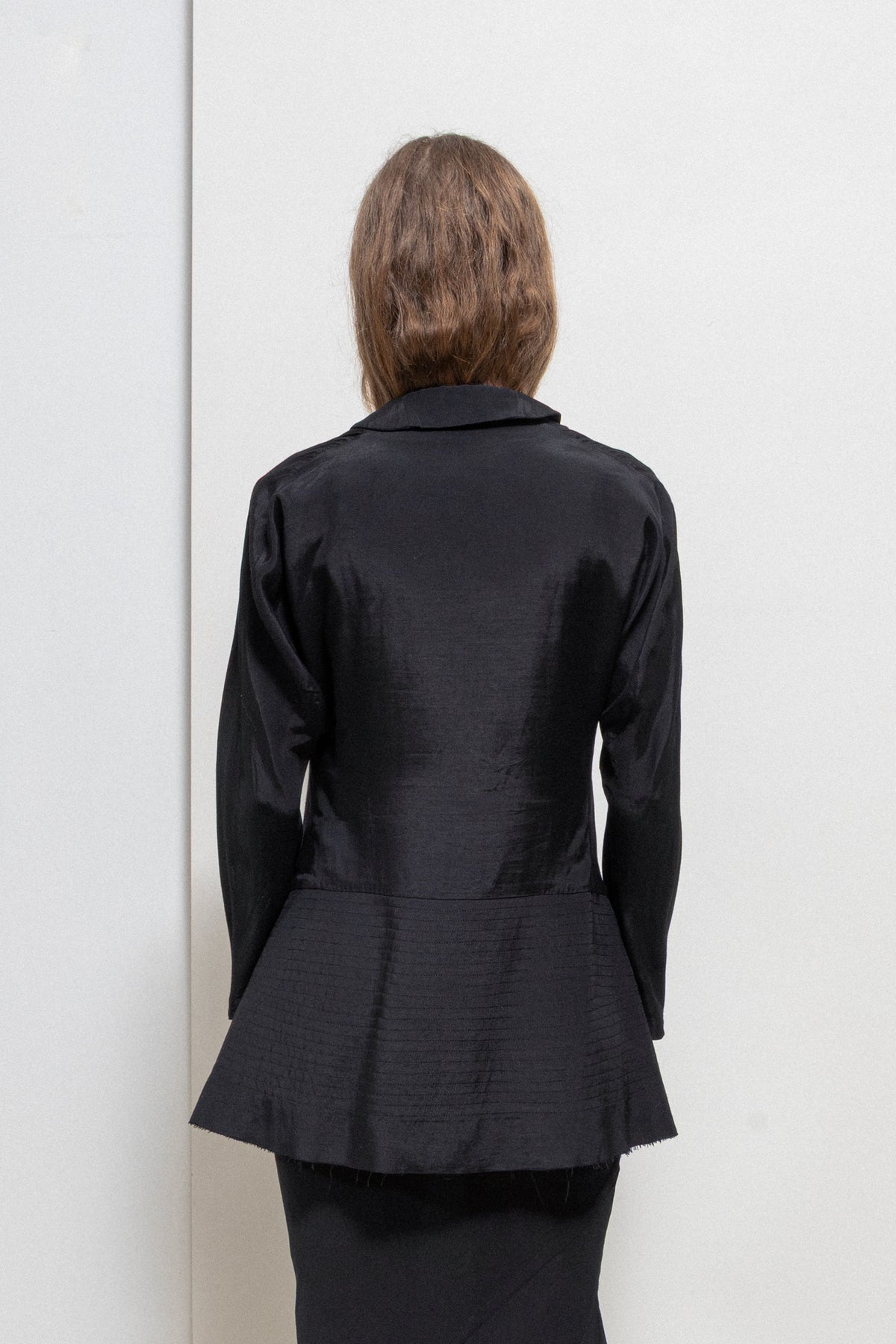Beautiful jacket made of a thin and lightweight rayon fabric, featuring a thin zipper closure at front, stopping just under the chest creating a wide opening with small lapels falling down. Flattering silhouette with a cinched waist and flared sides, featuring embroidered lines.