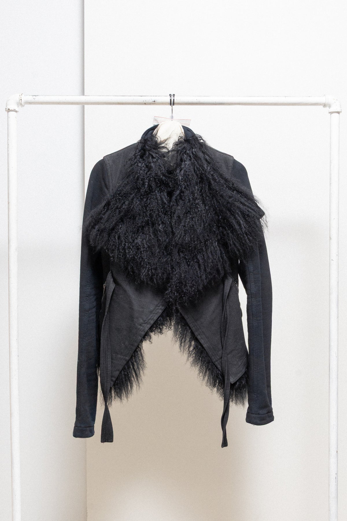 Amazing jacket made of a thick and stretch waxed cotton, featuring wide lapels lined with a very warm and soft mongolian lamb fur, adding more volume. Thick sweater cotton elongated sleeves, cinched waist with straps each side to tie up at front. Cropped back.