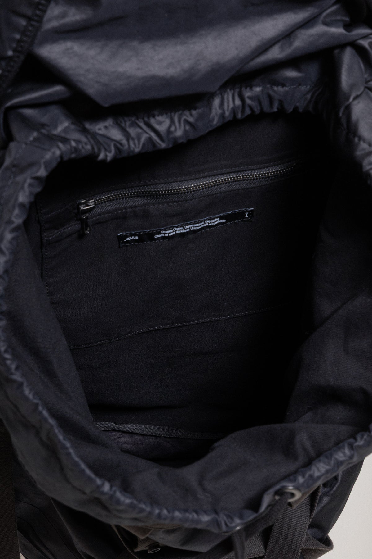 Amazing back made of a matte nylon like fabric with a subtle sheen, featuring two big pockets each side closing with velcro bands, as well as several adjustable straps throughout falling down. Closes thanks to long upper straps linked to the handle, featuring snap buttons to attach to the main body. Large capacity, small zipper pocket inside.