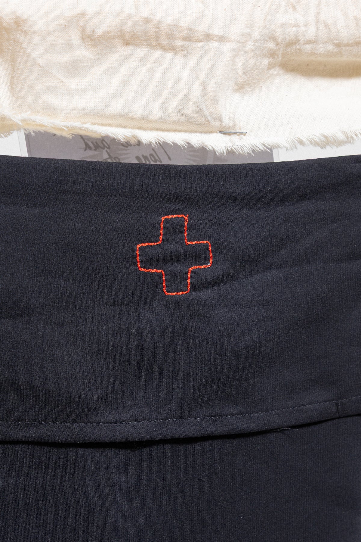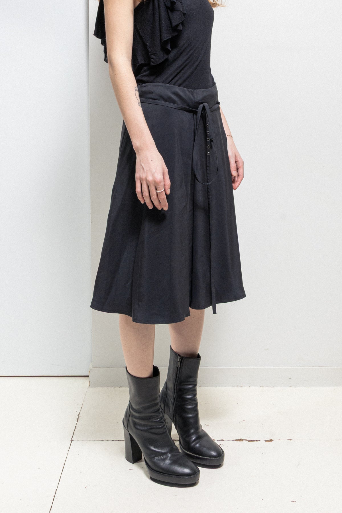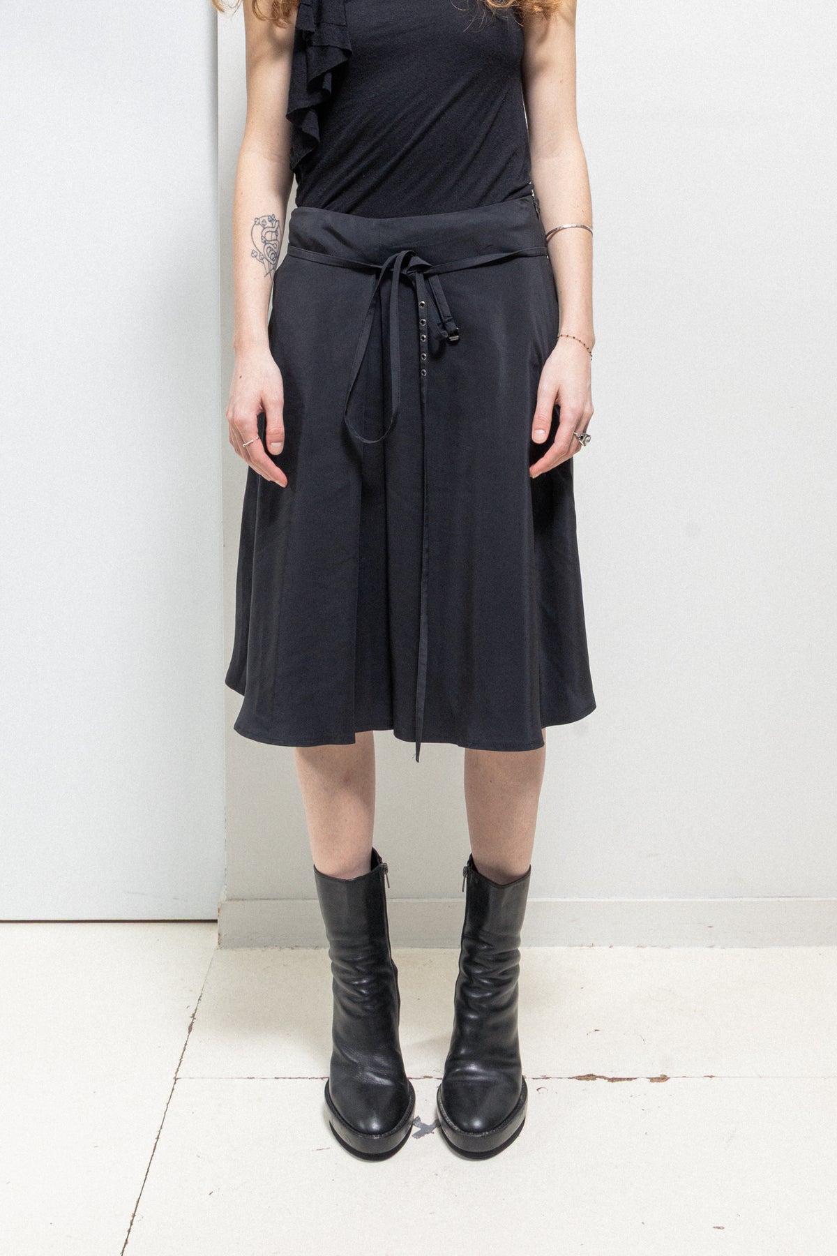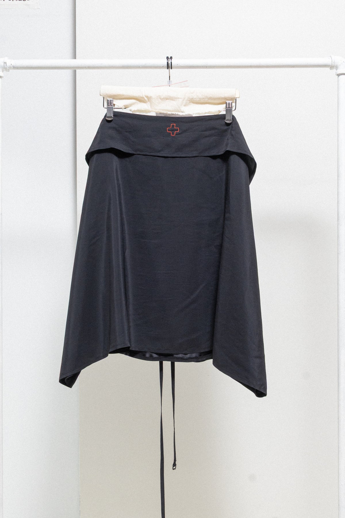 Beautiful midi length skirt made of a soft and lightweight silk fabric. Features wide side panels to wrap up at front thanks to thin and long straps, fastening like a belt with eyelets and metal buckle. Folded waist showing off the signature red cross on the back.