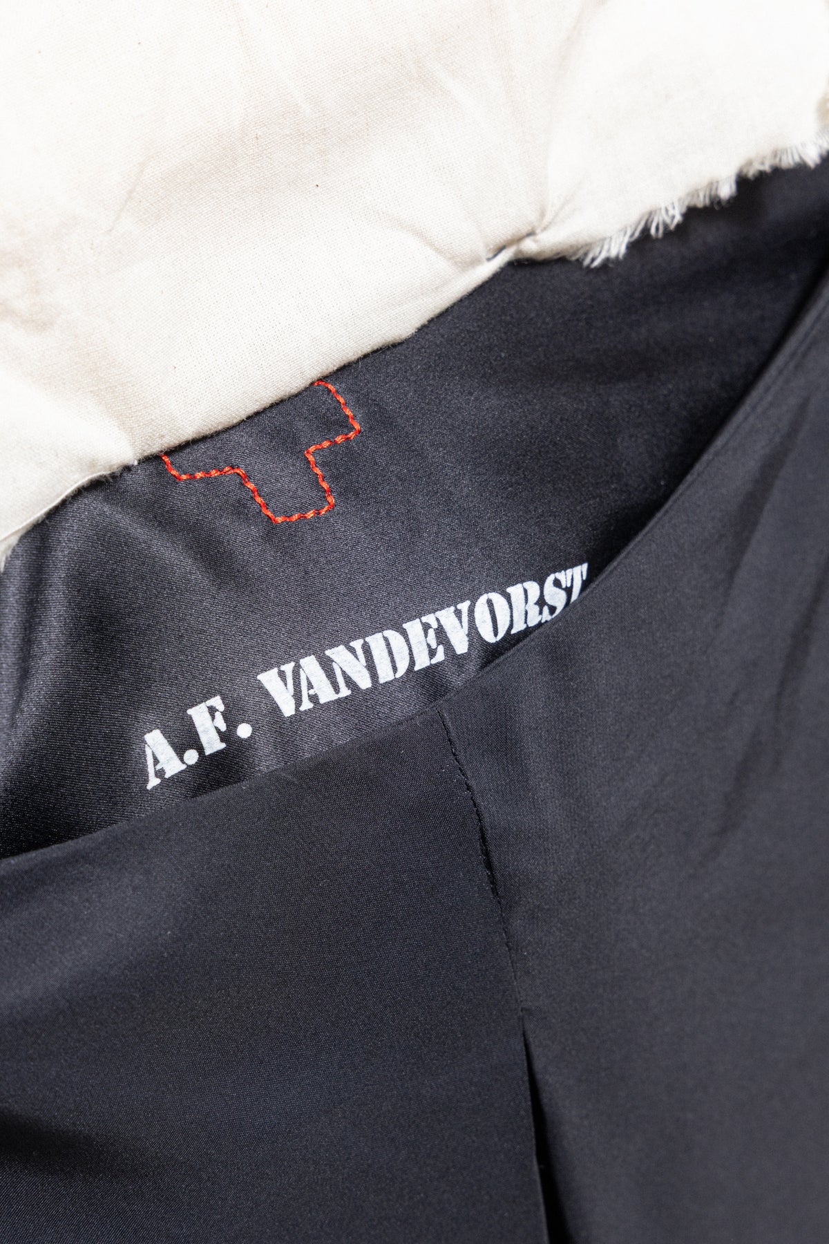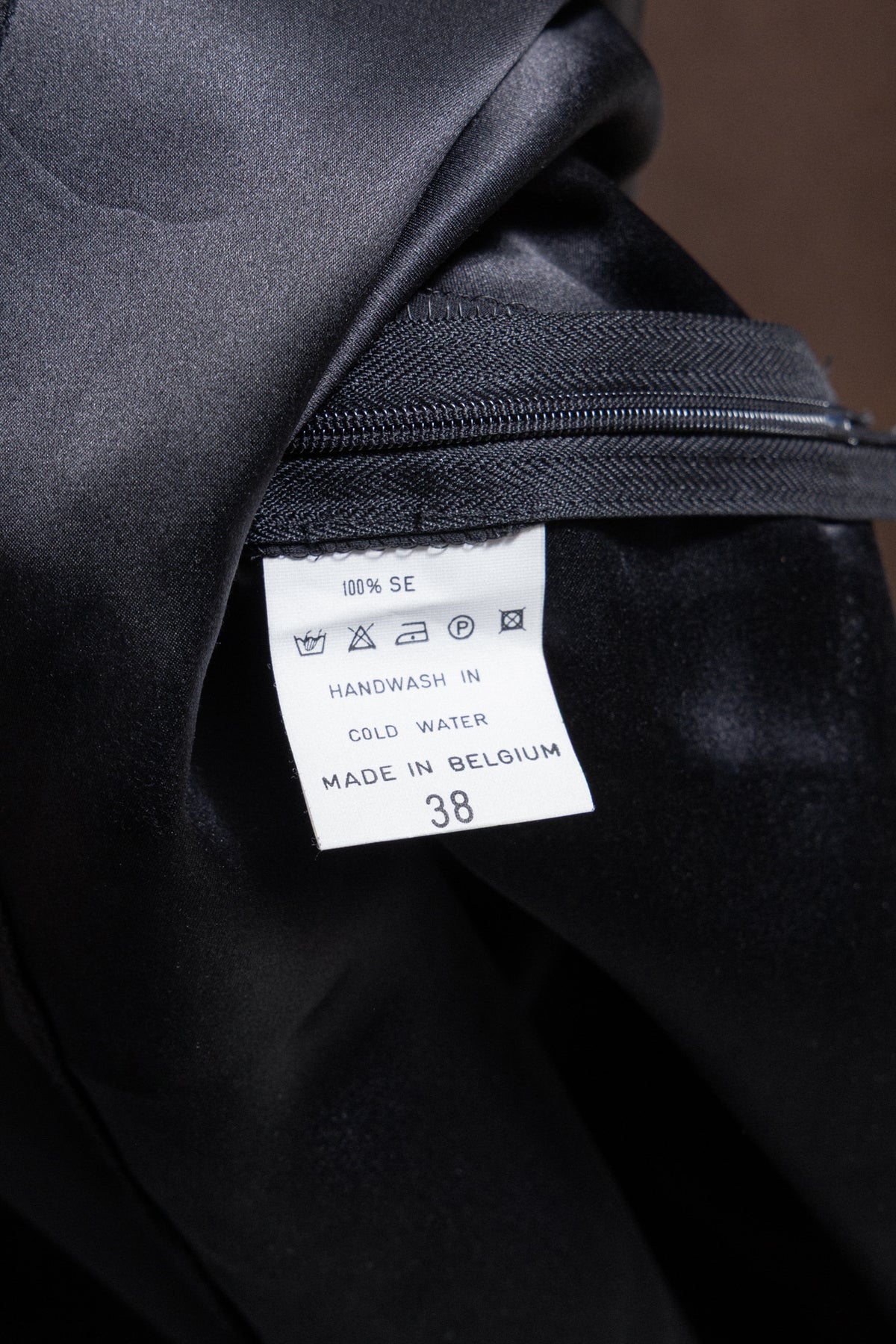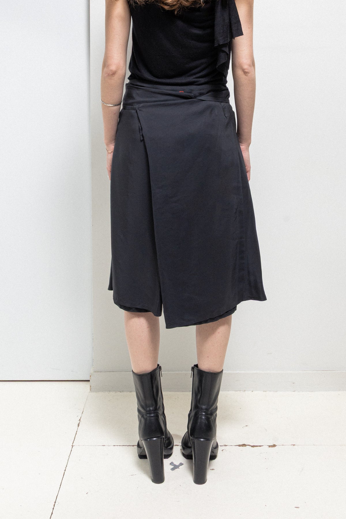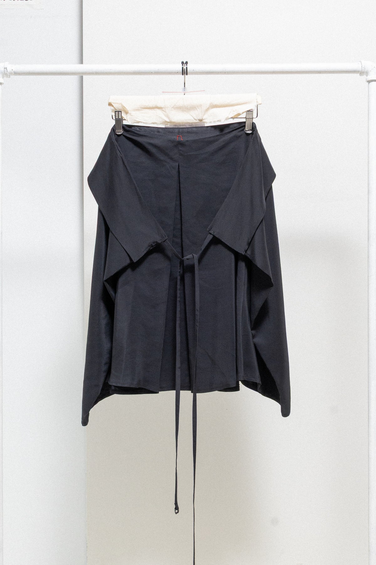 Beautiful midi length skirt made of a soft and lightweight silk fabric. Features wide side panels to wrap up at front thanks to thin and long straps, fastening like a belt with eyelets and metal buckle. Folded waist showing off the signature red cross on the back.