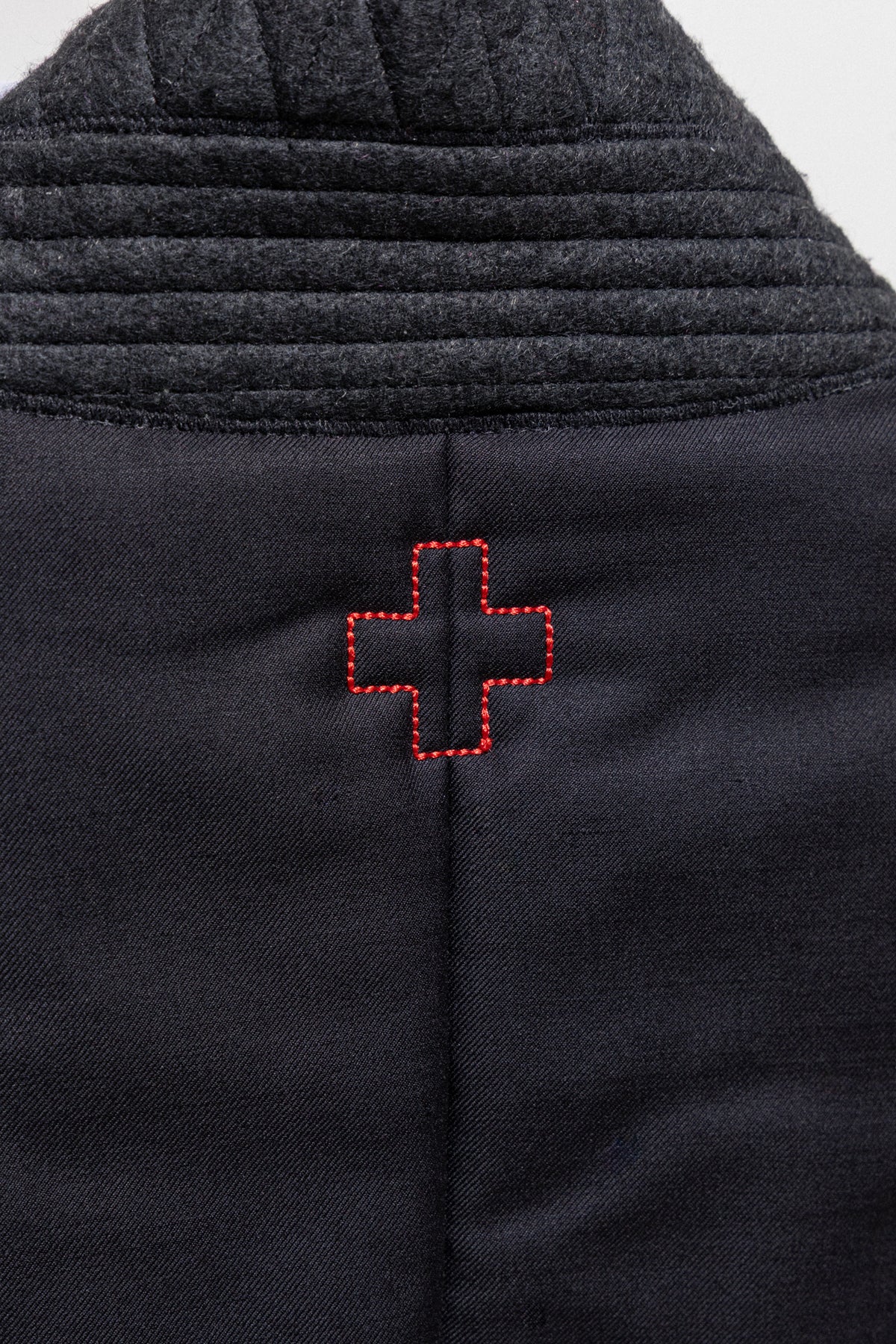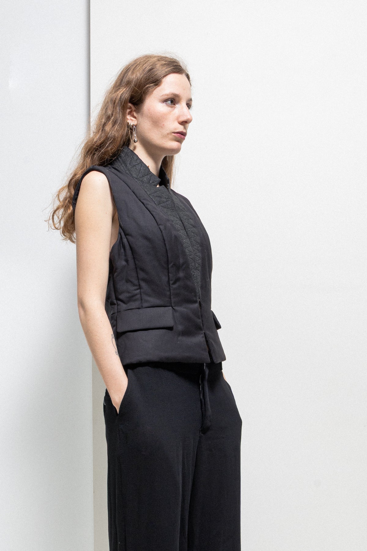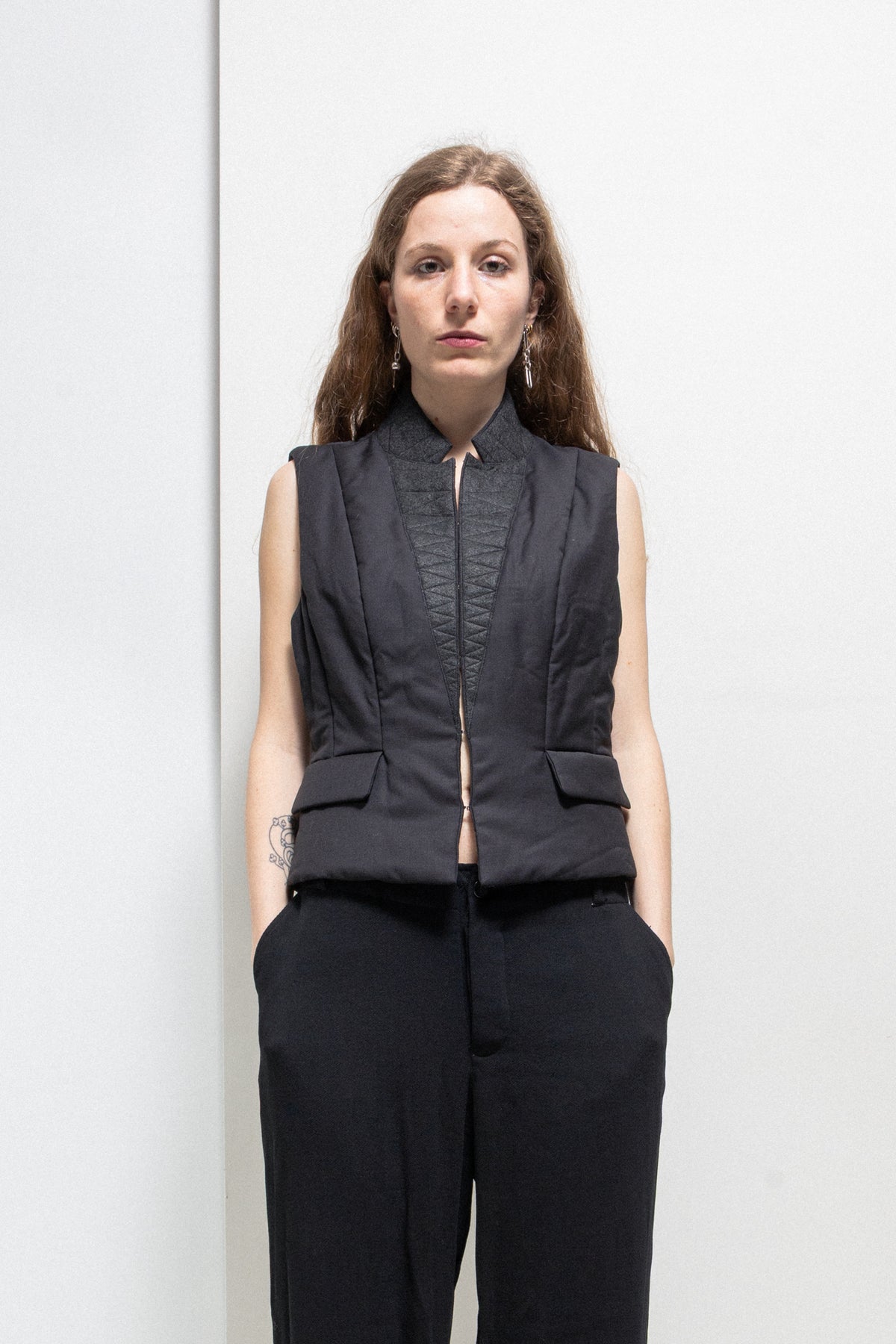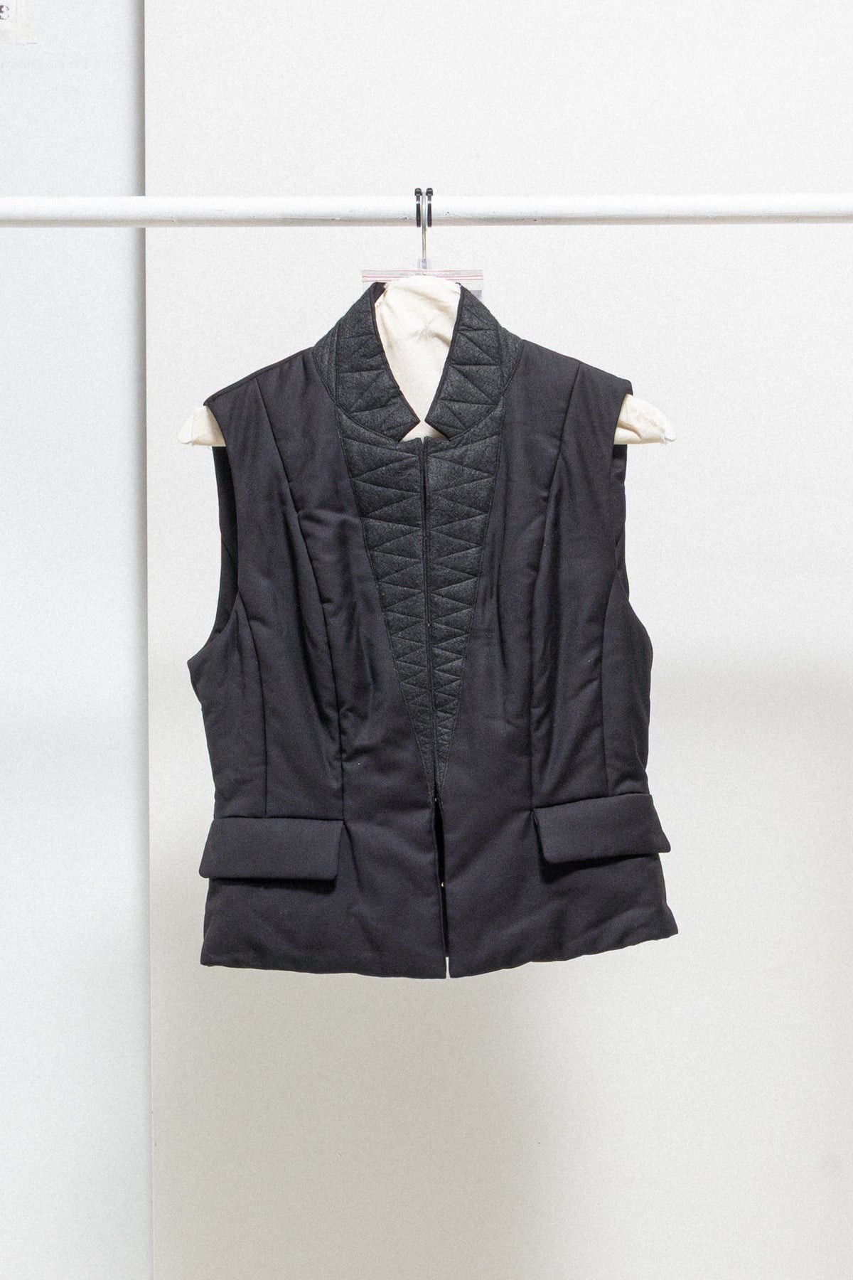Beautiful vest made of a padded wool blend, featuring a standing felted collar with seams details, as well as a corset like staple front closure. Small pockets each side.