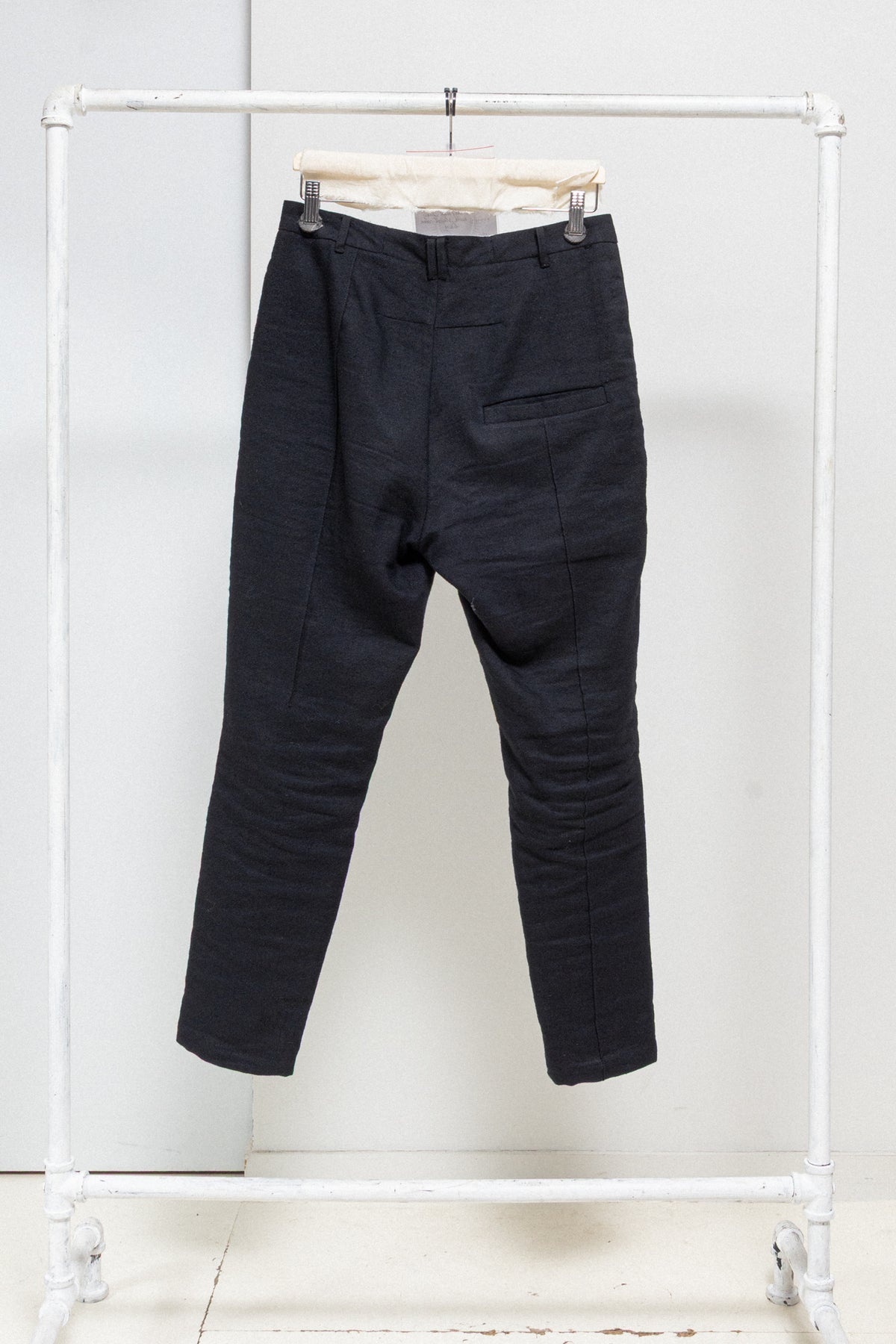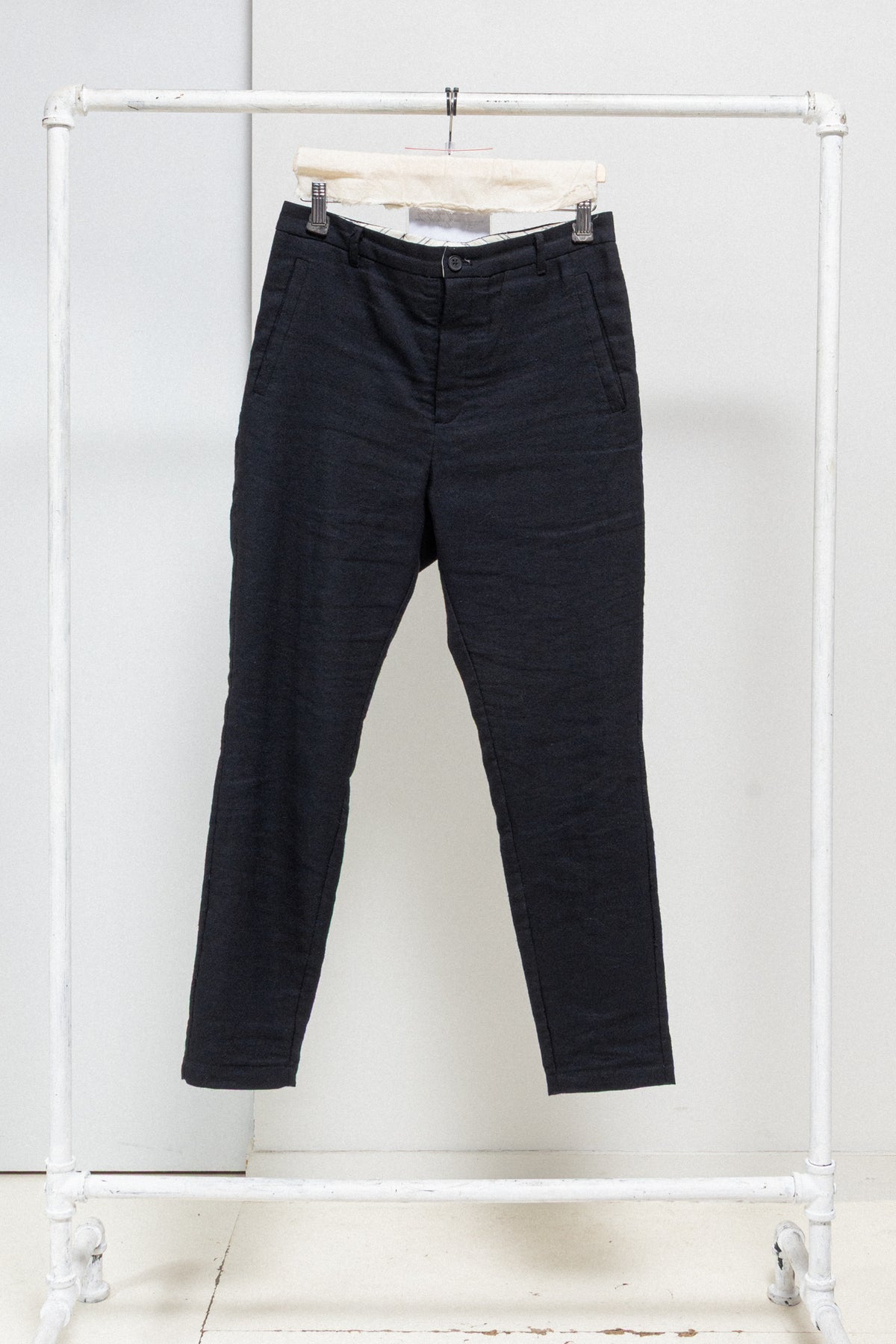 Fantastic pair of pants made of thick and textured cotton, wool and linen blended fabric, featuring a contrasting white lining with a striped pattern and piped pockets on the front of the legs. Front closure with four buttons including three hidden. Single back piped pocket and asymmetrically placed darted seams detail along the legs and on each side of the middle back seam. Belt loops.
