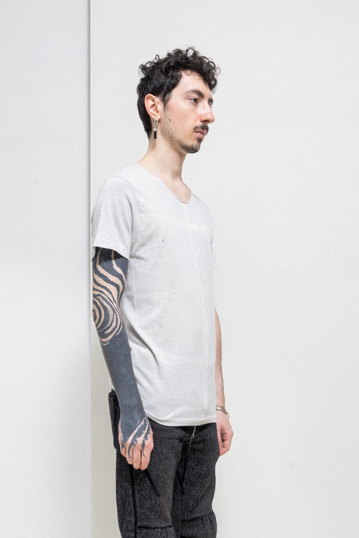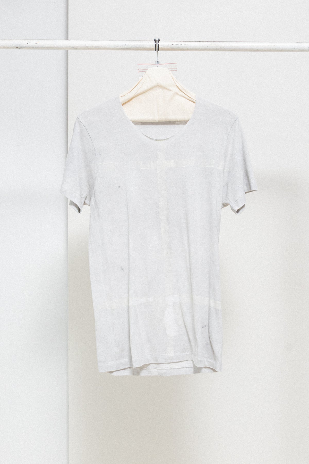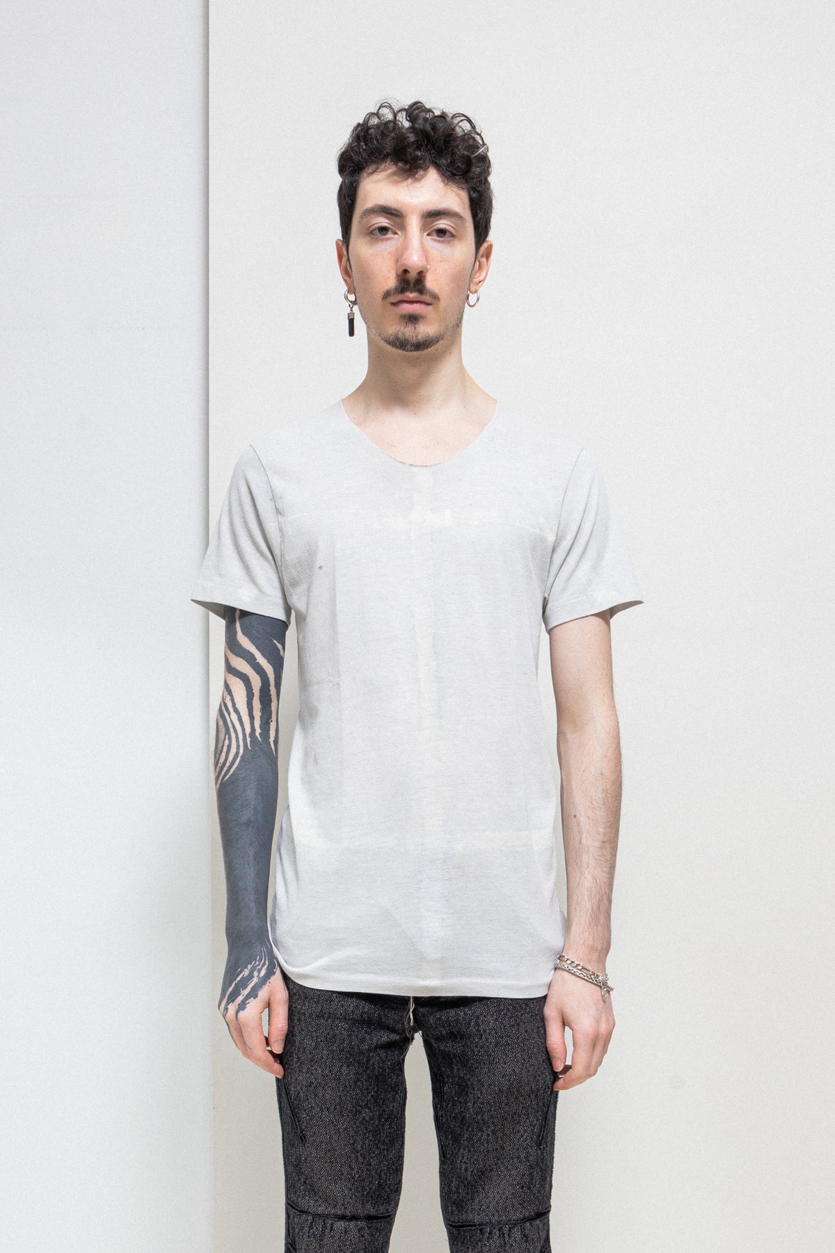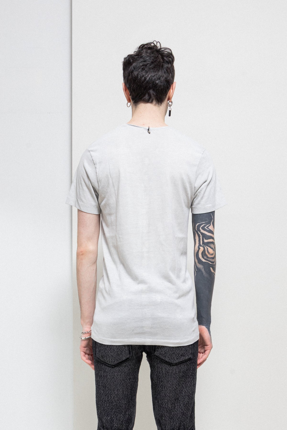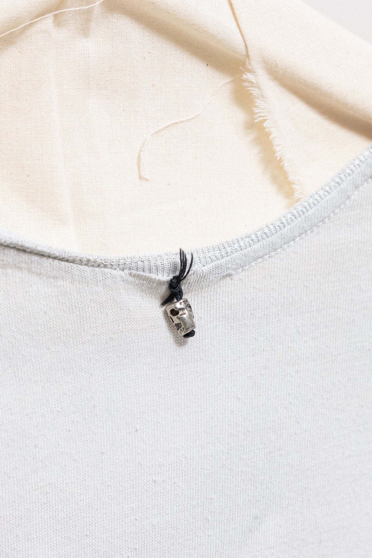 Beautiful light grey tee made of a soft and light cotton fabric, featuring a round neckline with edges left raw and hand painted lines in the front and back of the garment creating a cross shaped drawing. Silver skull pearl detail attached to the back of the neck.