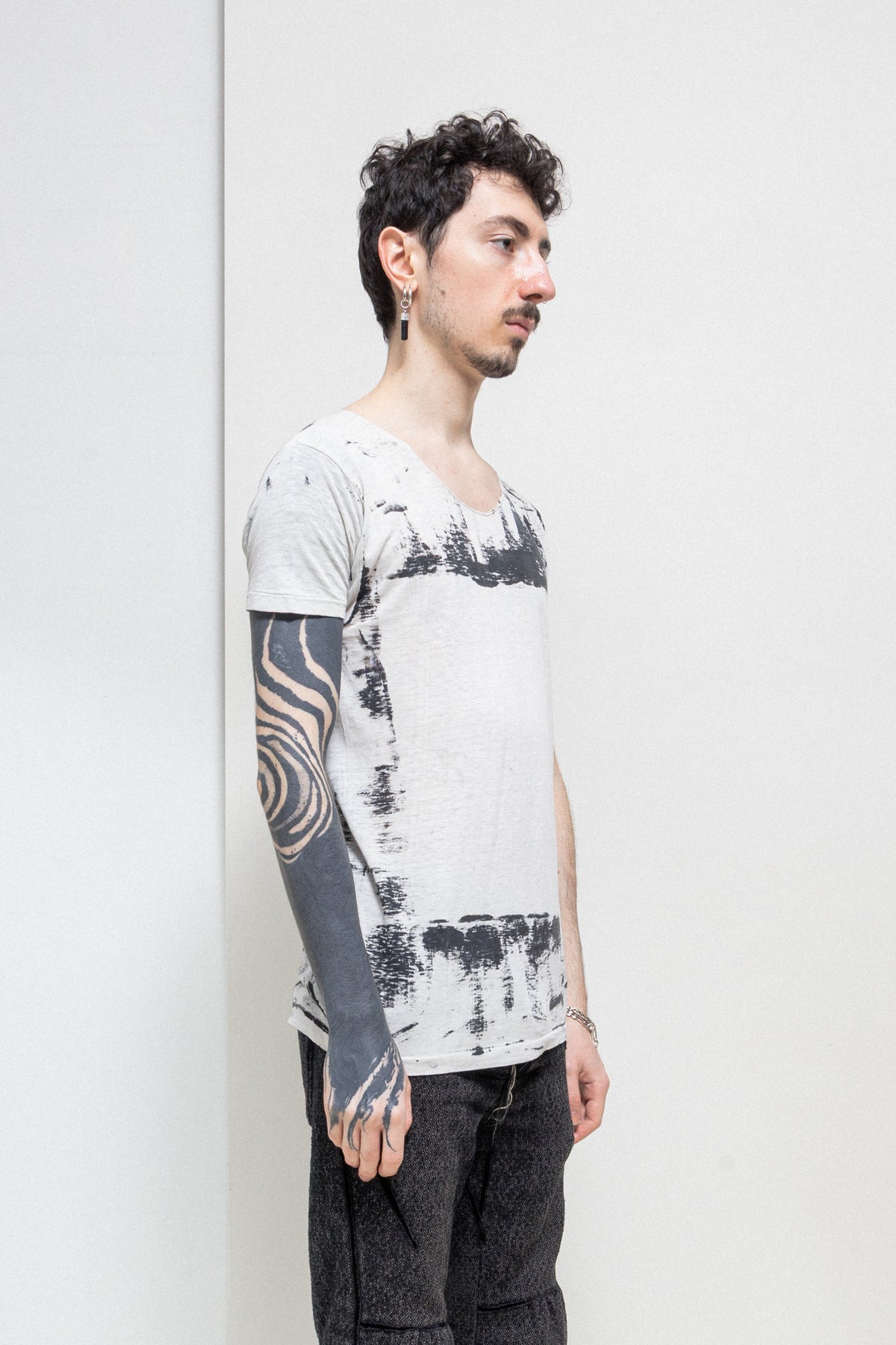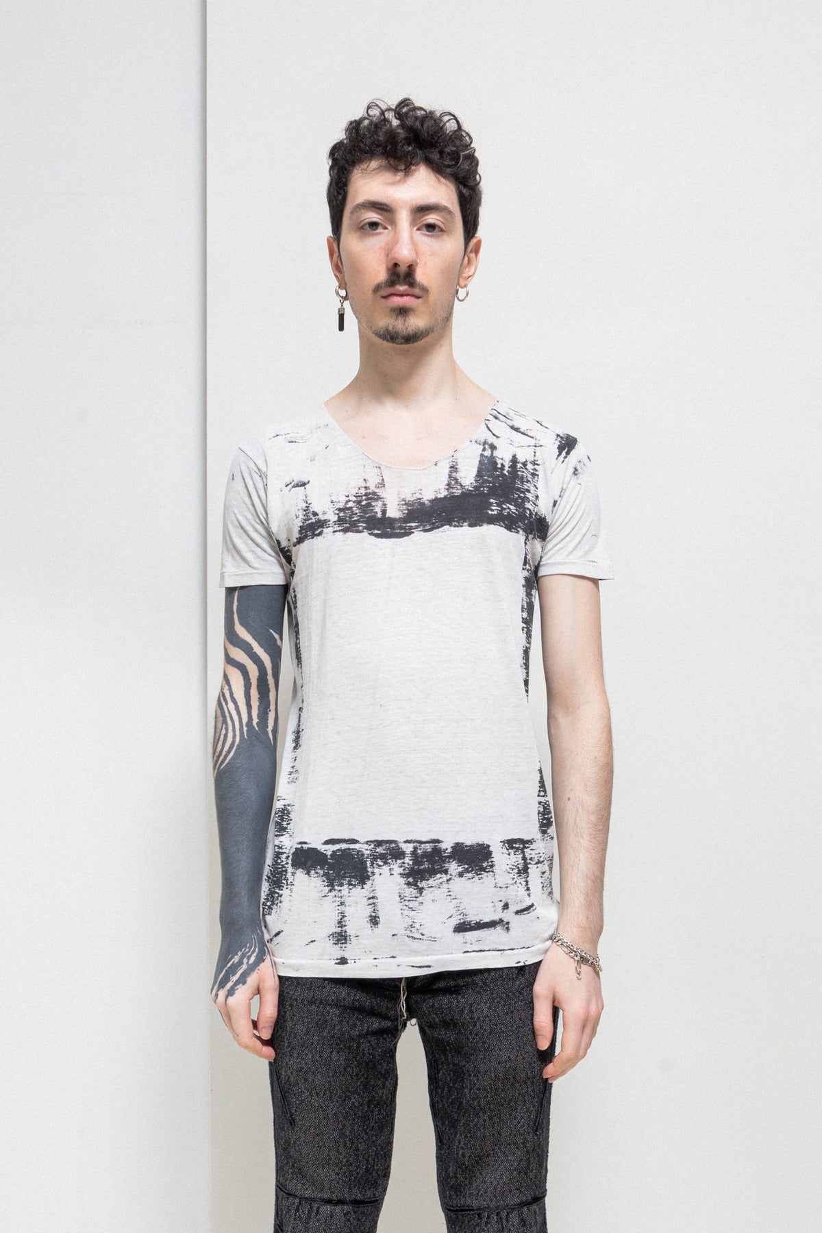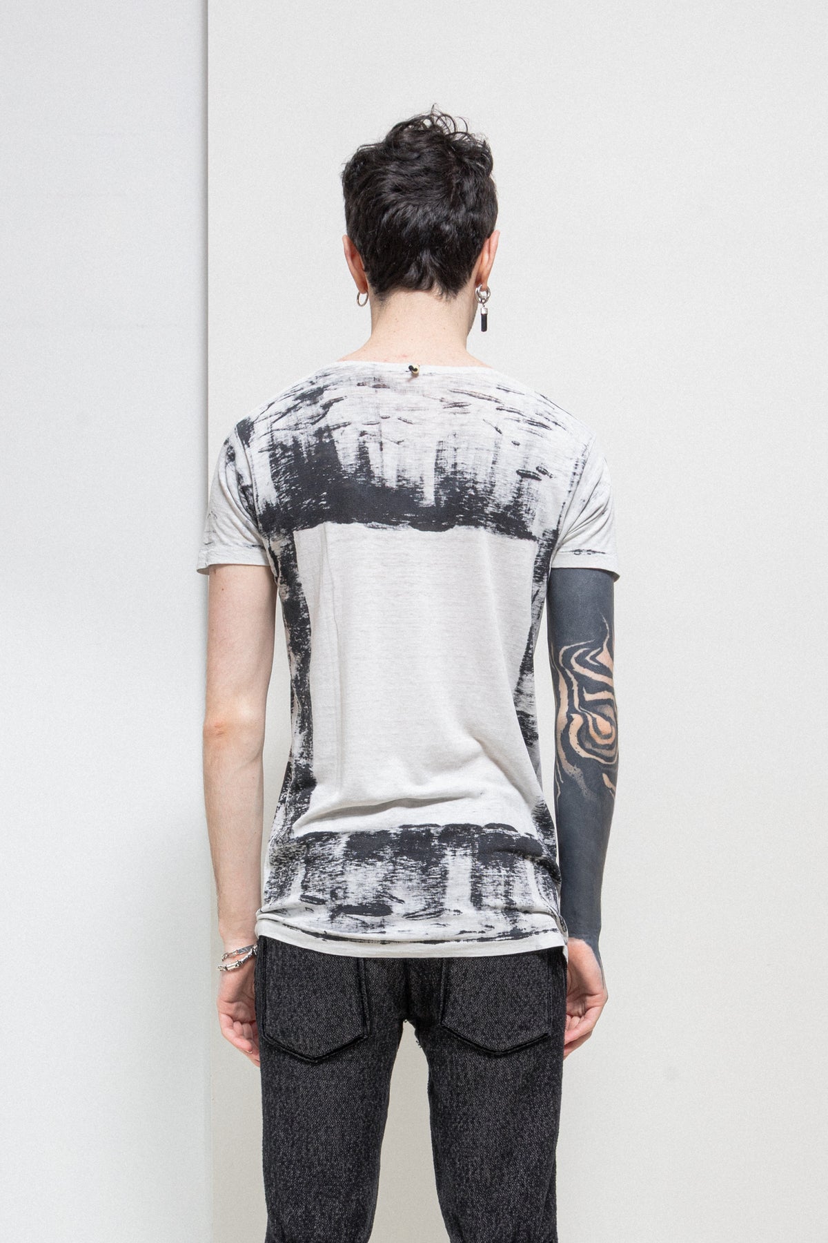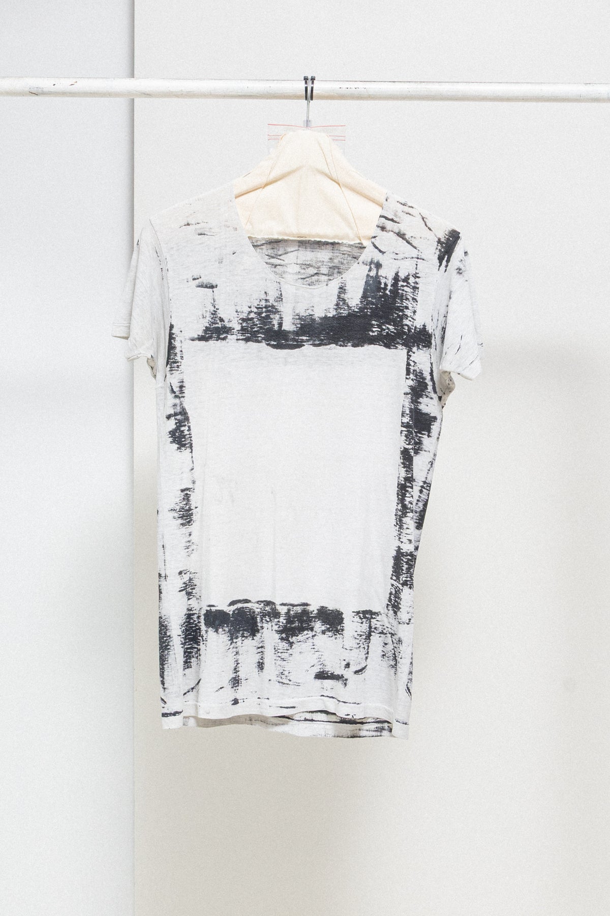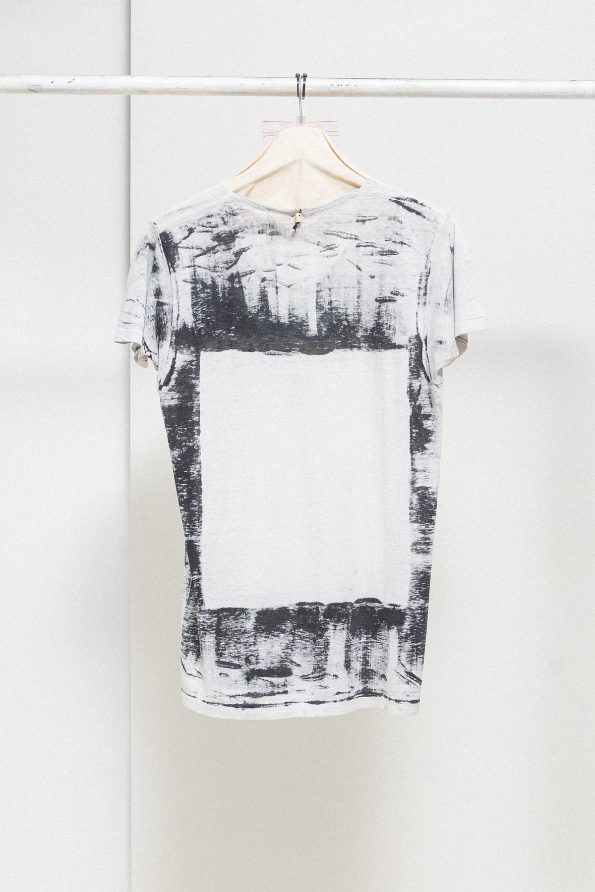 Amazing light grey tee made of a soft and light cotton fabric, featuring a round raw neckline and black abstract hand painted details with an empty square shaped frame in the front and back of the garment. Cream skull pearl detail on the back of the neck.