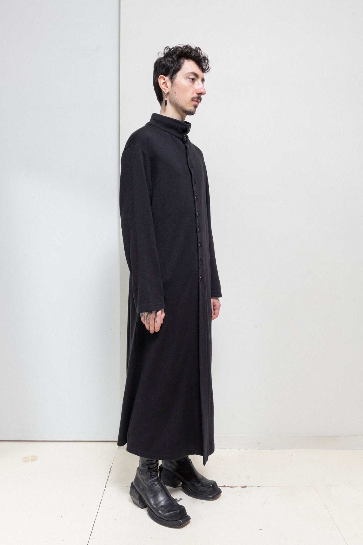 Beautiful black robe made of soft wool fabric, featuring a standing neck collar with a front closure and eleven buttons. Extra-long length. No lining.