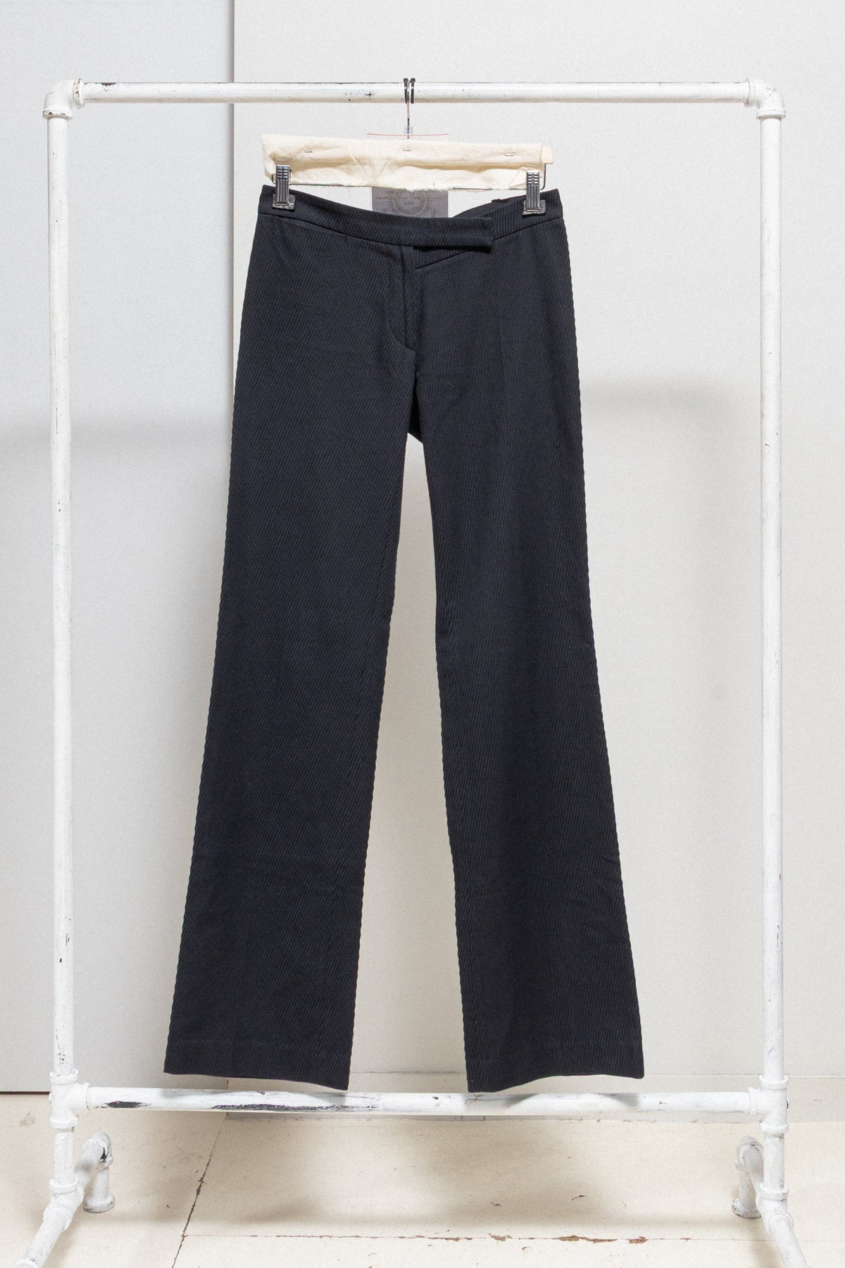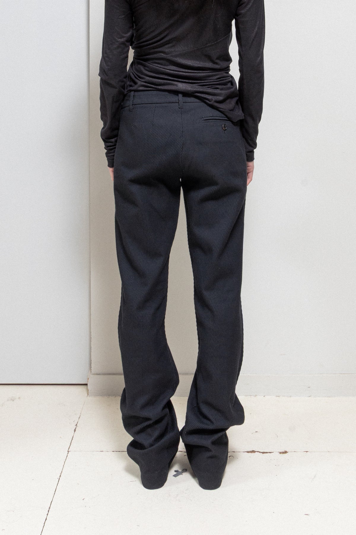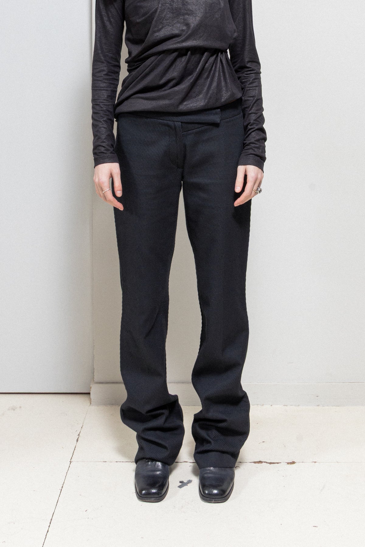Amazing pair of flared pants made of a detailed ribbed cotton fabric, featuring an asymmetrical waist belt and a crossing front closure with a staple and a zipper. Single front seam pocket under the belt. Back darts. Single back piped pocket with a button. Long legs length.