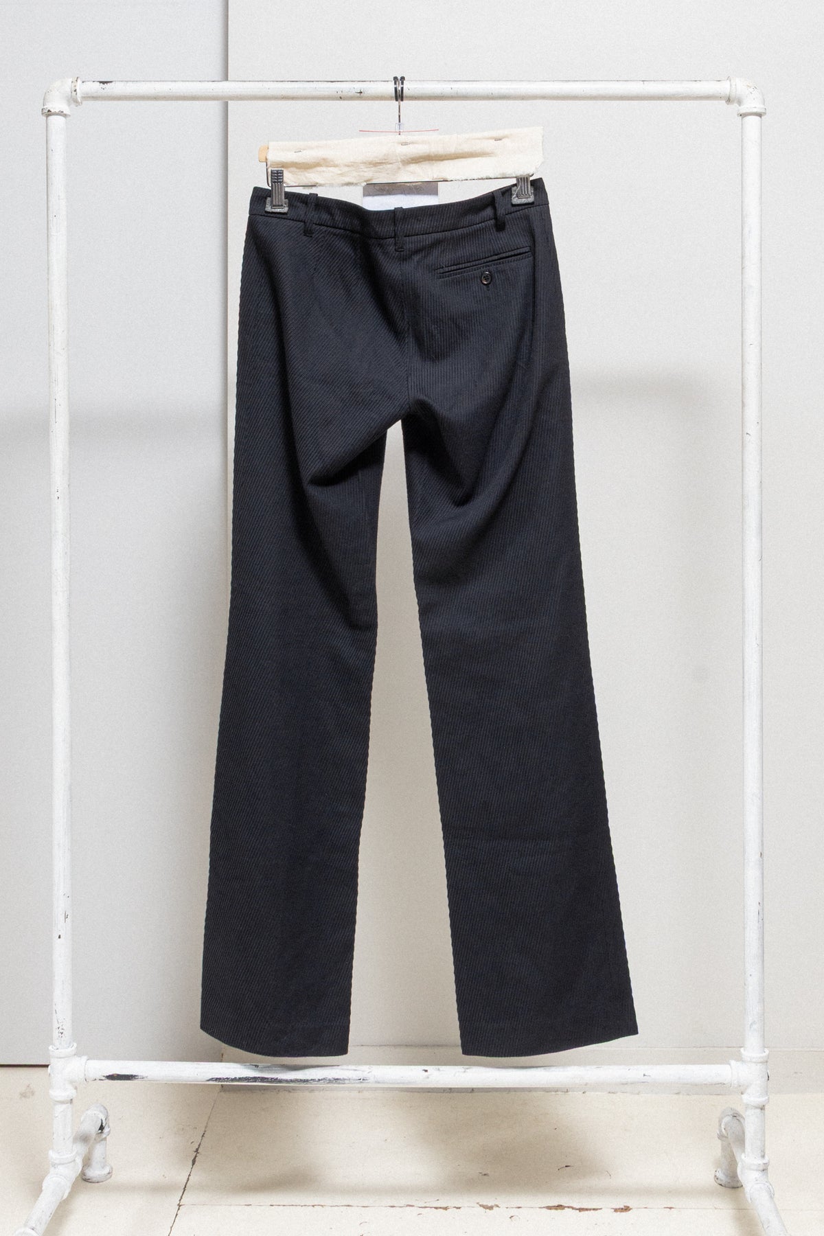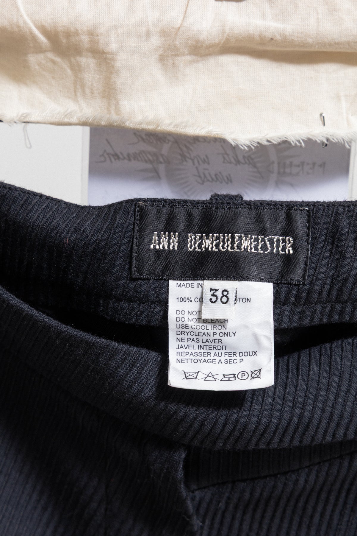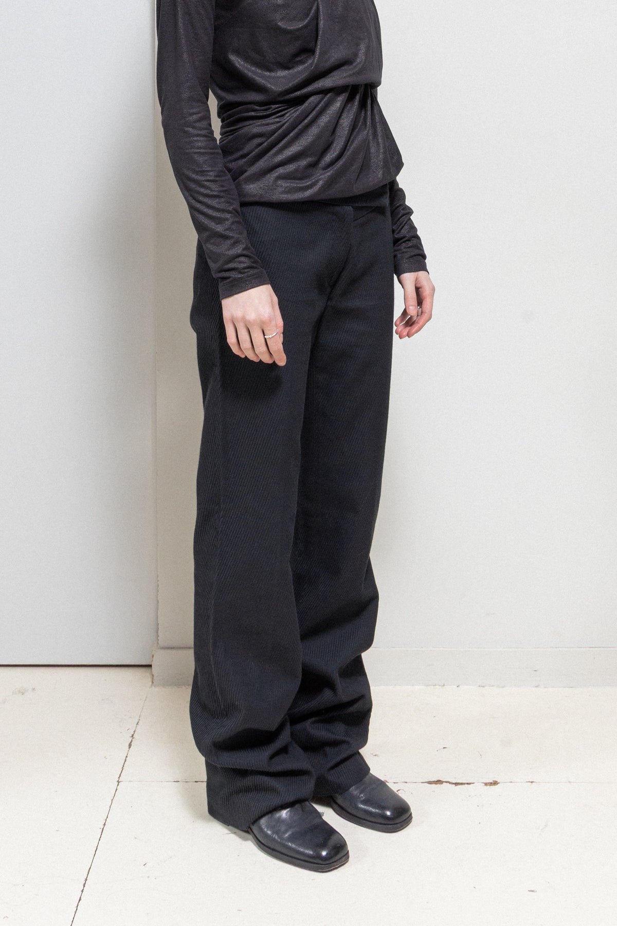 Amazing pair of flared pants made of a detailed ribbed cotton fabric, featuring an asymmetrical waist belt and a crossing front closure with a staple and a zipper. Single front seam pocket under the belt. Back darts. Single back piped pocket with a button. Long legs length.
