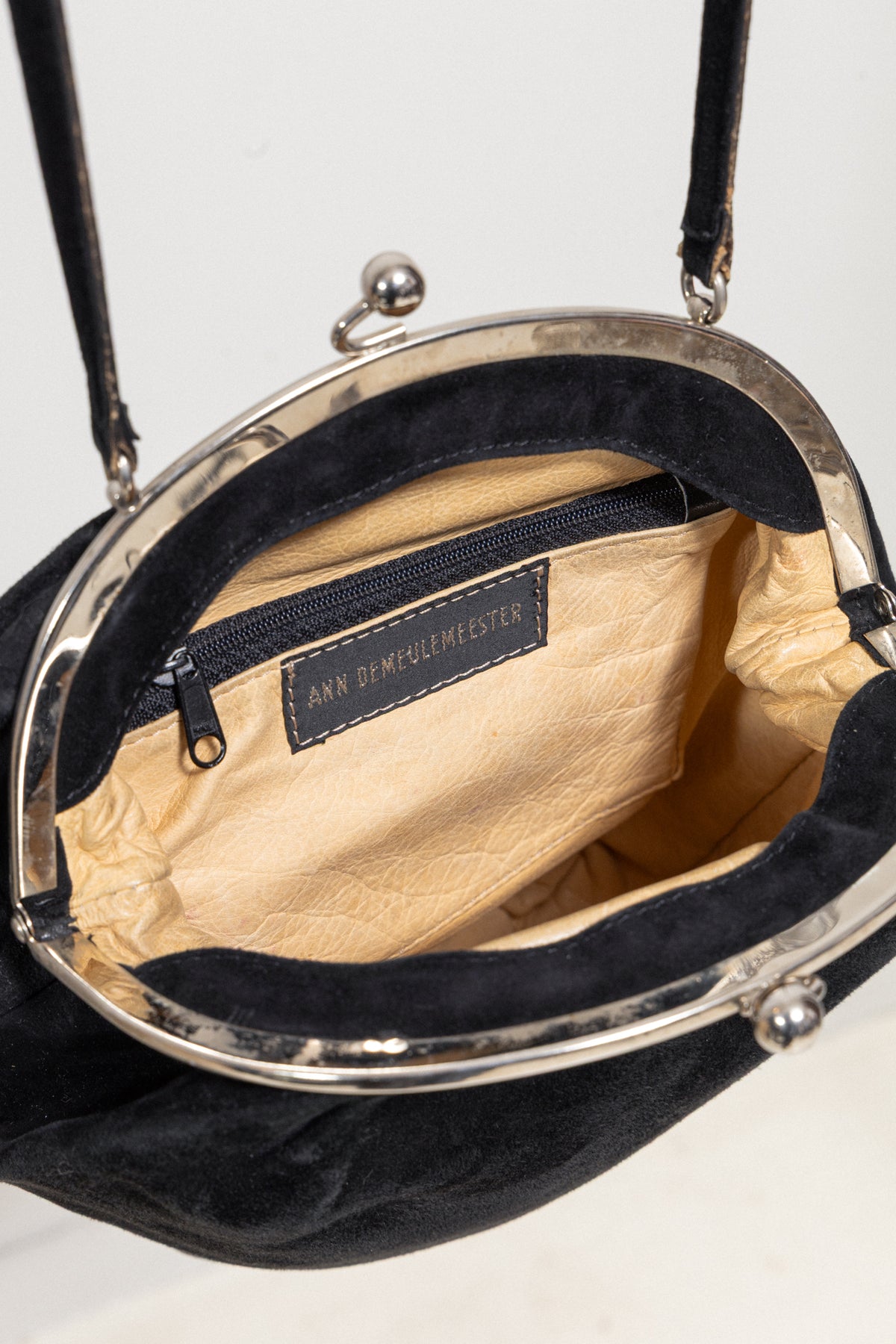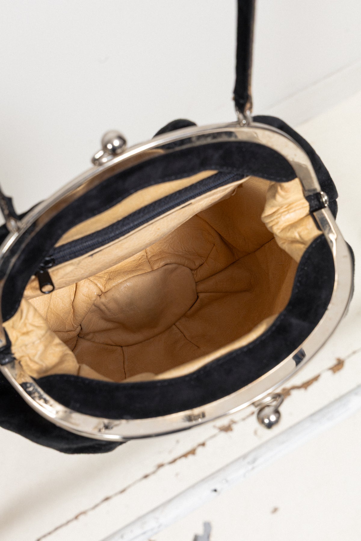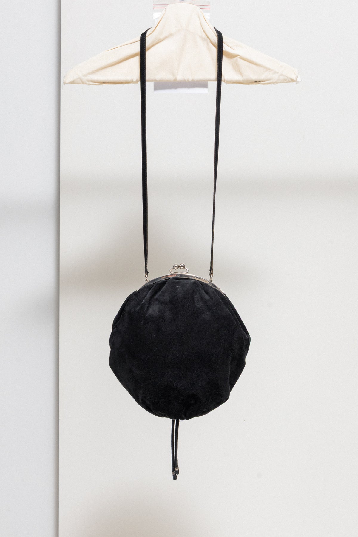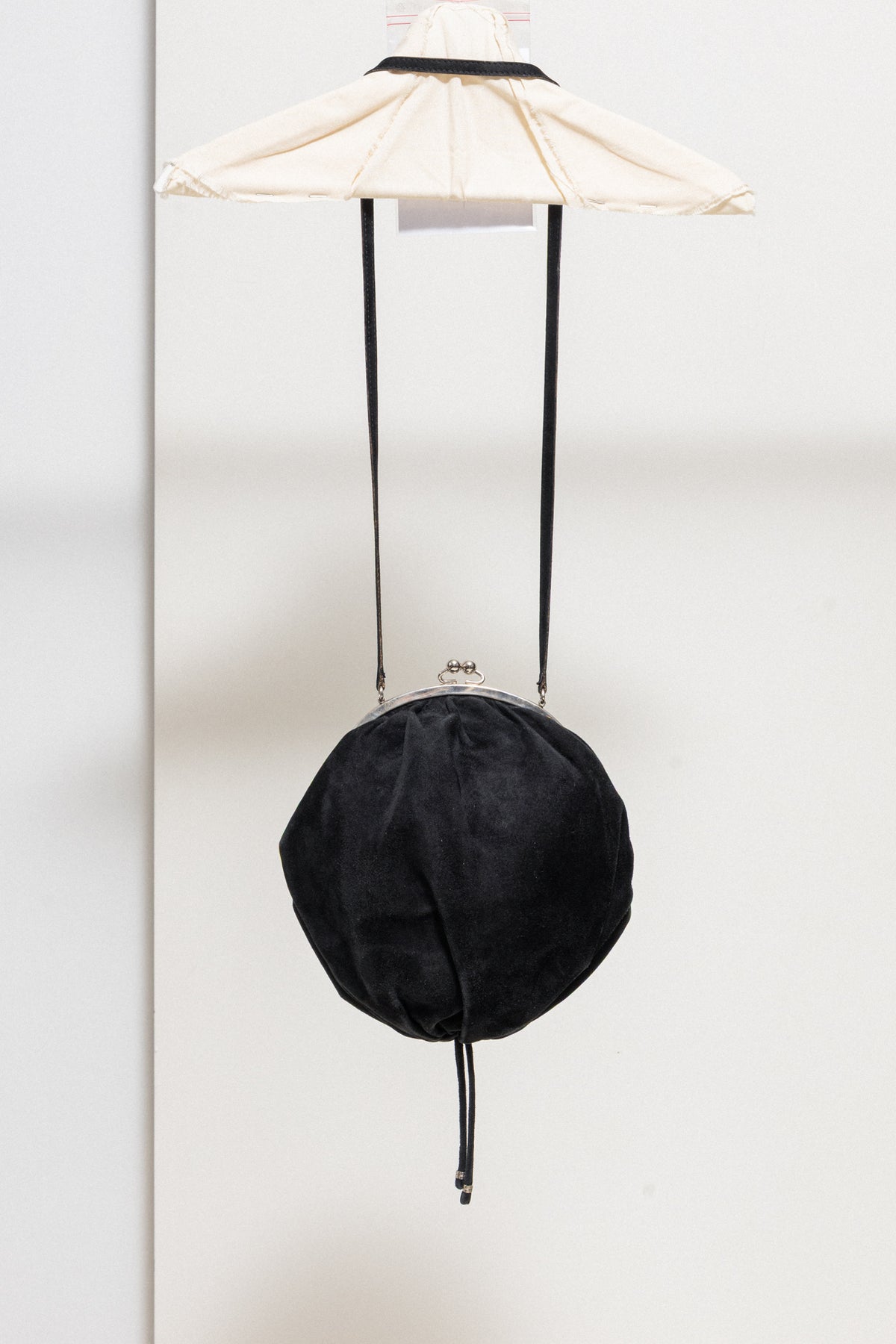 Amazing round bag made of soft suede leather with a velvet feeling, featuring a single leather shoulder strap and a purse like metal closure. Leather strings details under the item with metal rings. Zip up pocket on the inside.