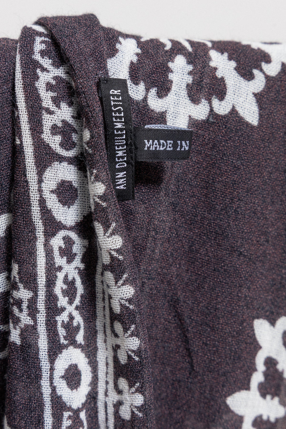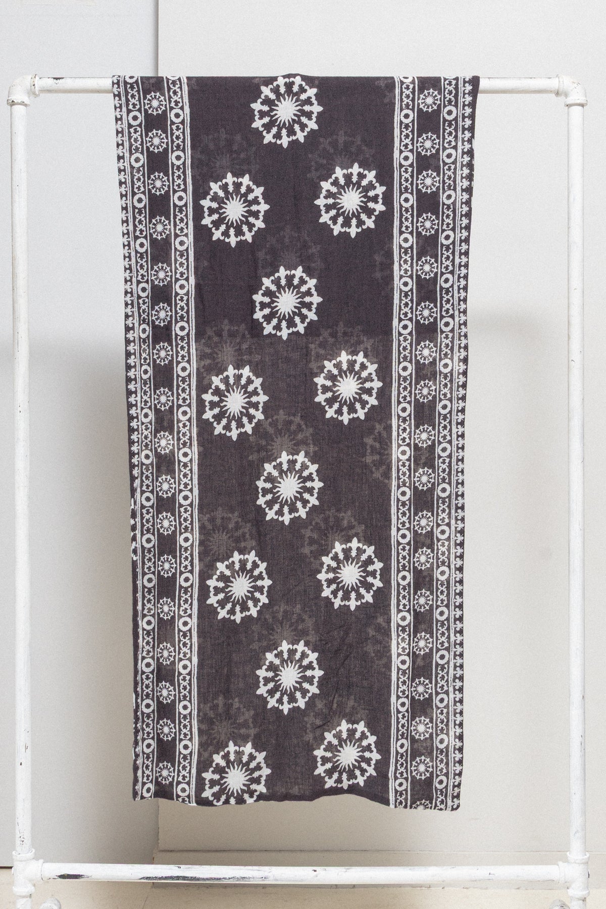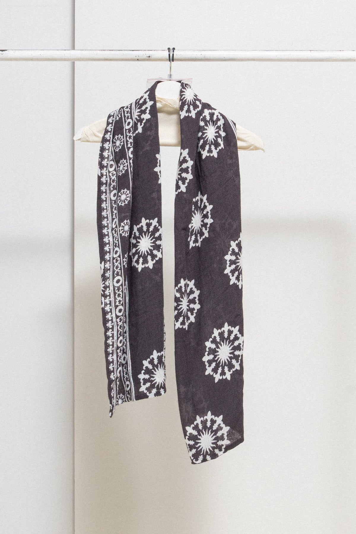 Fantastic dark brown scarf made of a light and soft fabric, featuring white detailed sun patterns surrounded by fleur-de-lis motifs. Pretty long and wide.