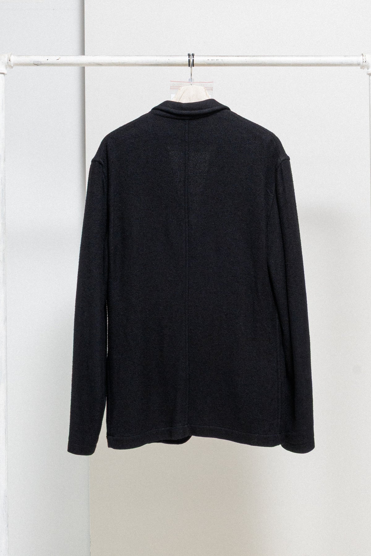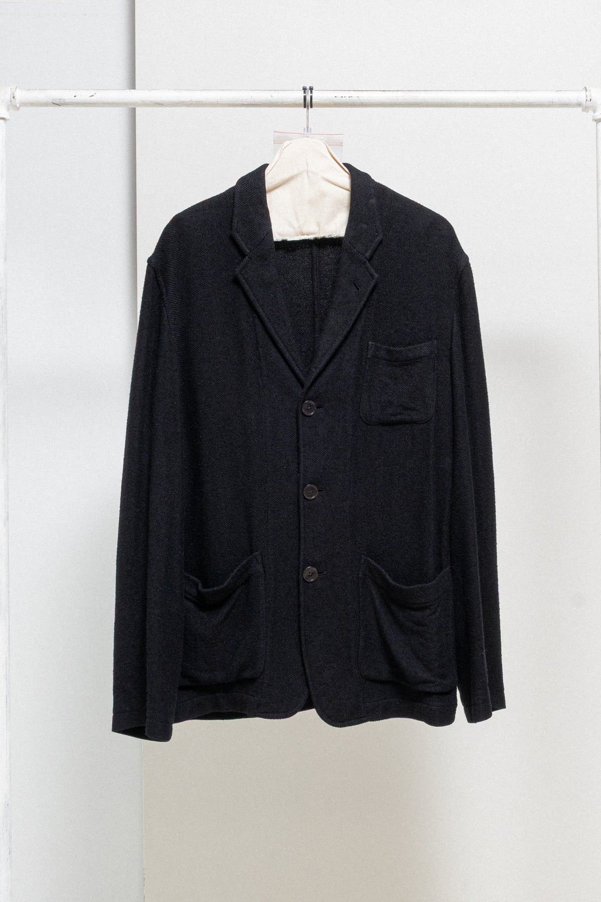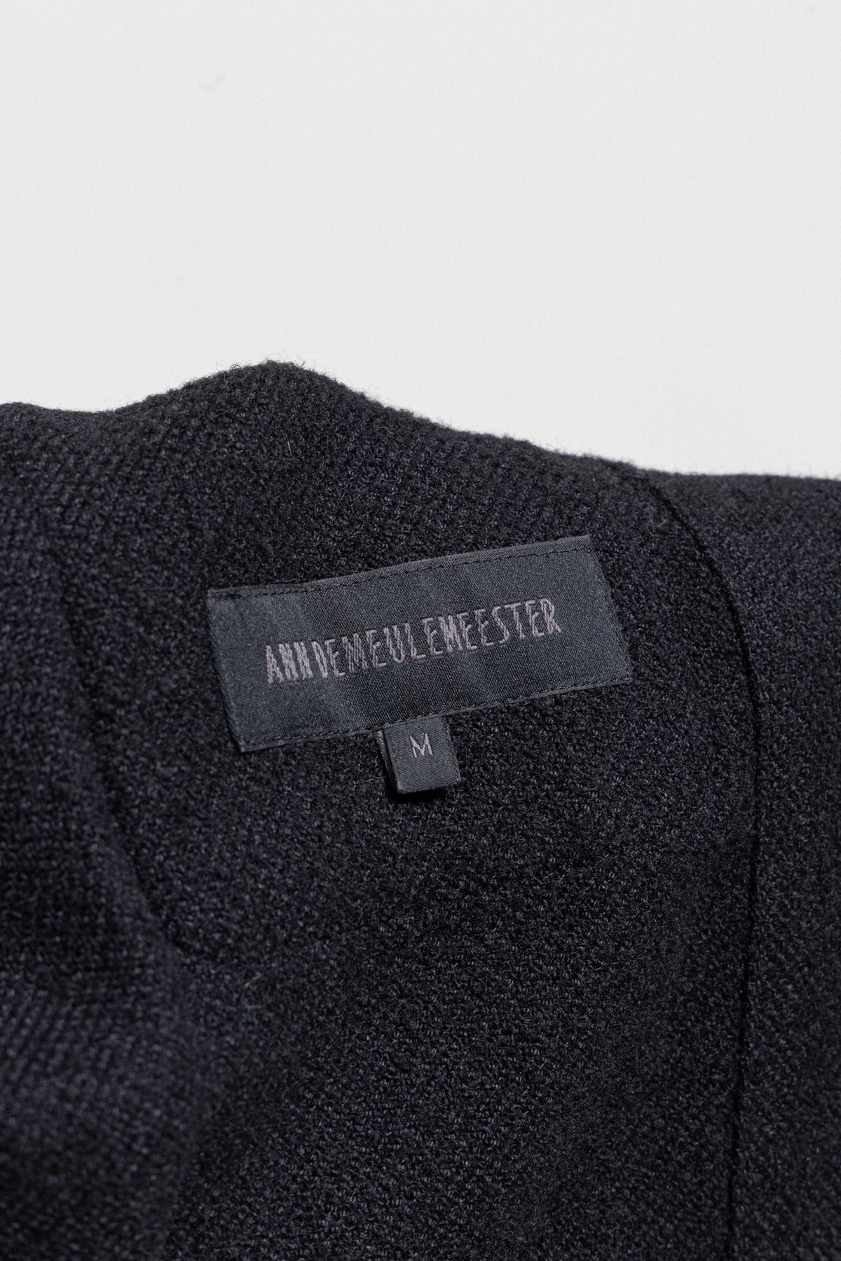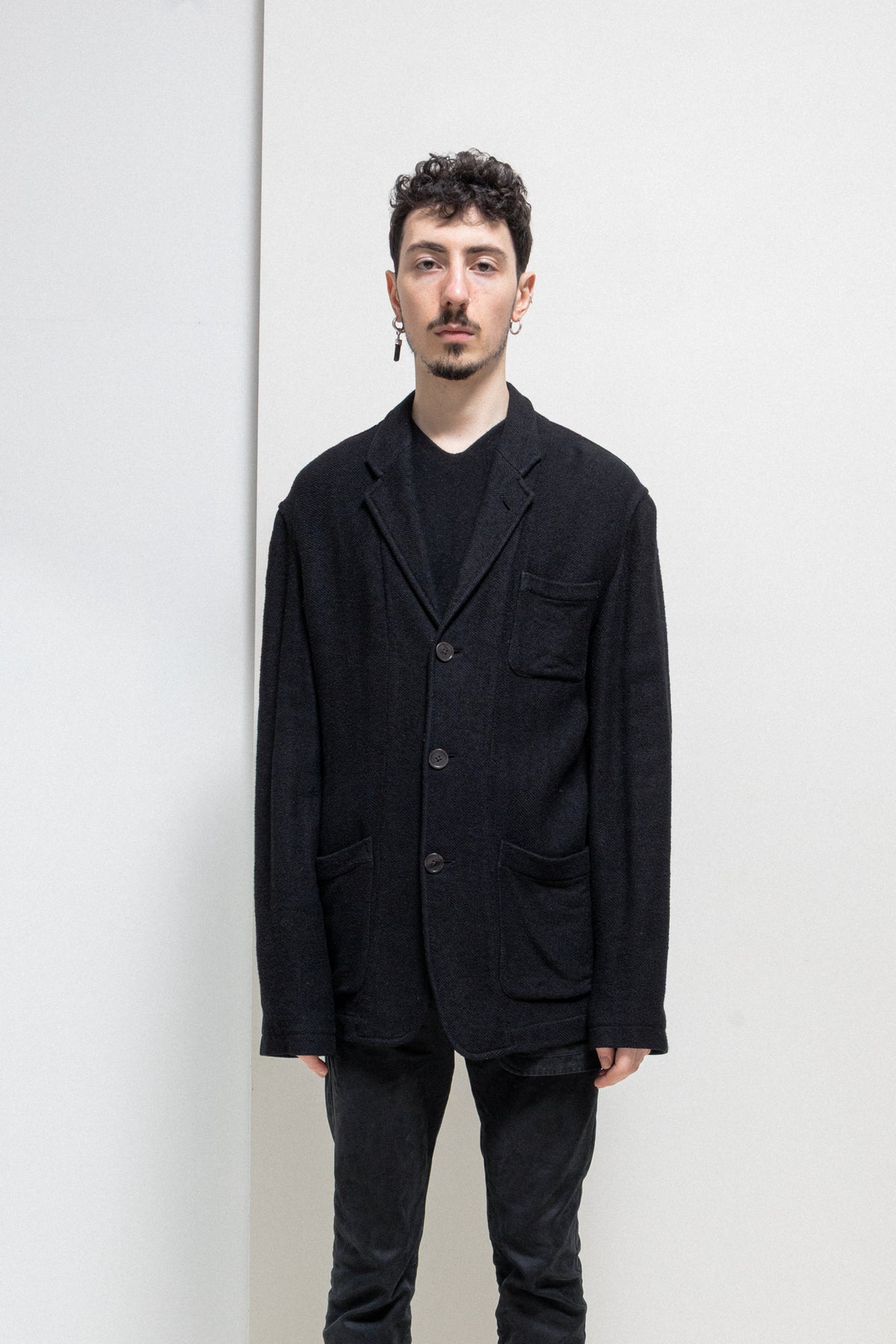 Beautiful black jacket made of soft wool fabric, featuring a regular tailor collar and front loose flat pockets. Front closure with three buttons. Ribbed seams. No body lining. Contrasting white sleeves lining with faded letters print over it.
