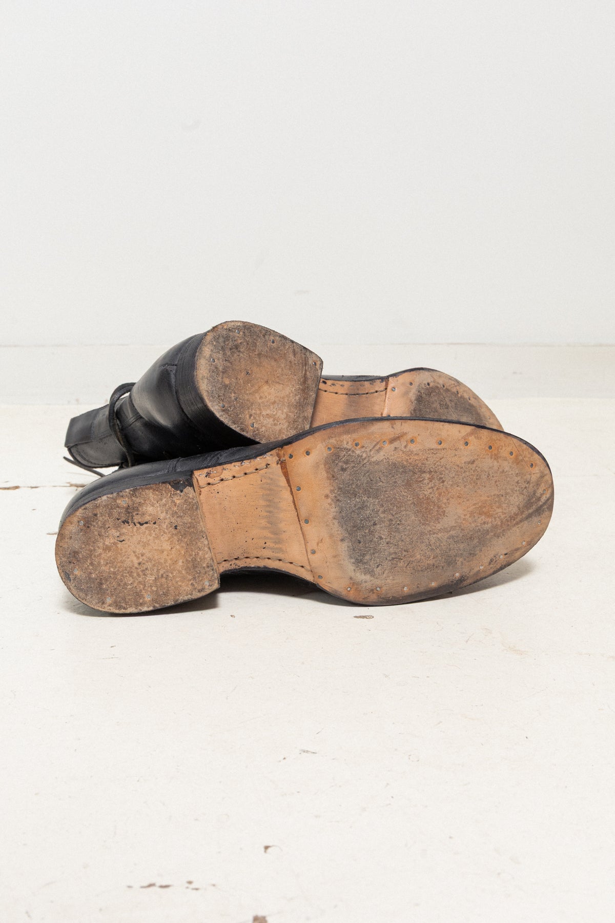 Incredible black pair of boots made of textured leather, featuring a arched foot shape and leather laces with round tips. Nailed outsole. Oval toe shaped area. Front closure with five pairs of eyelets. Goes above the ankle lengthwise.